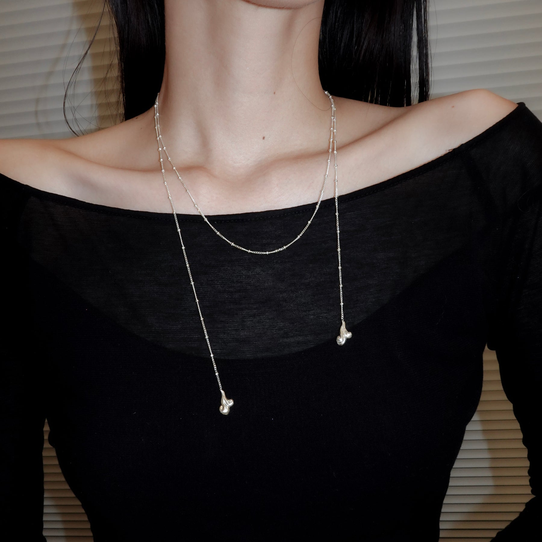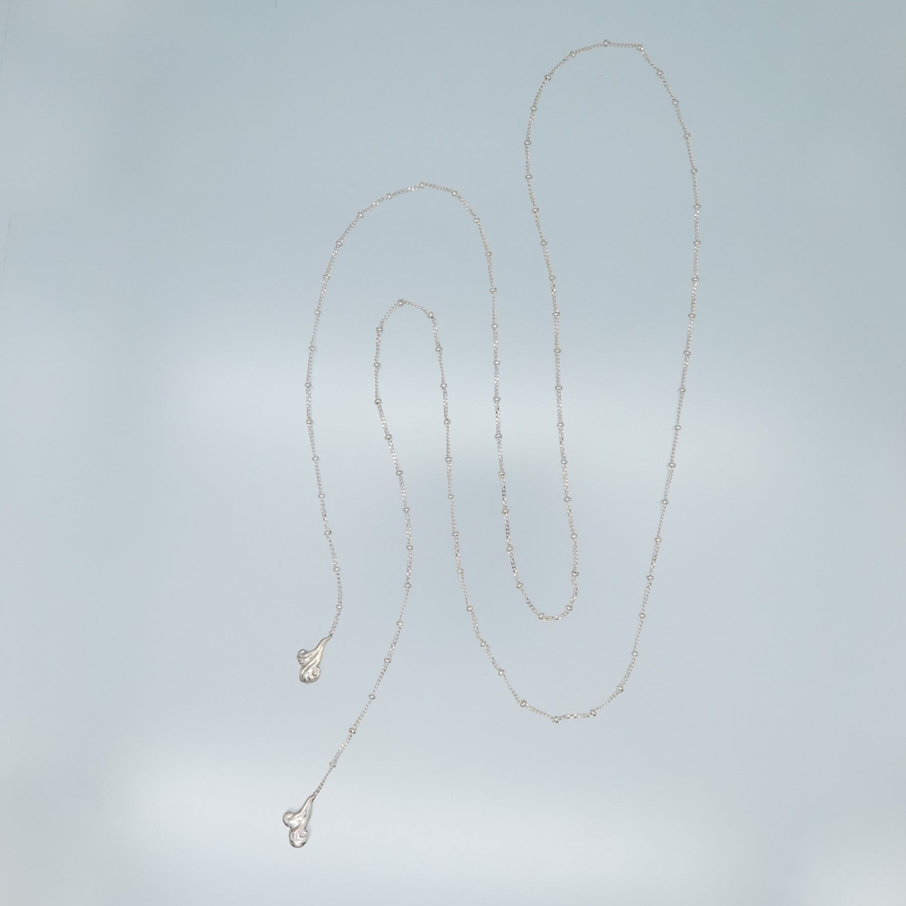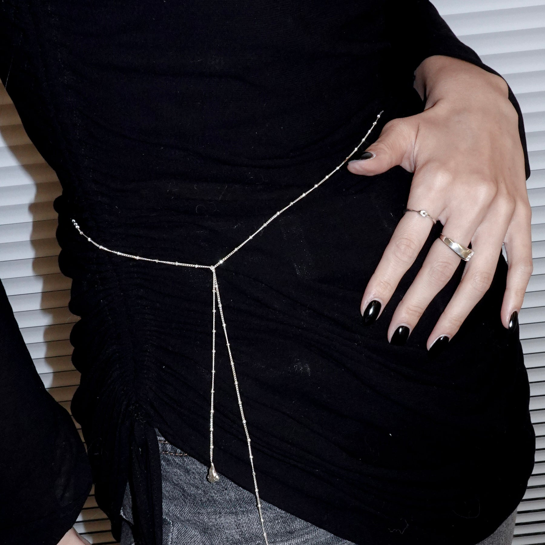 ネックレスだけでなく、ウエストに巻いてお使いいただくことも可能です。ウエストにつける際は結び目の部分で2回折り返すことを推奨しております。