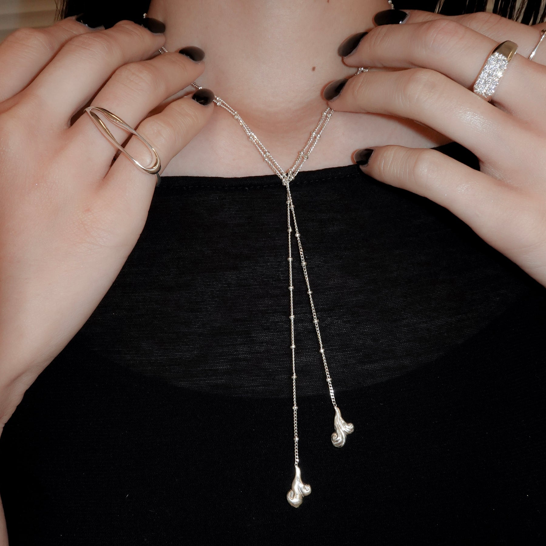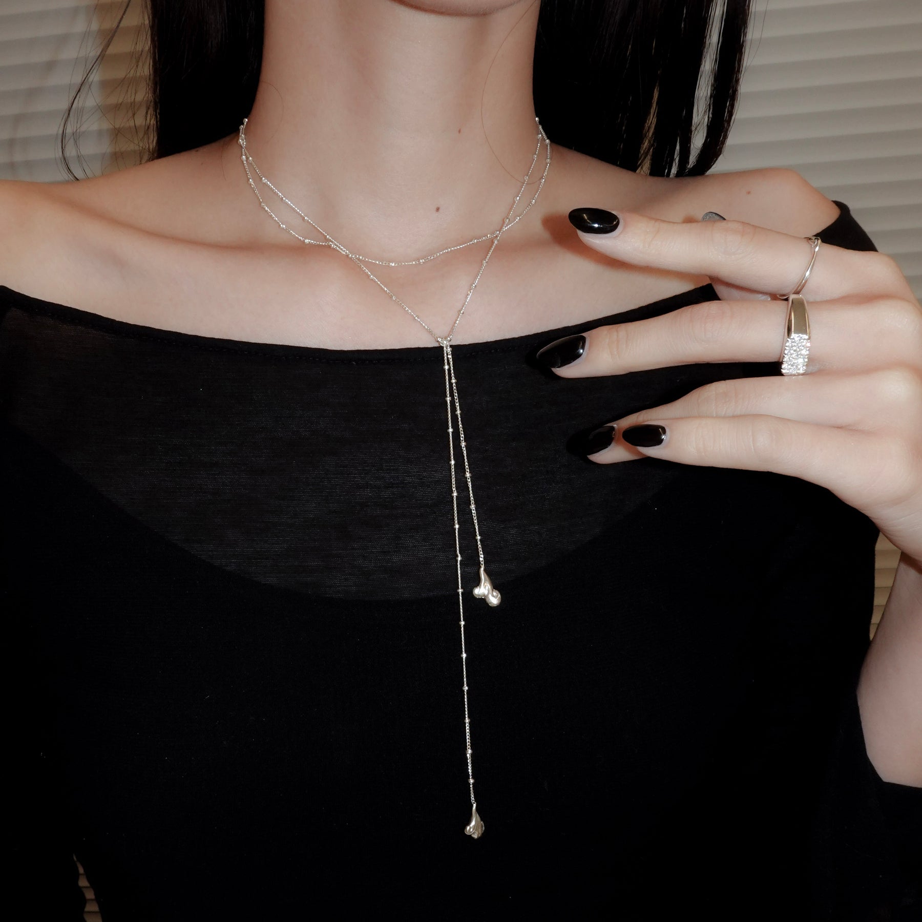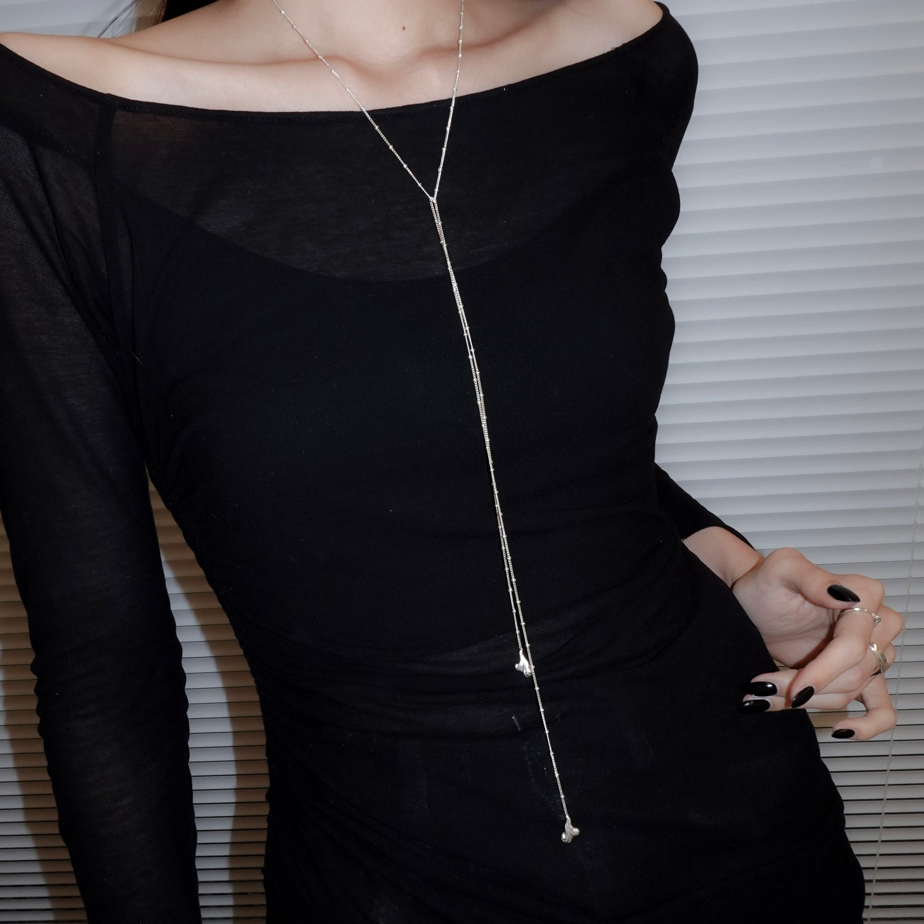 ネックレスだけでなく、ウエストに巻いてお使いいただくことも可能です。ウエストにつける際は結び目の部分で2回折り返すことを推奨しております。