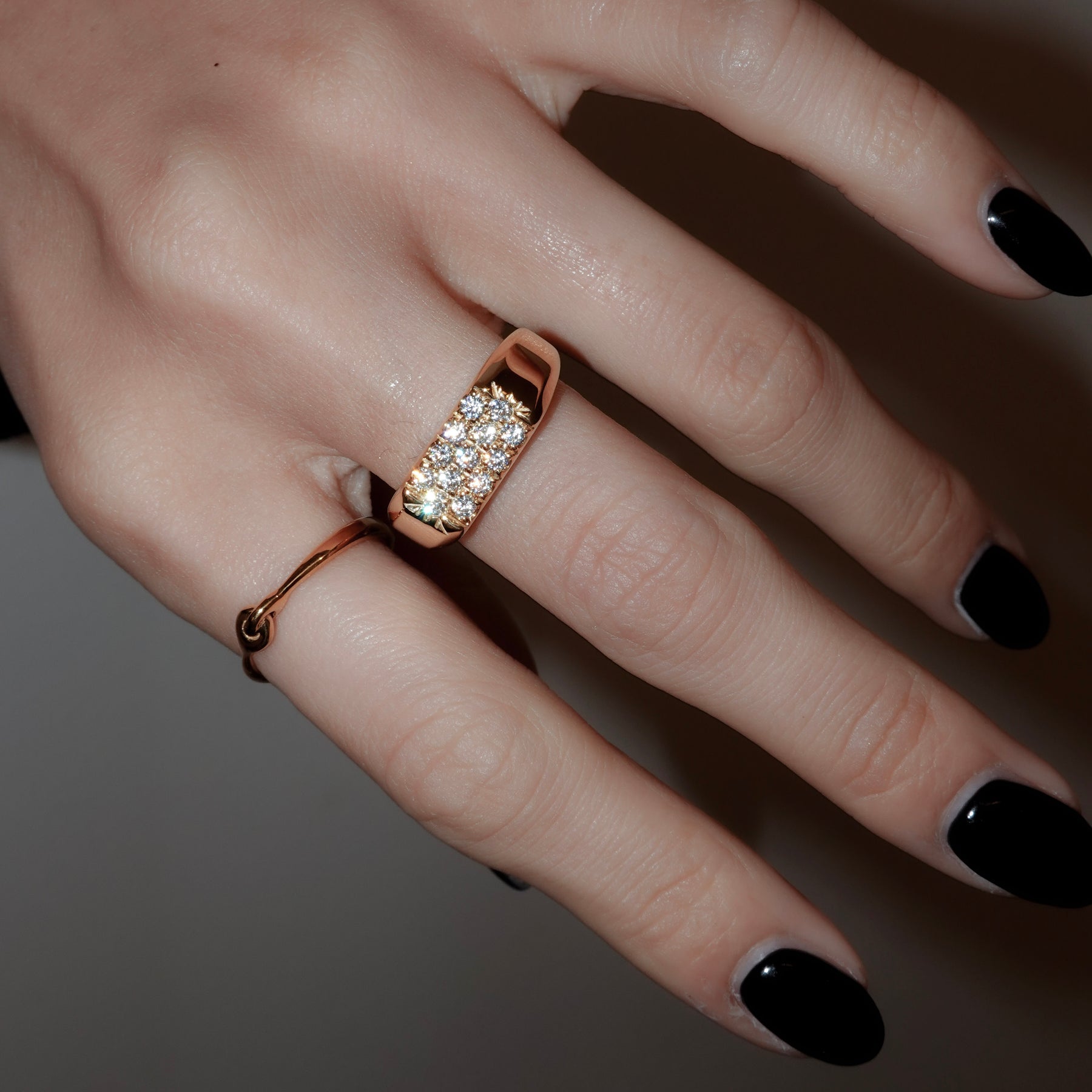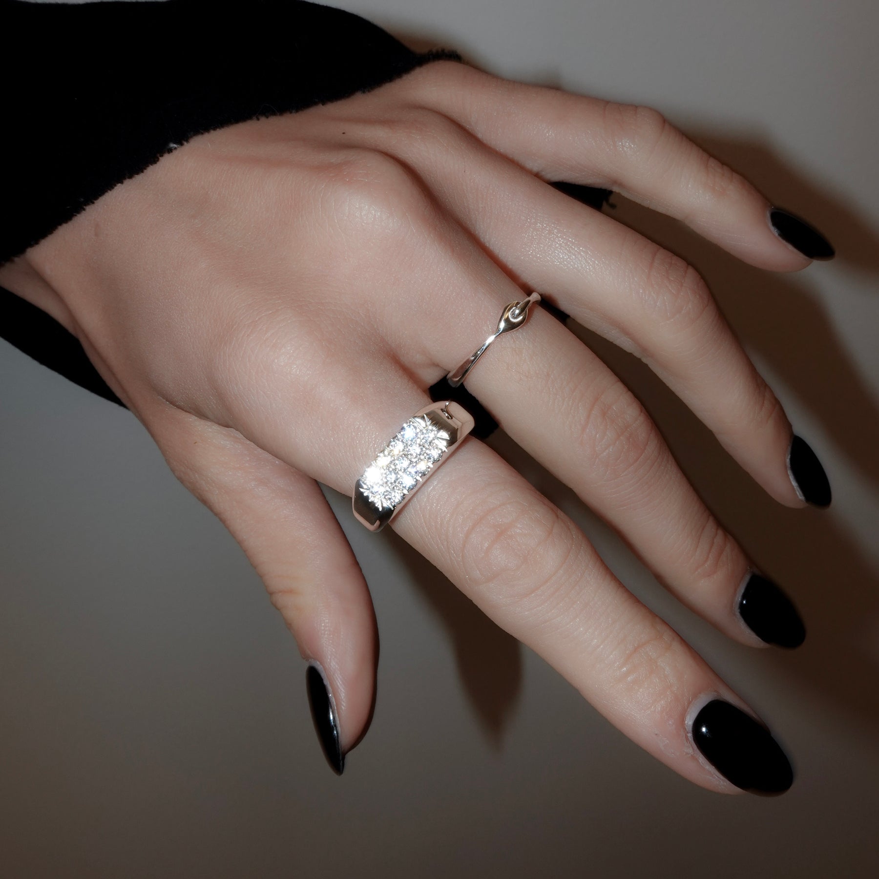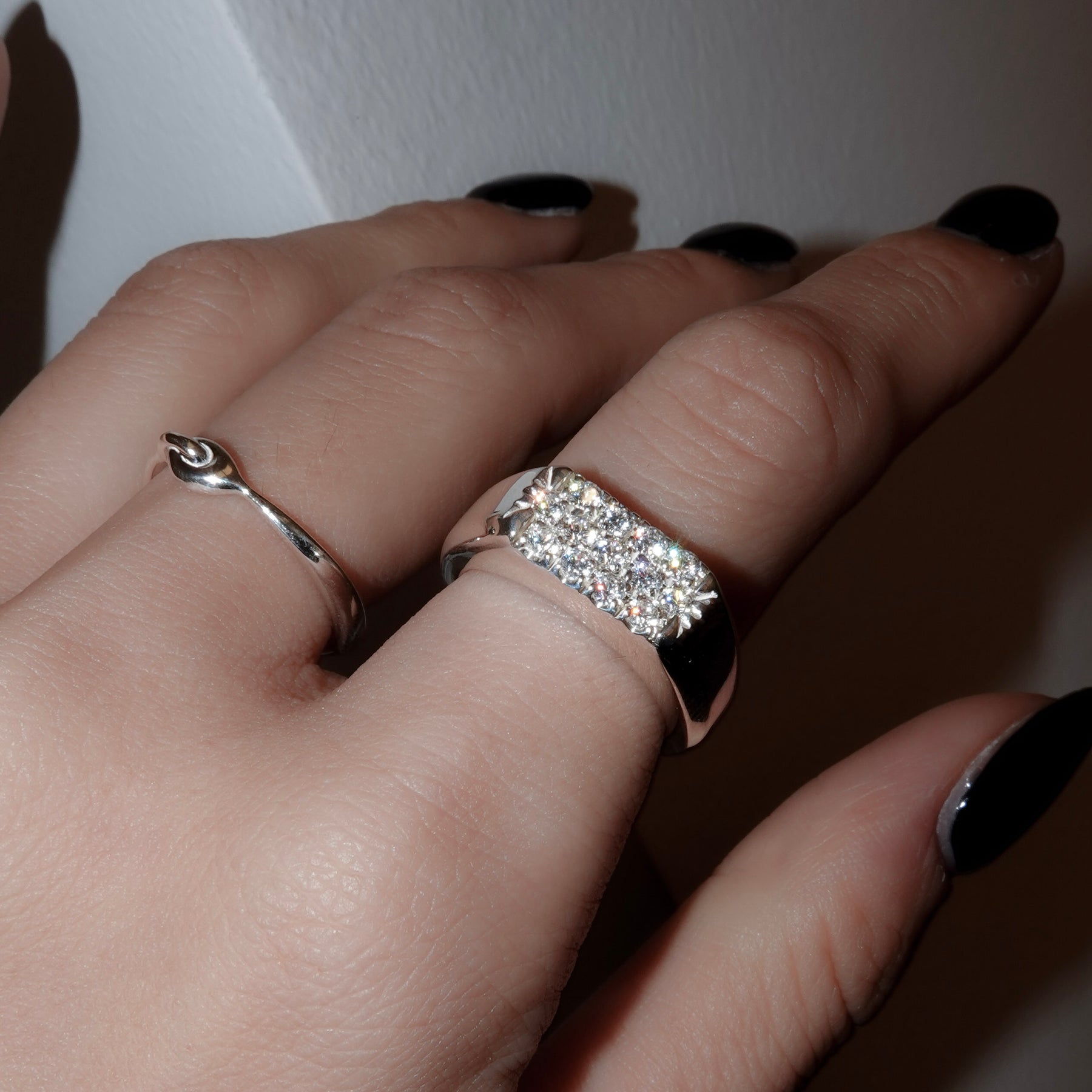 DOCKの名前に由来したuniverse collection。宇宙船内部で地上との通信やロボットアームの操作、地球観測などシャトルの操縦を行う、光り輝くフライトデッキをイメージしたリング。隙間なく広がるコントロールパネルの光を13個のジルコニアをパヴェセッティングすることで表現しています。