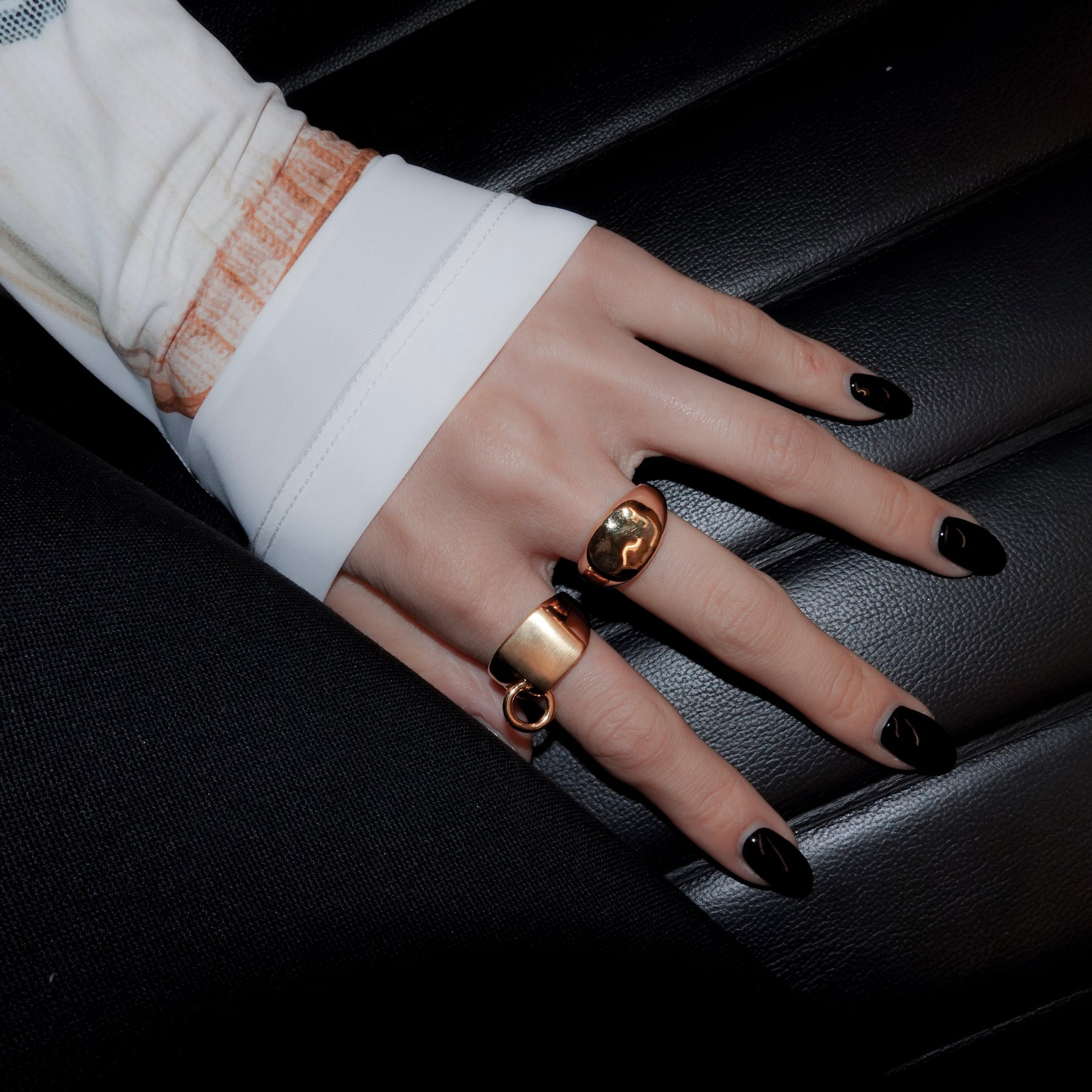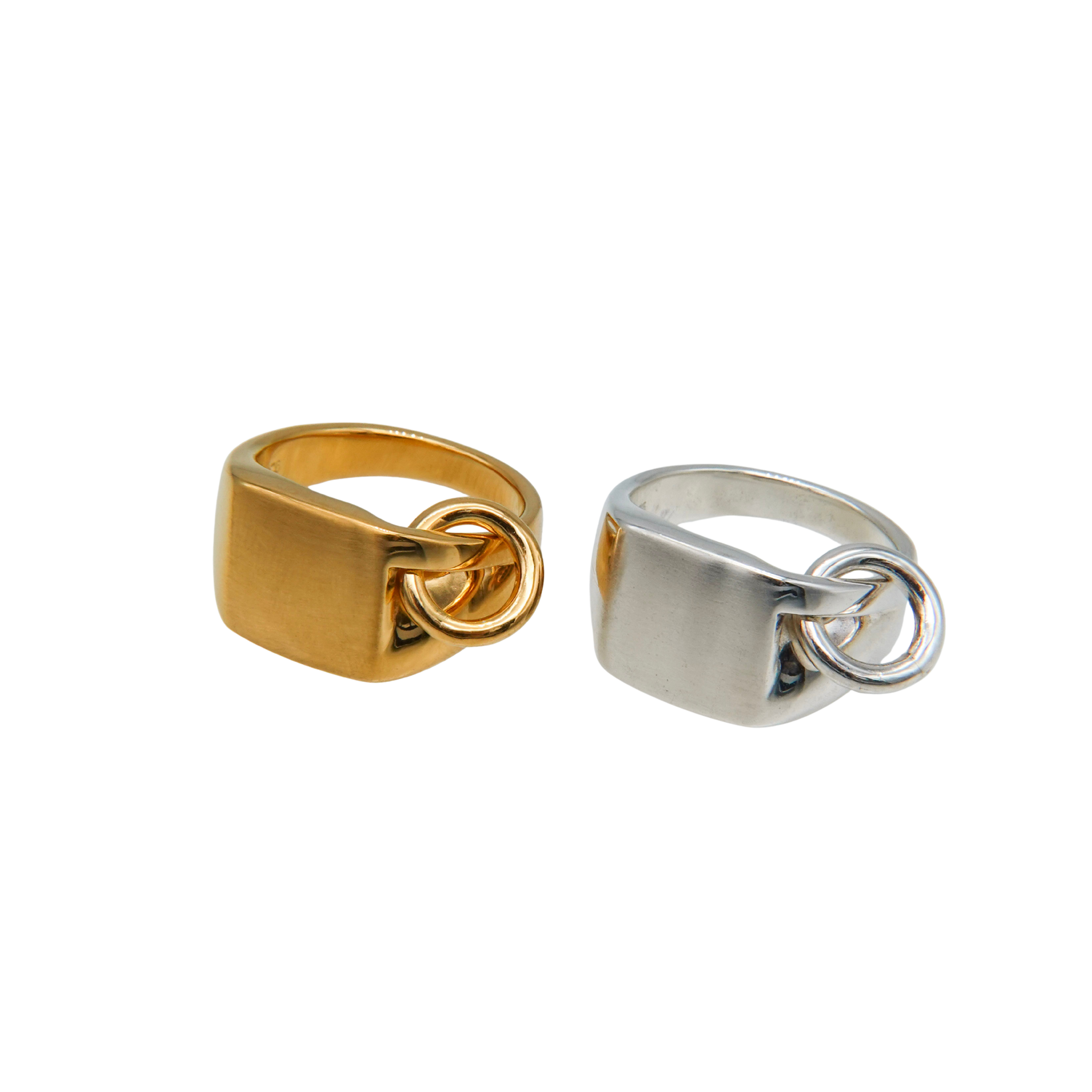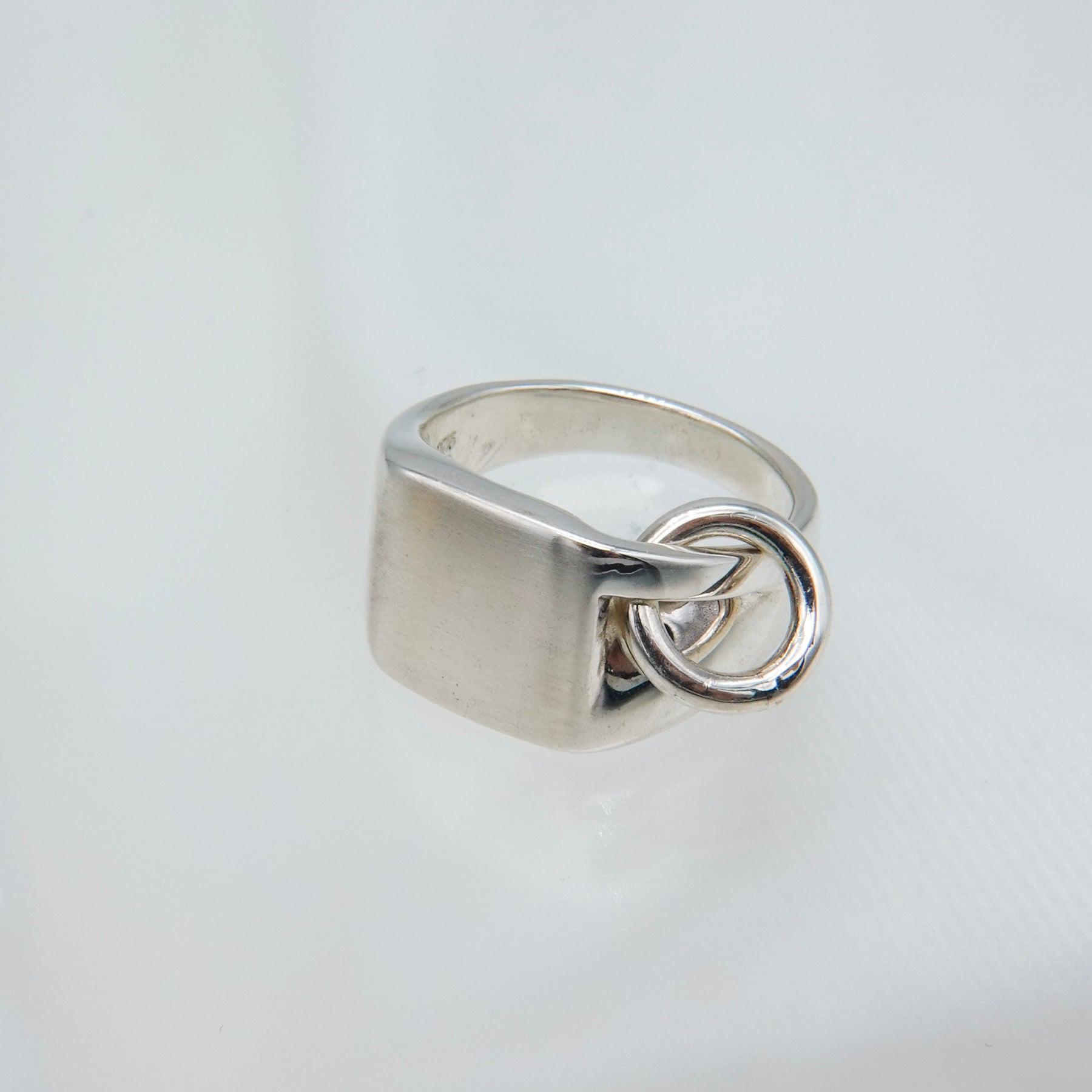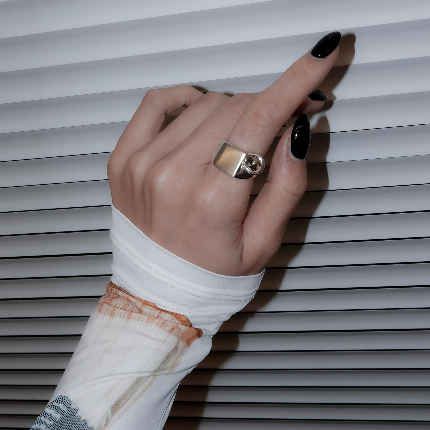 角と丸の構造を静かに共存させた、余白が際立つリング。プレートと丸カンの切り替えが潔く、手元に静かな存在感を与えます。