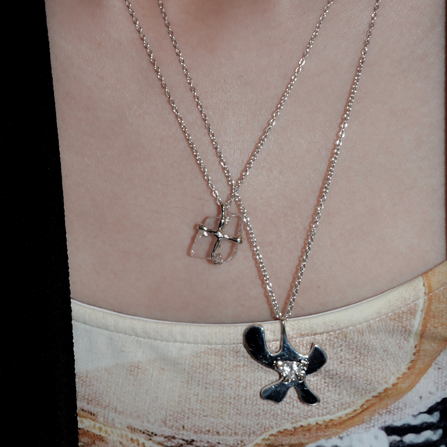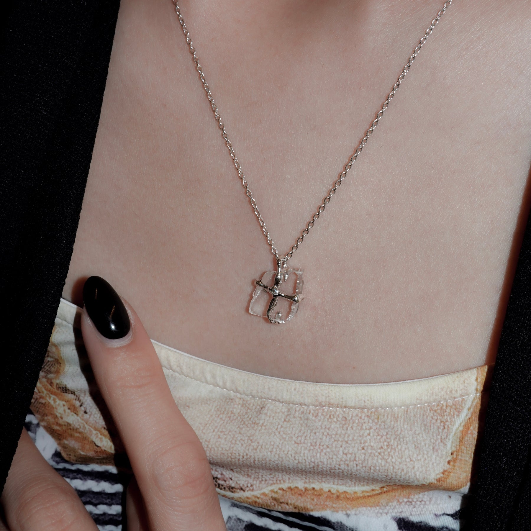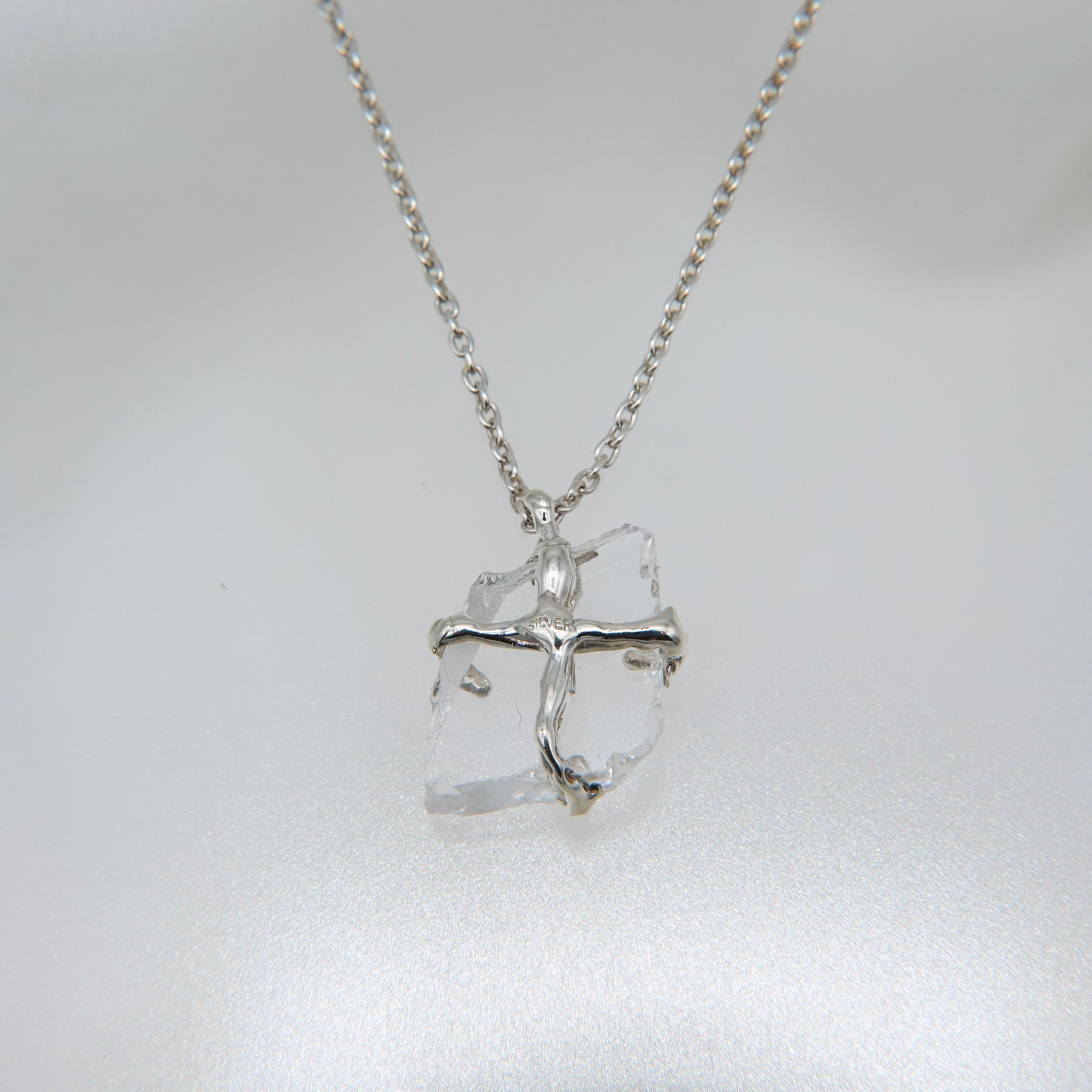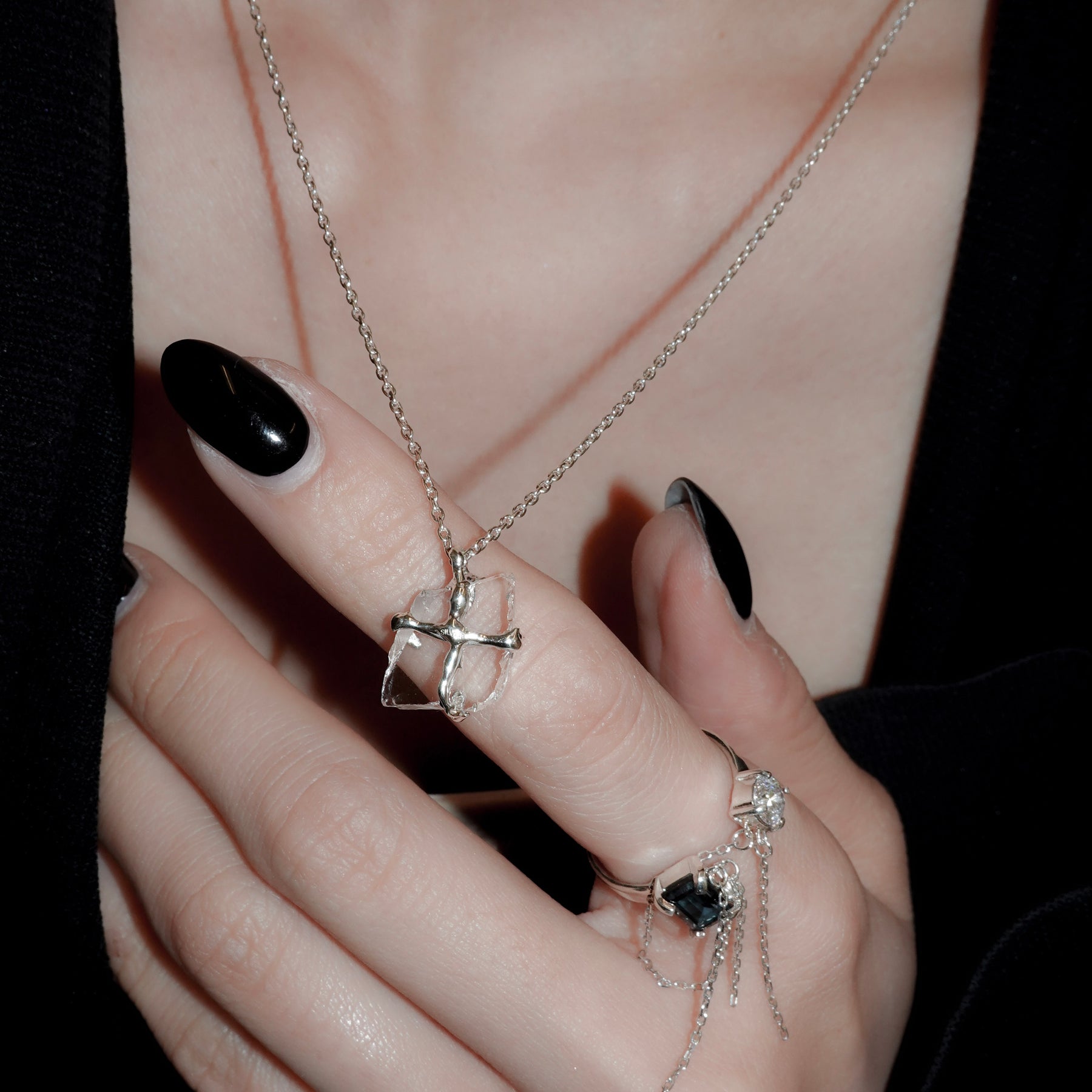 甲府の熟練彫刻職人が一点一点削り出した水晶スライスを使用したクロスネックレス。