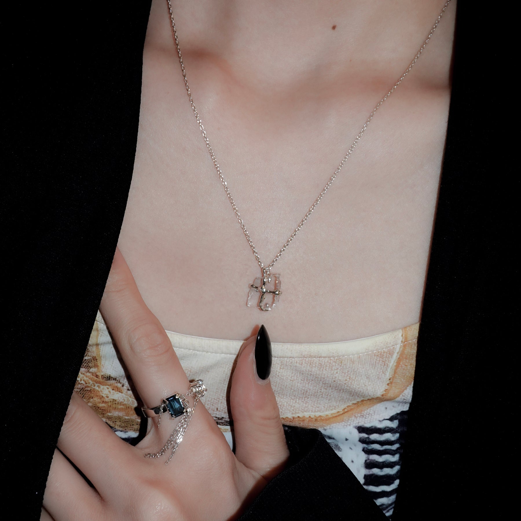 十字架を思わせる石留めが、ハンドクラフトの温かみとモードなエッジを同時に演出します。