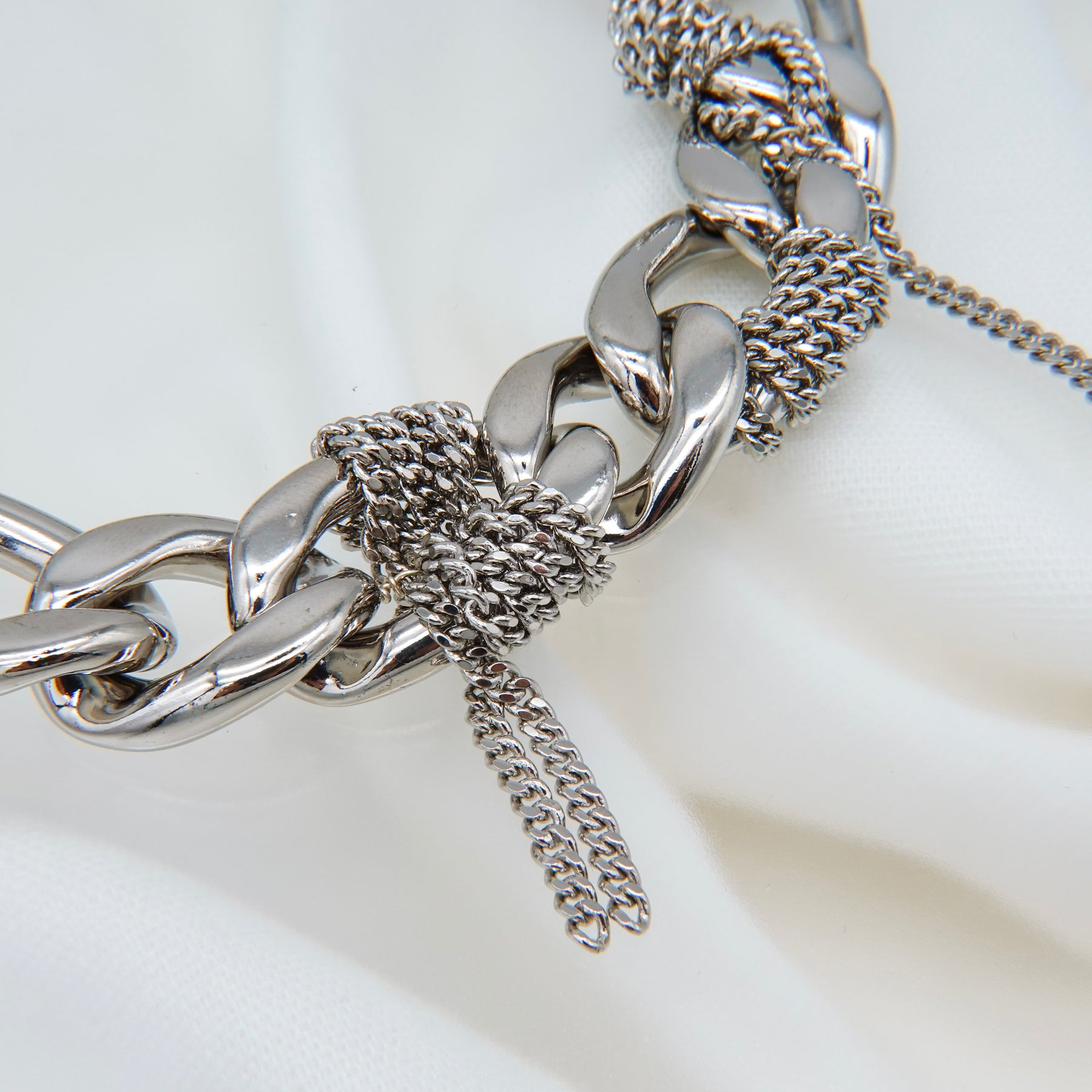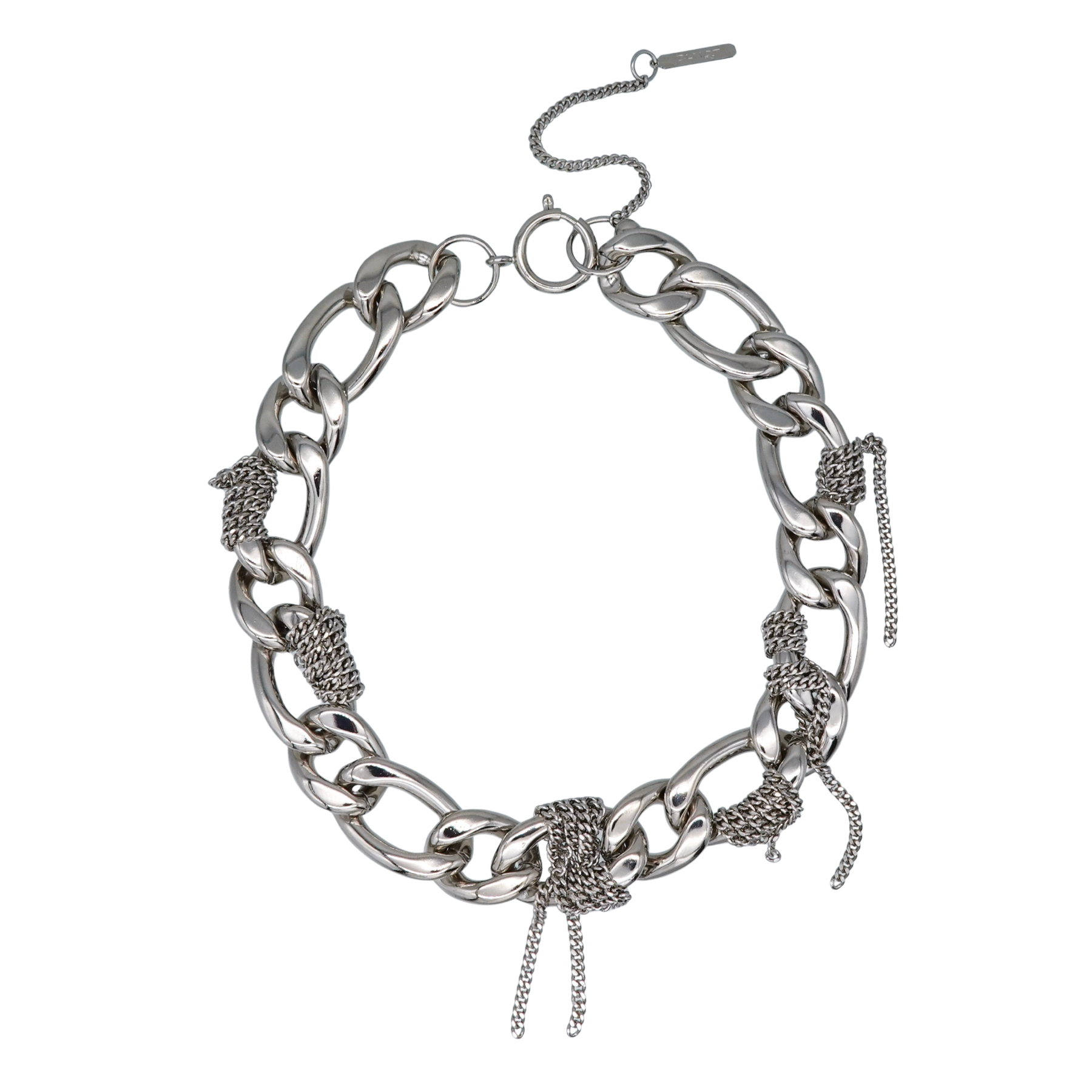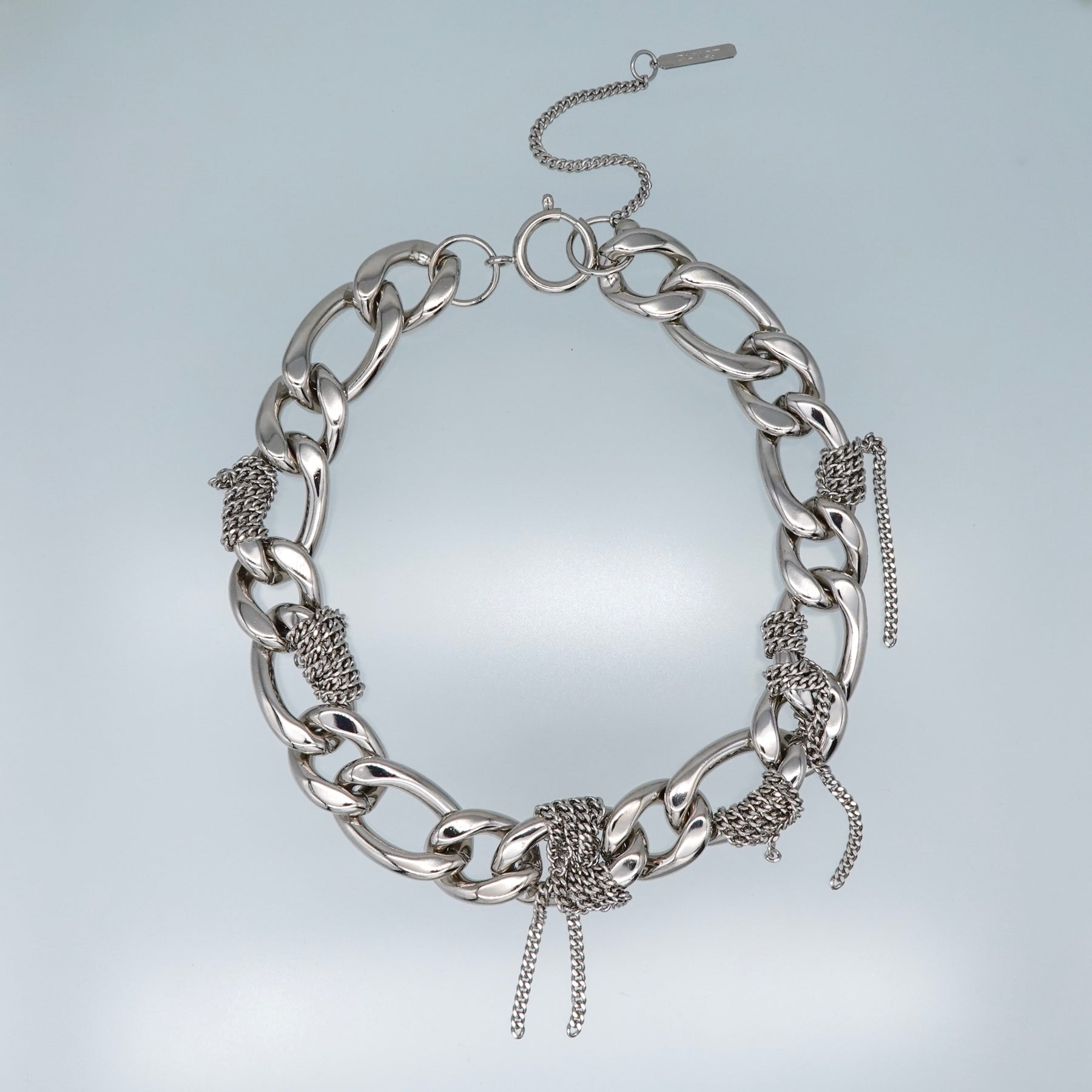 ボリュームがしっかりと感じられる太めのチェーンに細いチェーンが絡みついた、存在感抜群のチョーカー。