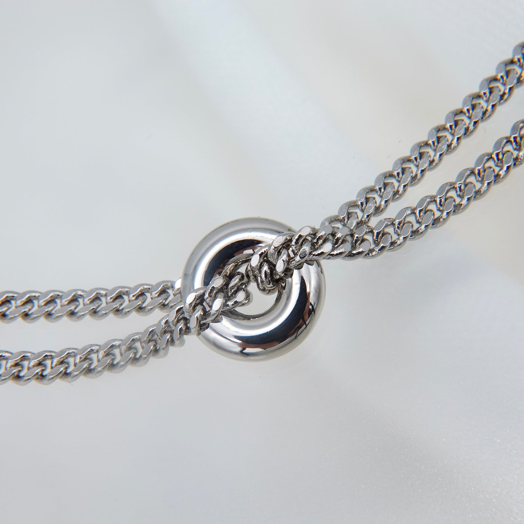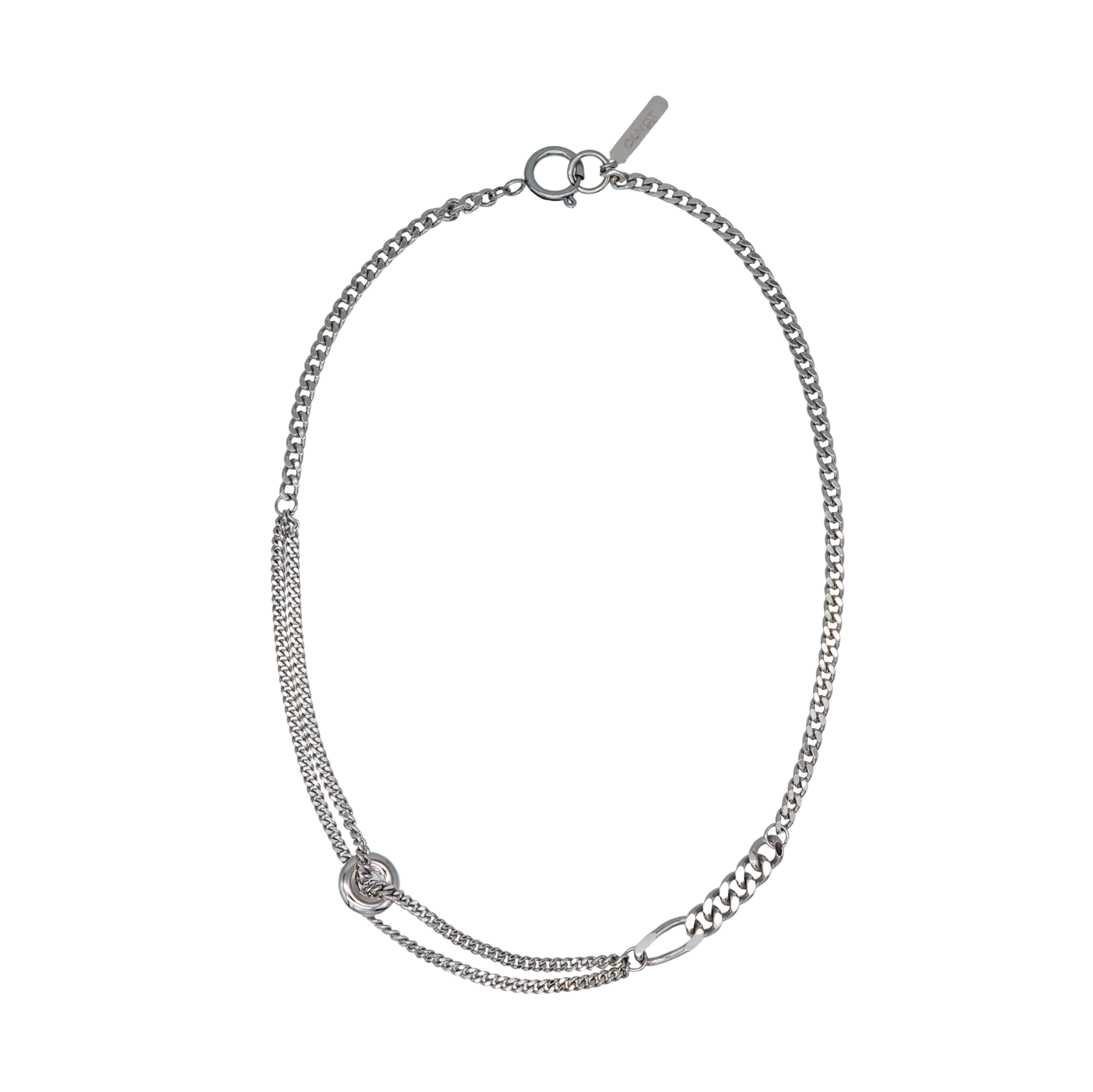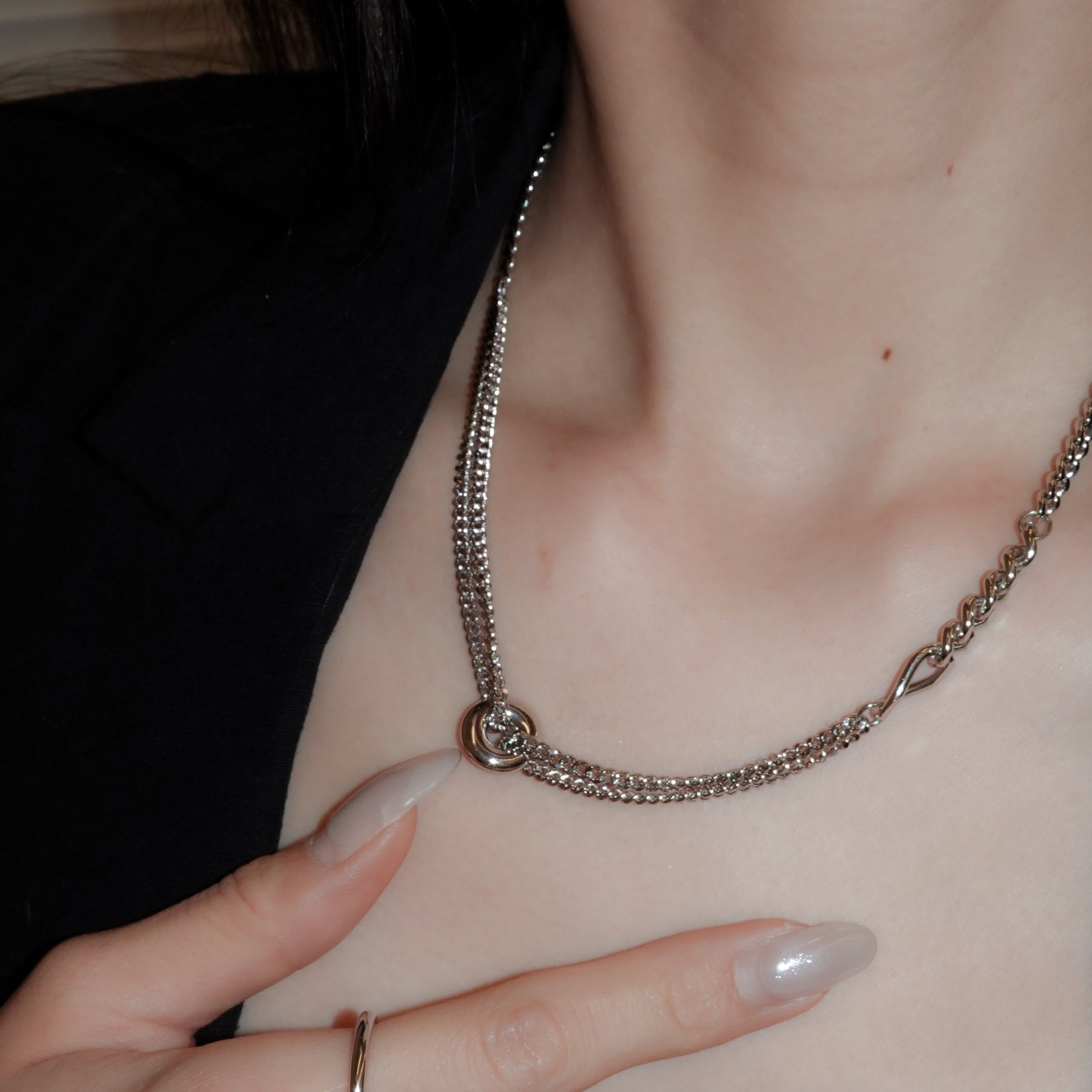 2種類のチェーンが組み合わされたアシンメトリーネックレス。シンプルなデザインで使い回しの効くアイテムです。