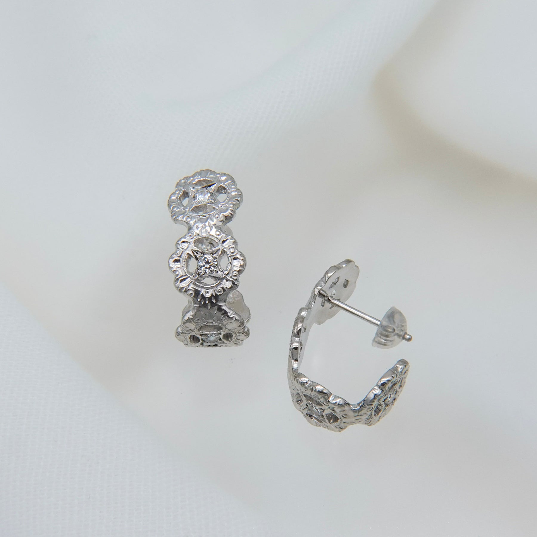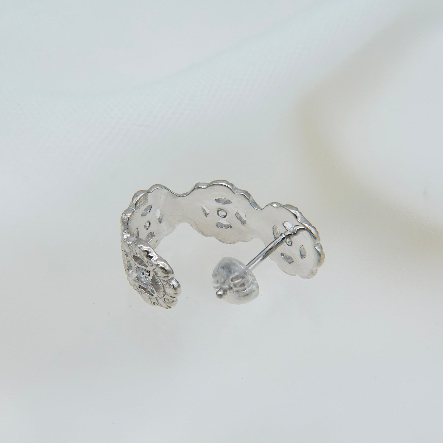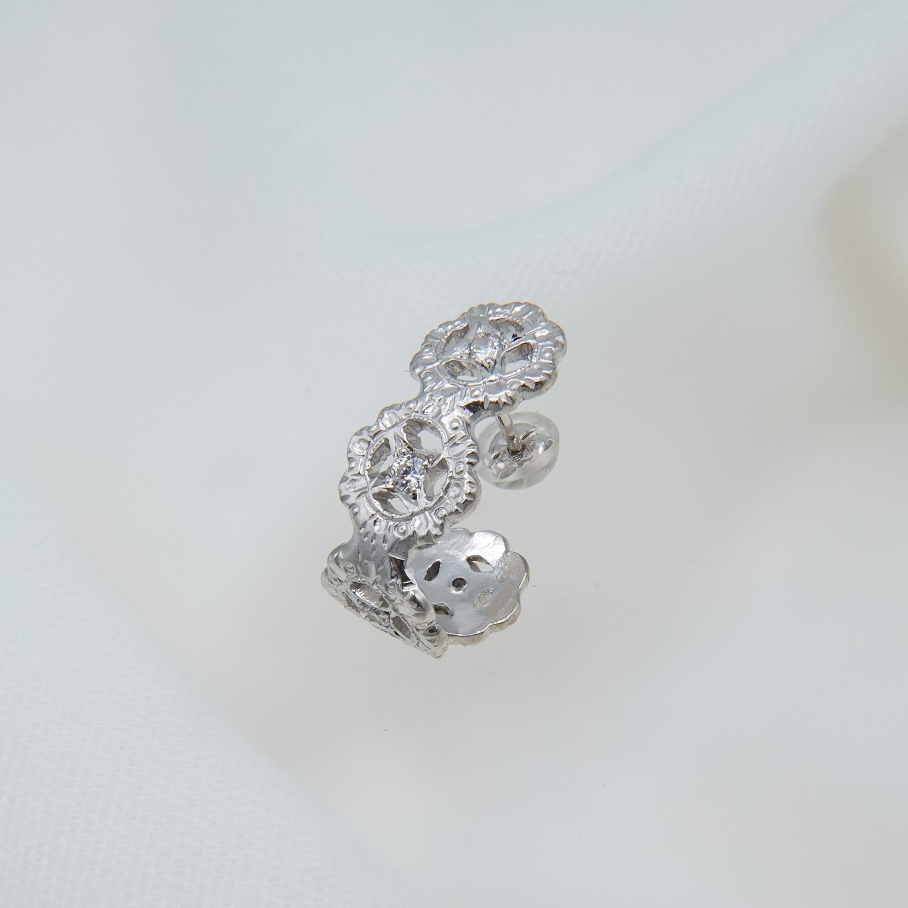 イタリア・フィレンツェの伝統技法、フィレンツェ彫りを施したピアス。 4連の花に繊細な手彫りを施し、中心にはホワイトクリアのジルコニアを星の様な後光留め。 上品な輝きが耳元を華やかに彩り、特別な日にもお使い頂けるデザインです。