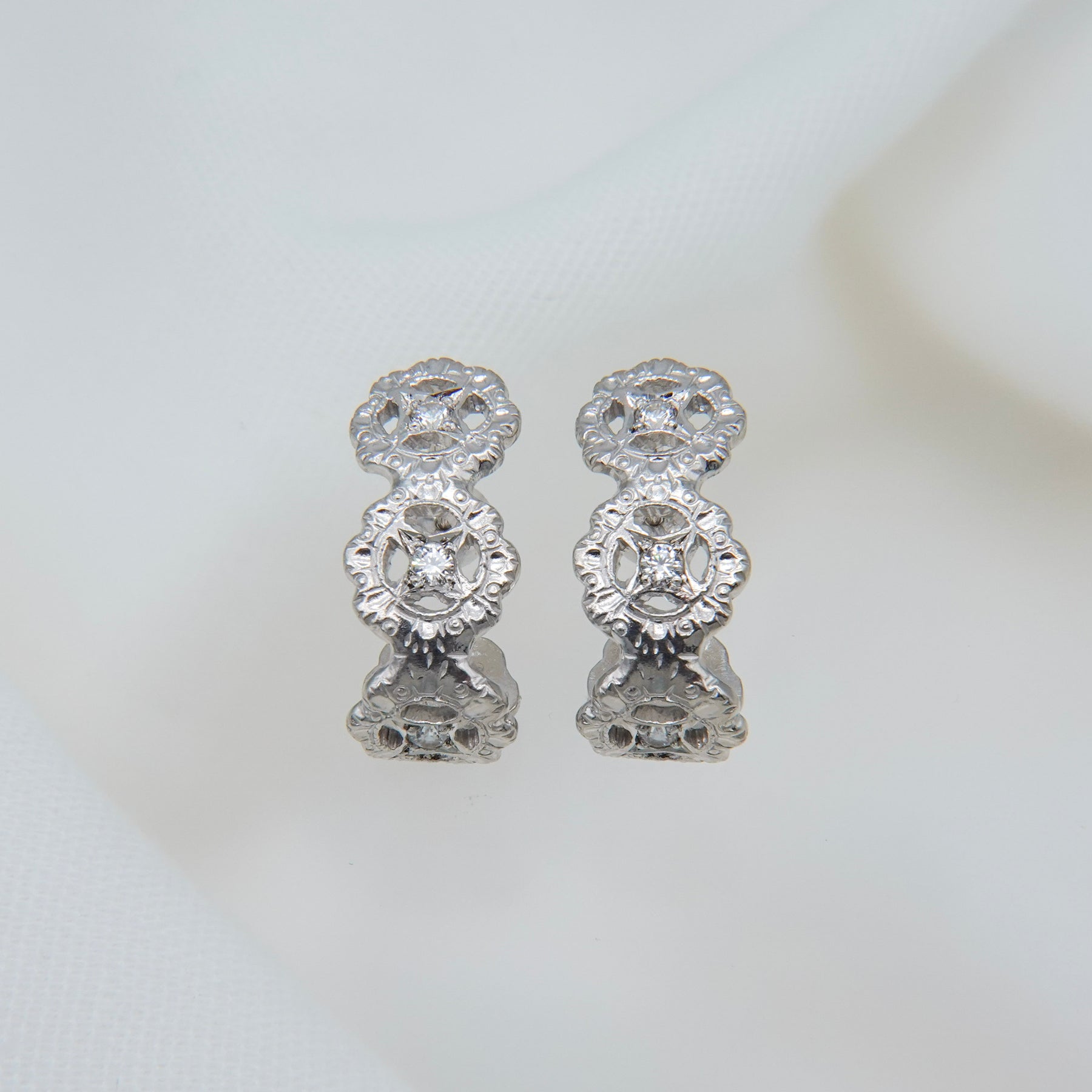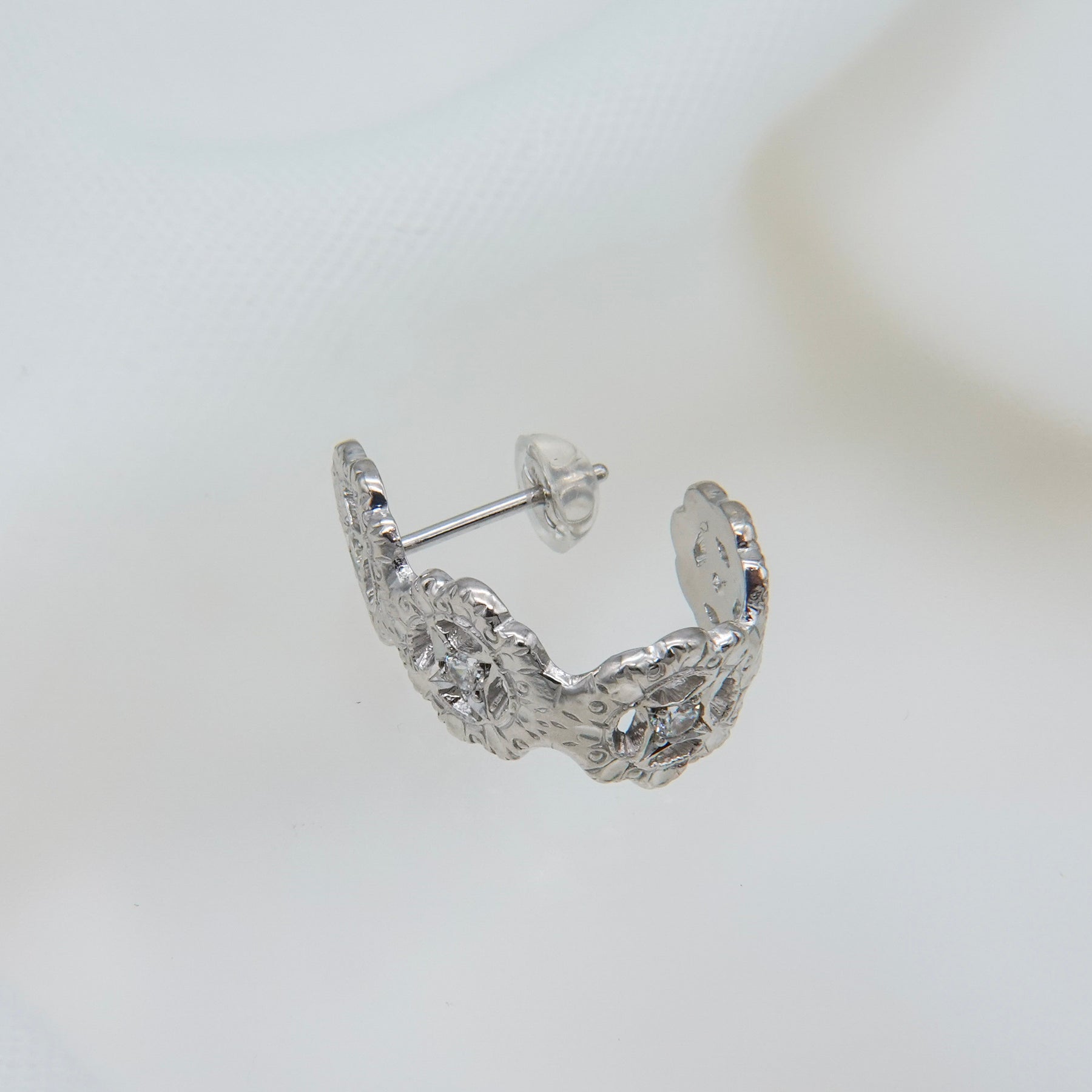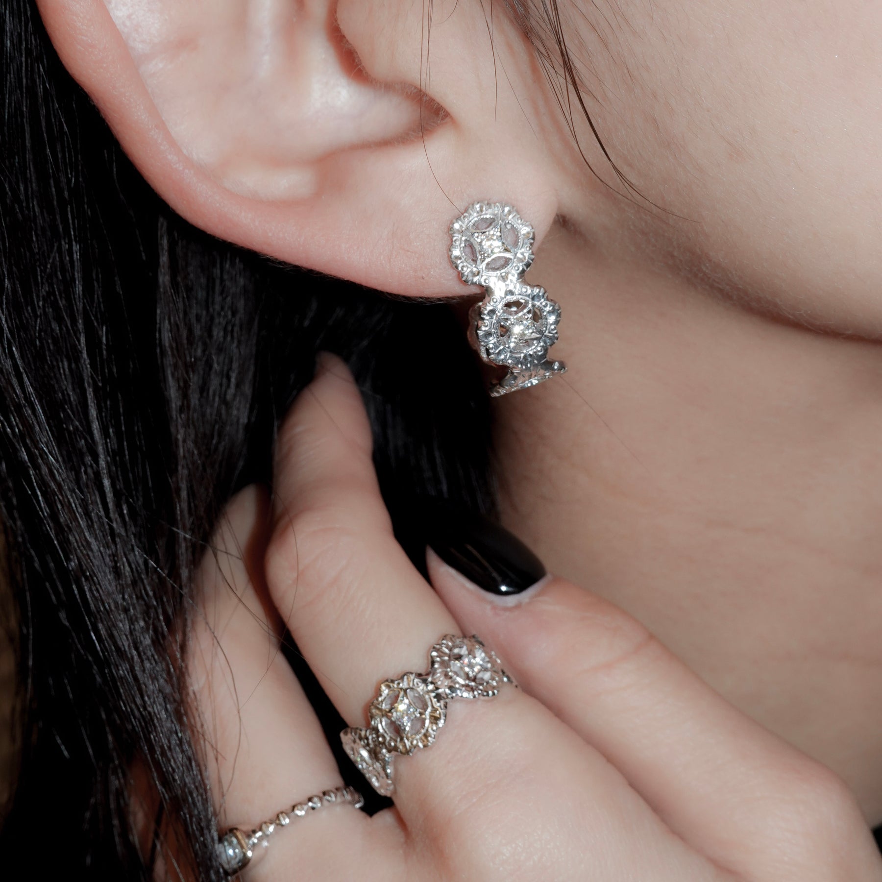 イタリア・フィレンツェの伝統技法、フィレンツェ彫りを施したピアス。 4連の花に繊細な手彫りを施し、中心にはホワイトクリアのジルコニアを星の様な後光留め。 上品な輝きが耳元を華やかに彩り、特別な日にもお使い頂けるデザインです。
