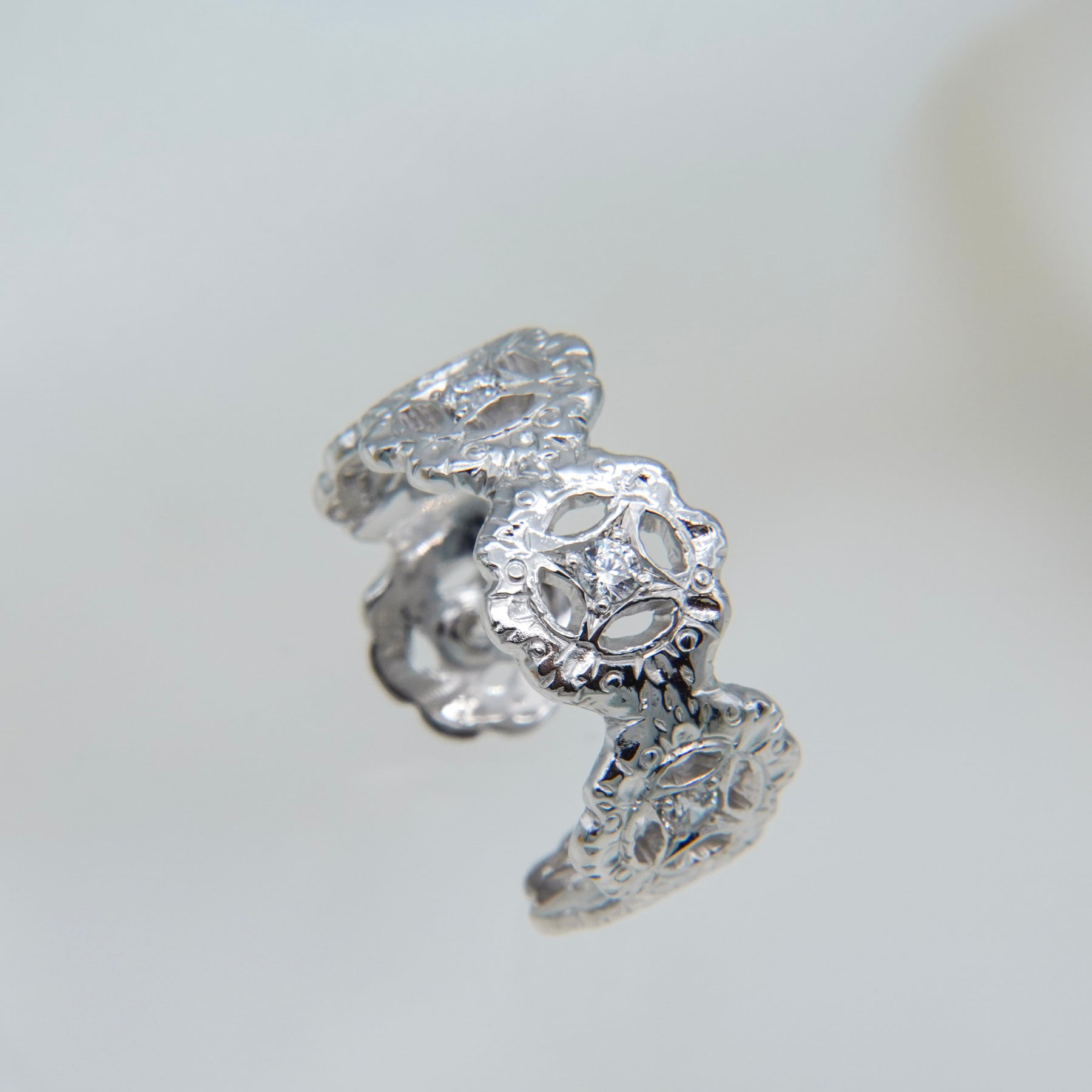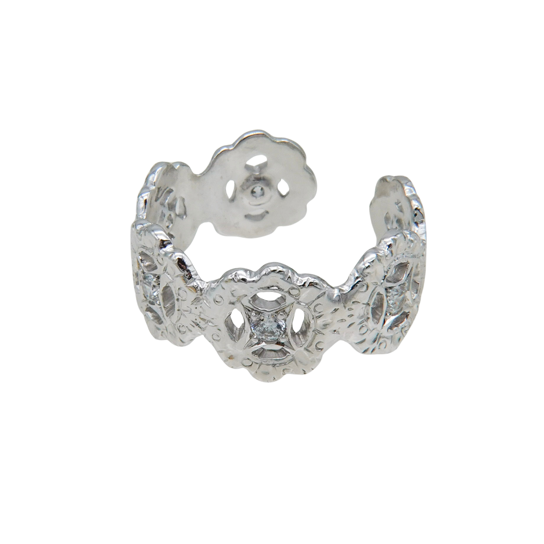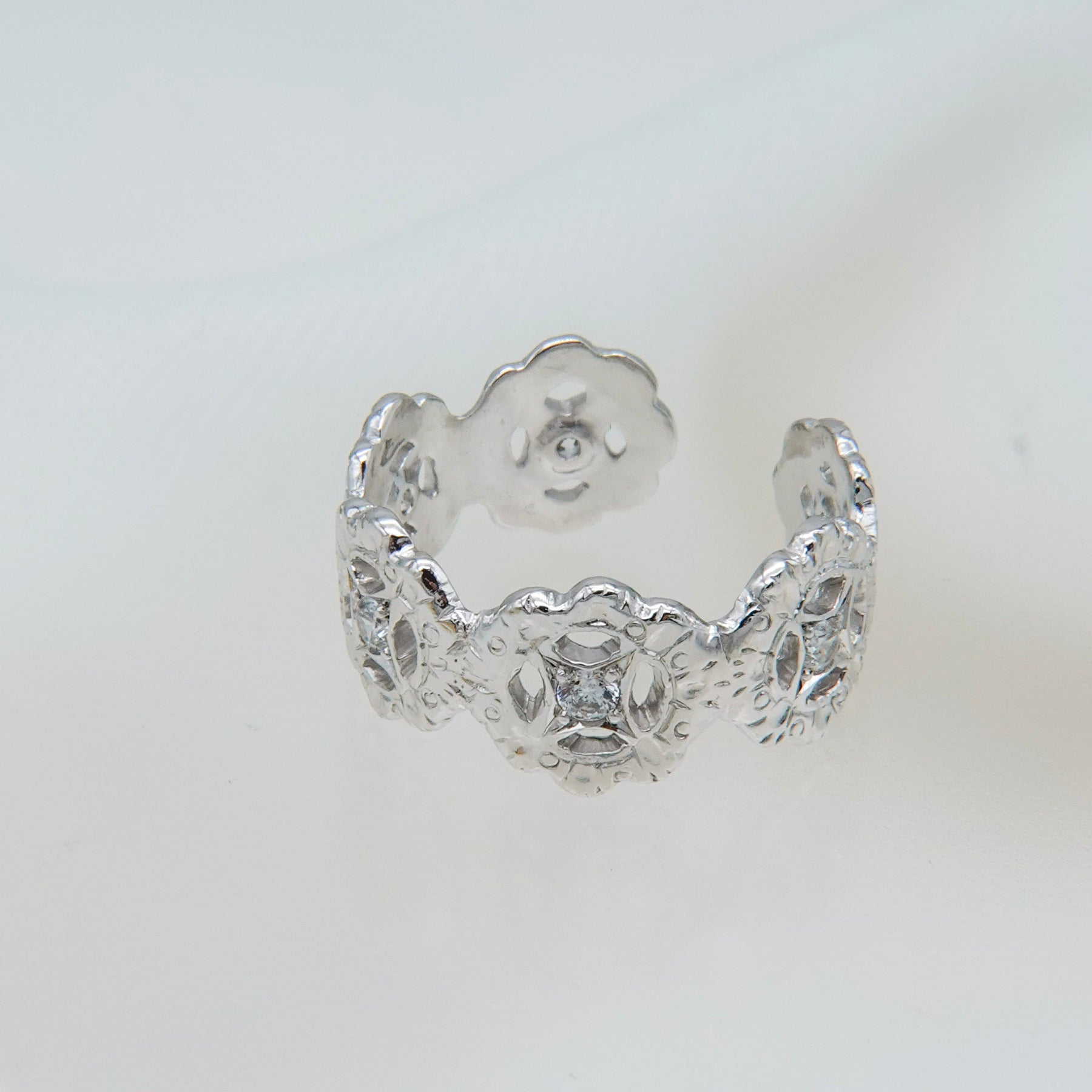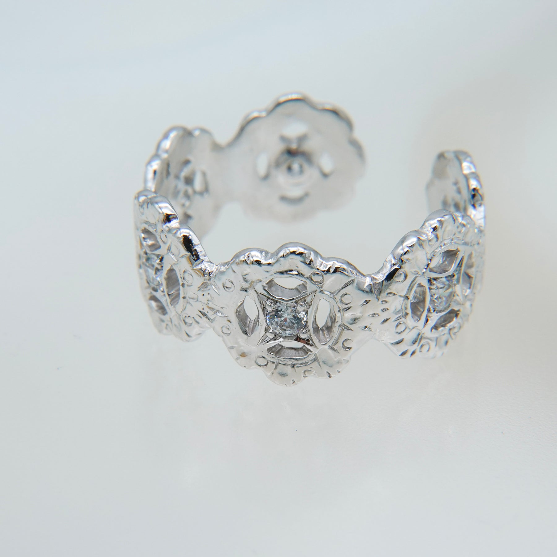 4連の花に繊細な手彫りを施し、中心にはホワイトクリアのジルコニアを星の様な後光留め。