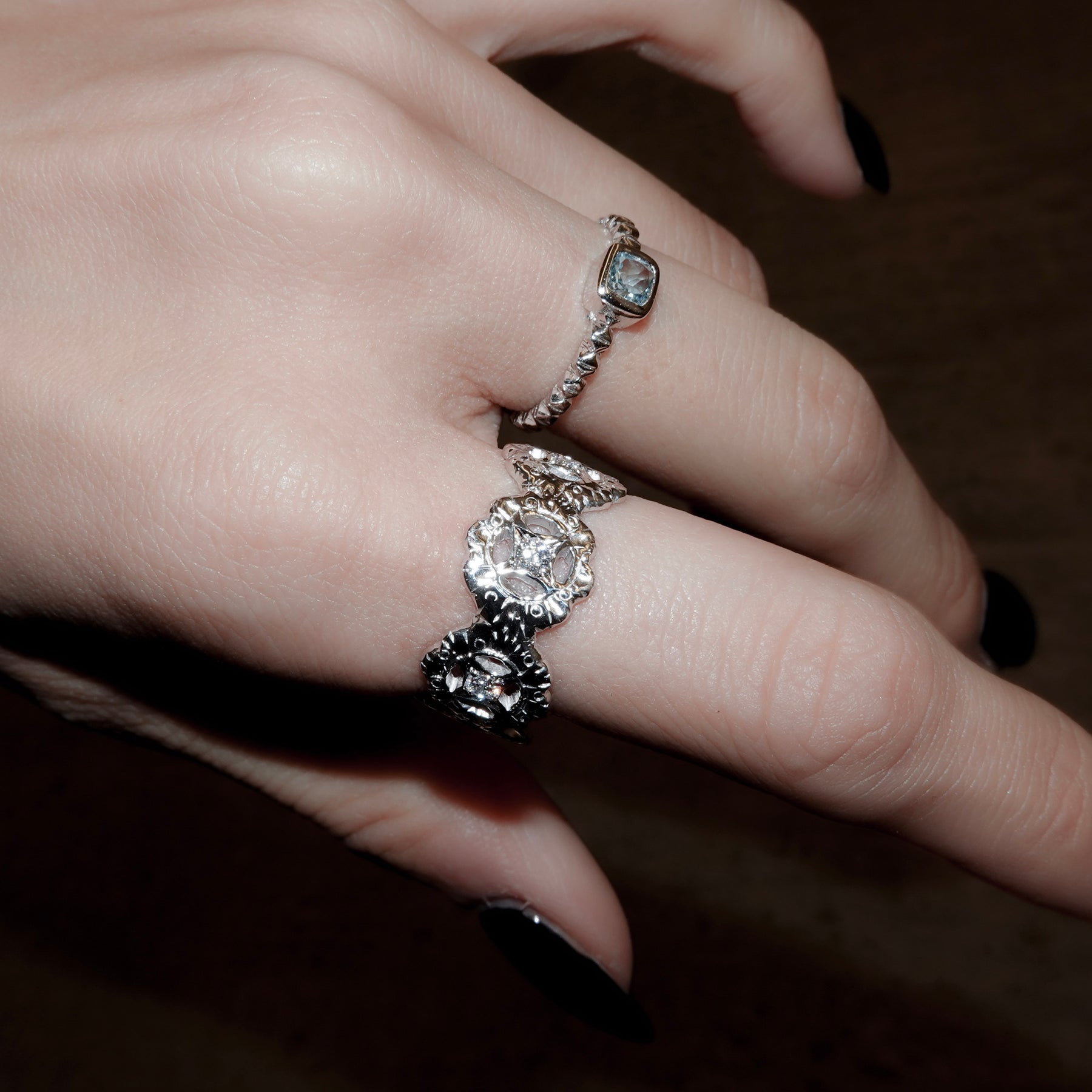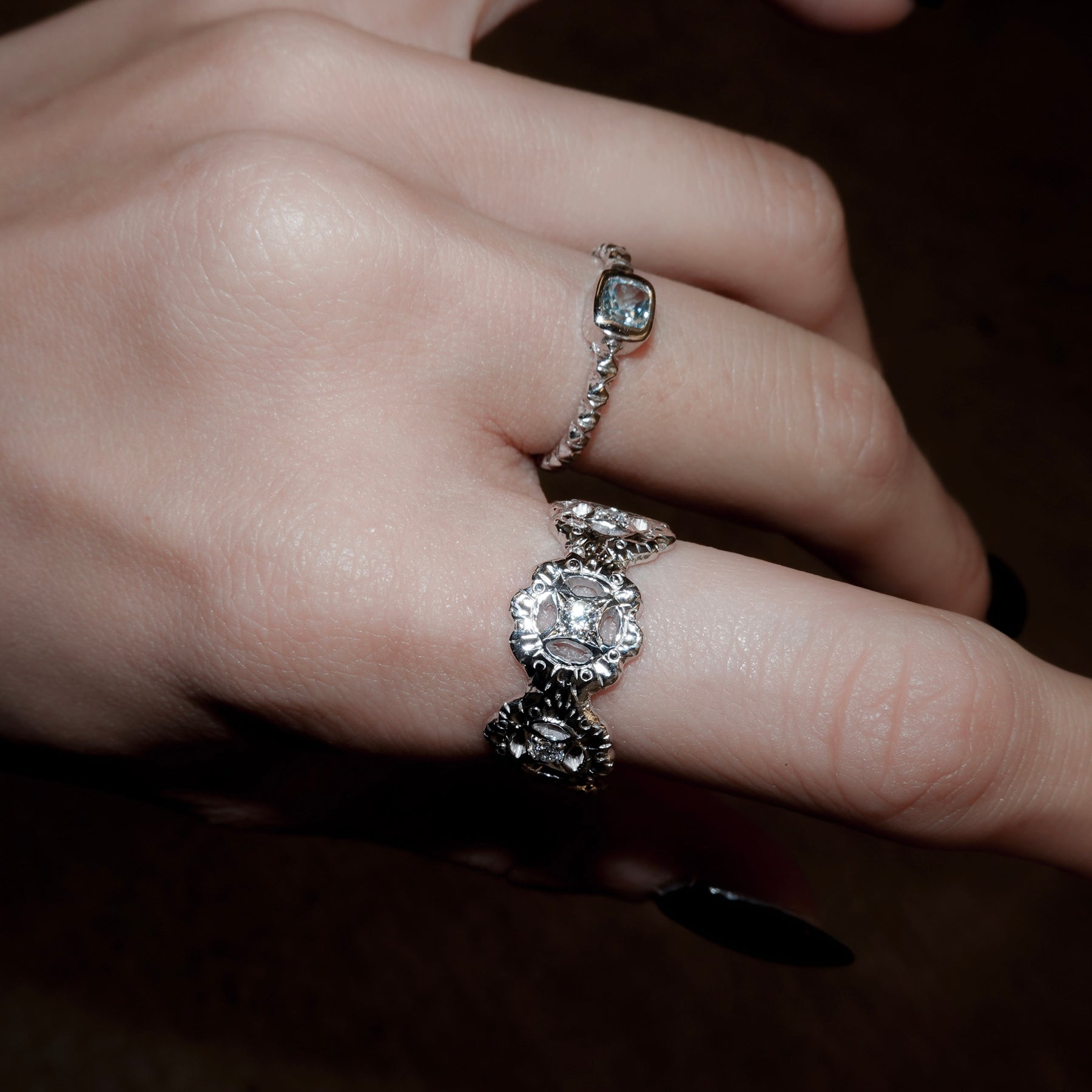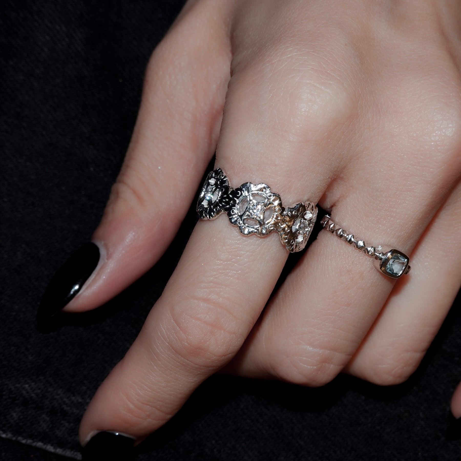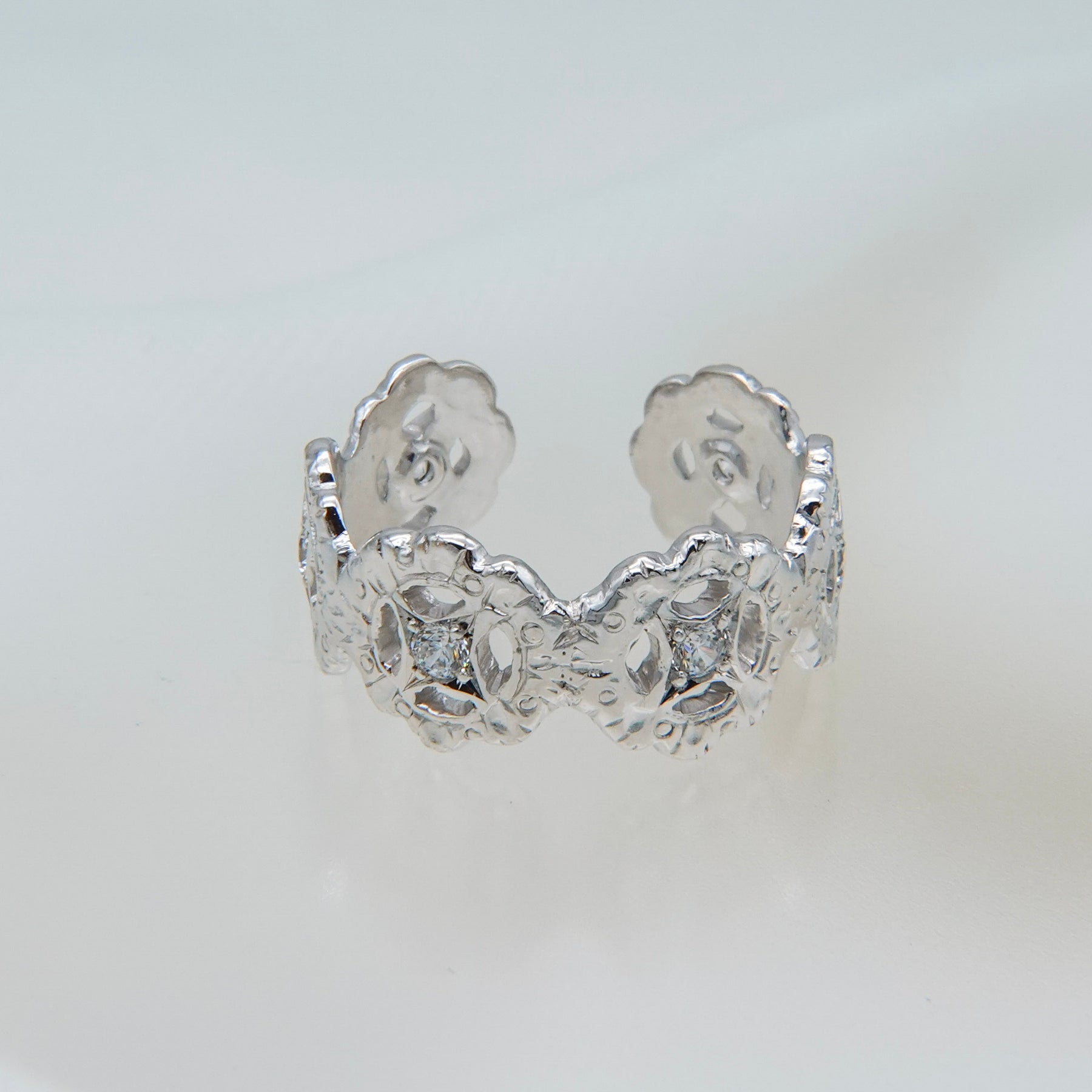 4連の花に繊細な手彫りを施し、中心にはホワイトクリアのジルコニアを星の様な後光留め。