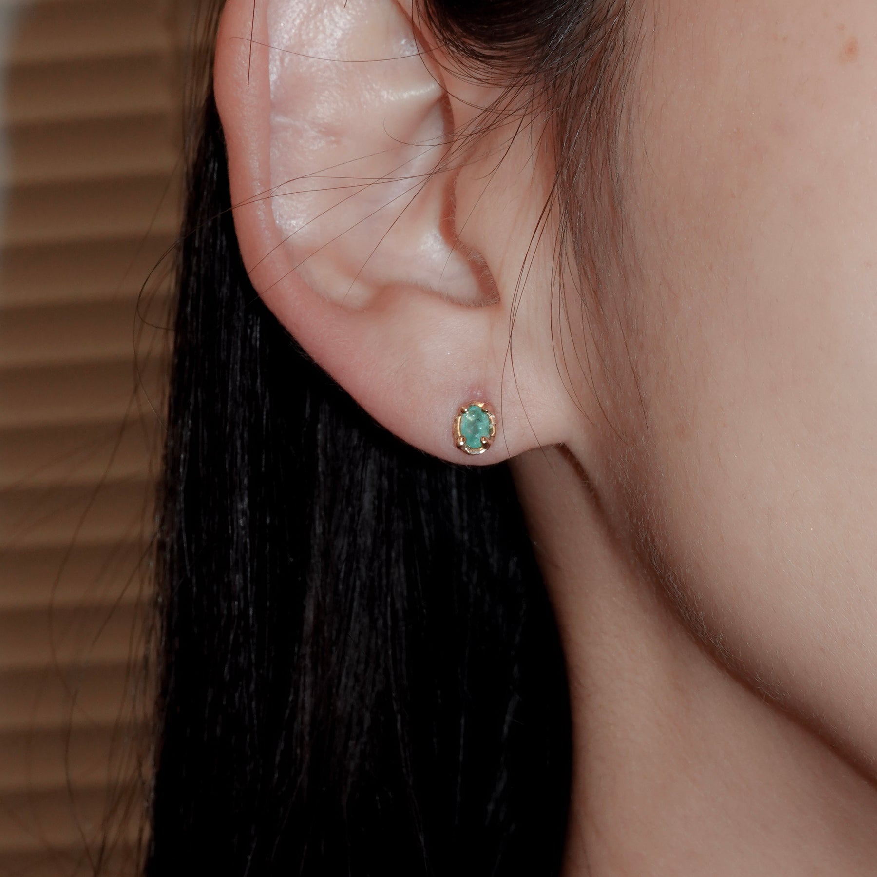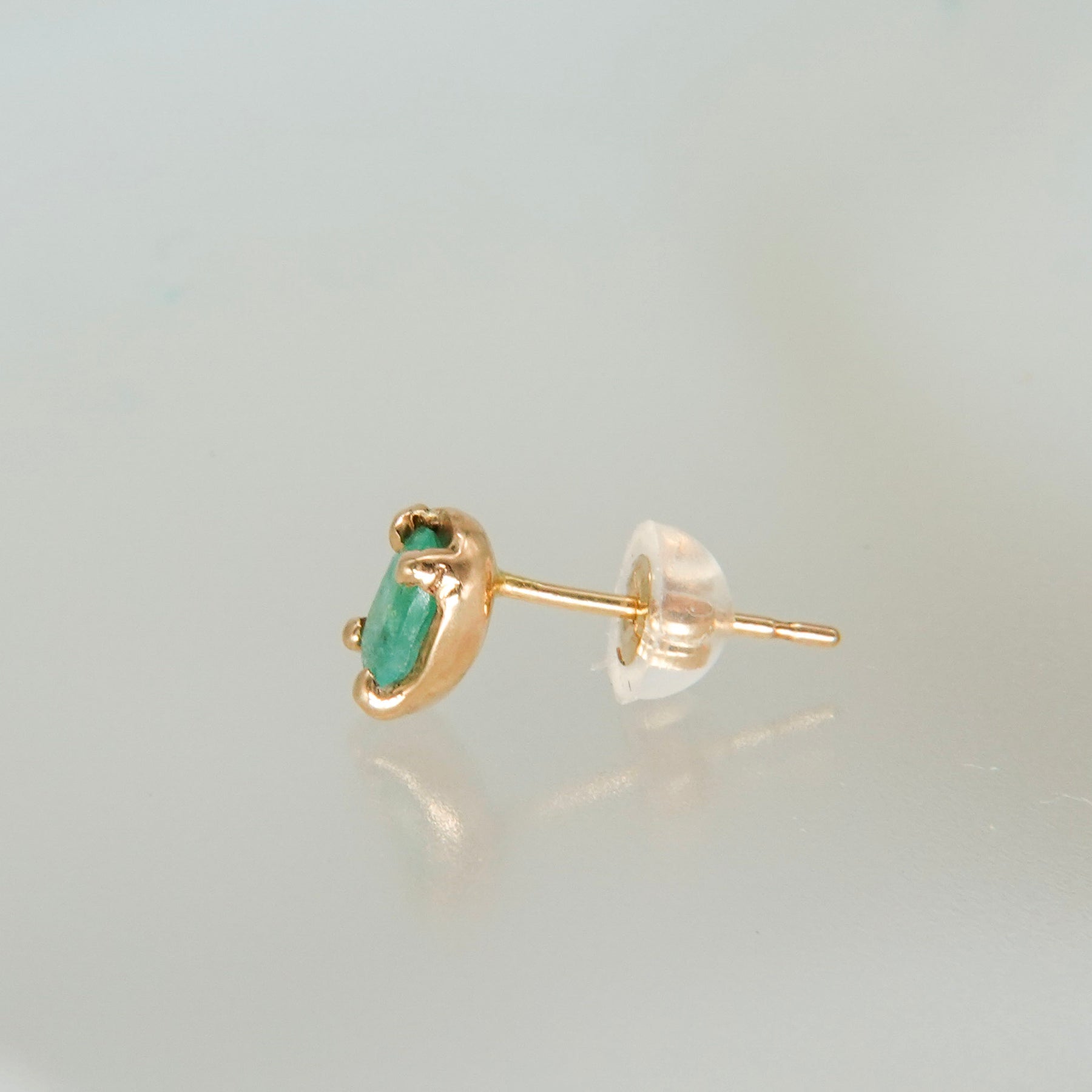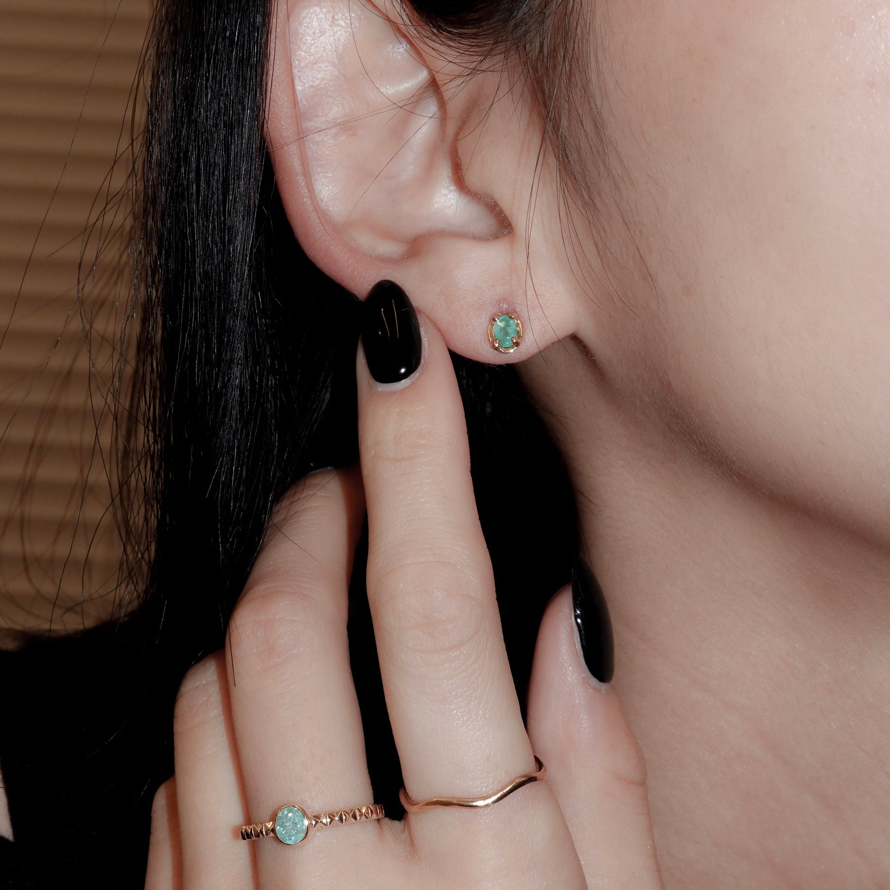 淡いグリーンが、耳元に上品な彩りを添えます。石に合わせて手作業で仕立てられた一点ものジュエリー。