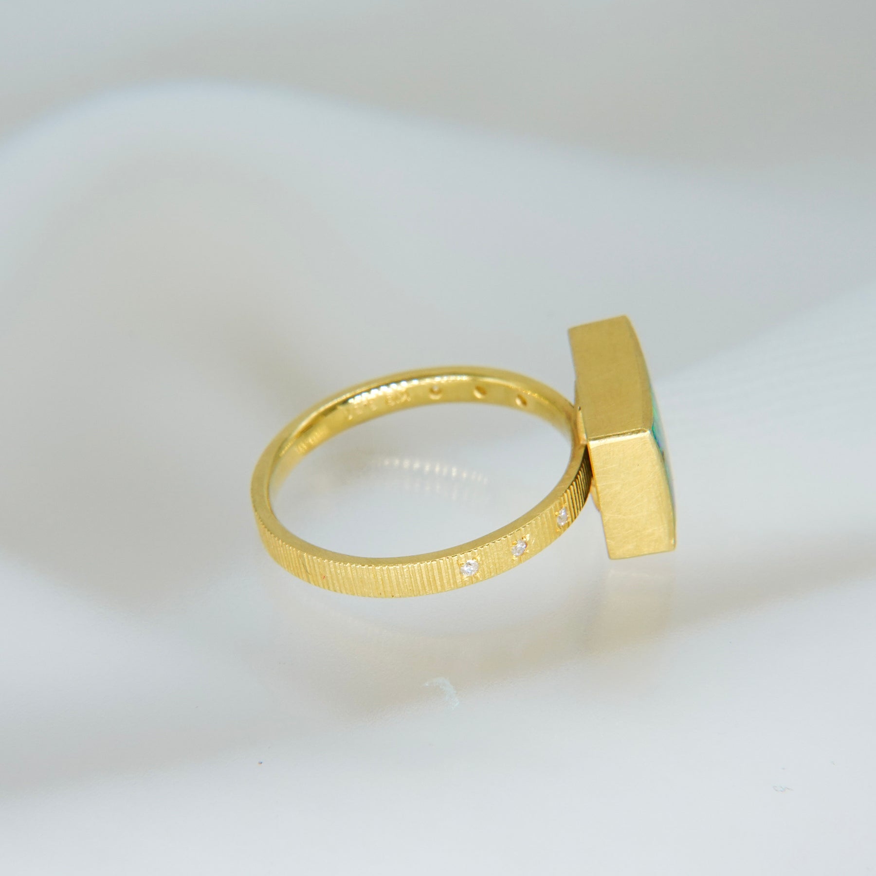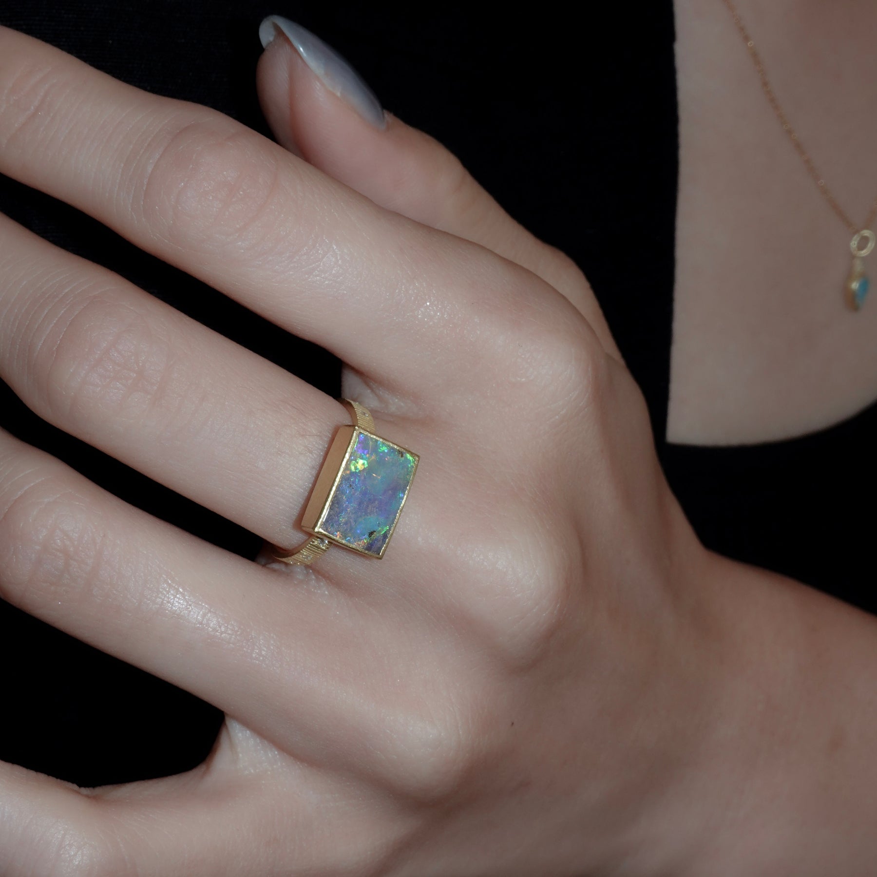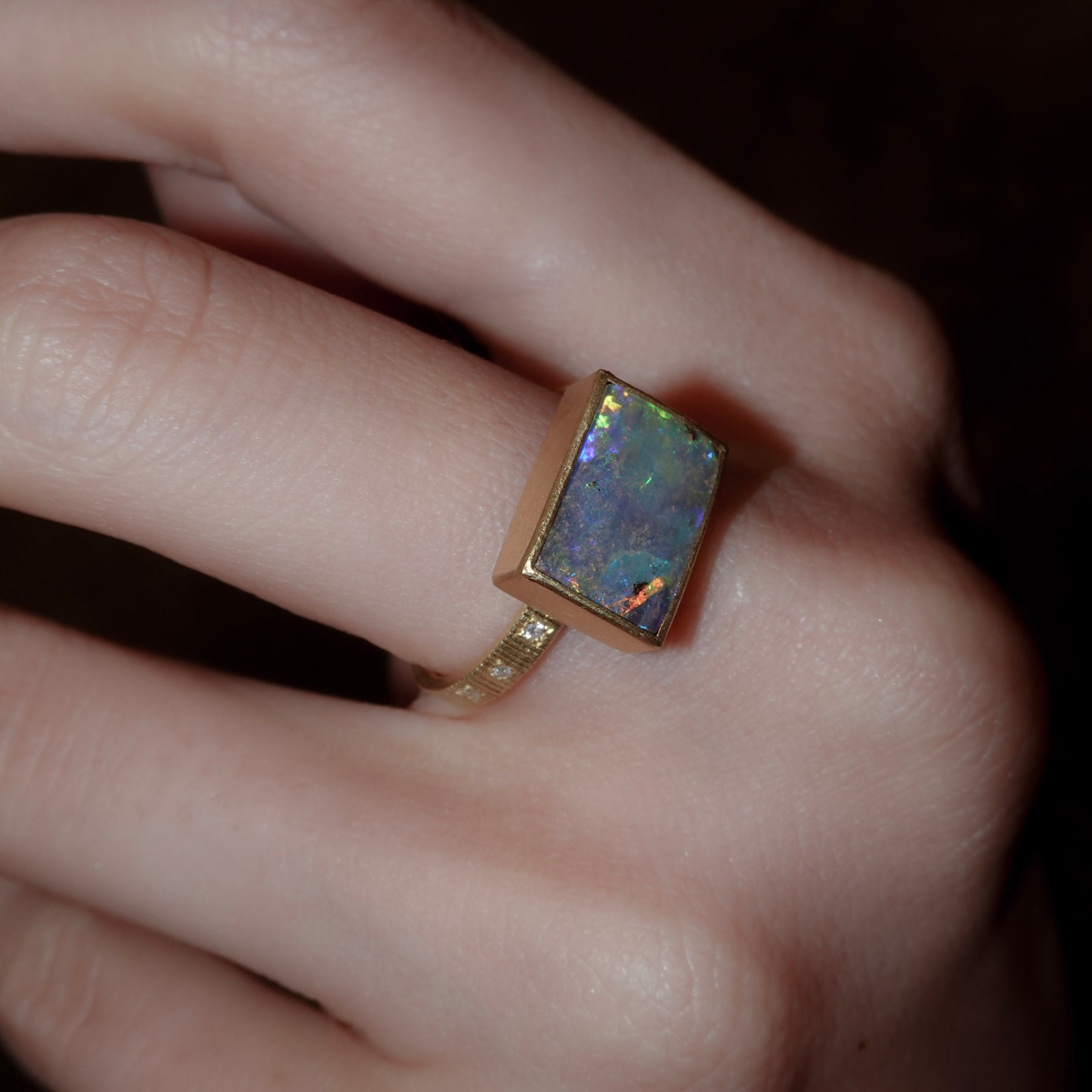 光の角度で表情を変えるオパール。 深いブルーグリーンから鮮烈なイエローまで、無限に広がる色彩が指先に宿ります。 シンプルで直線的なスクエアのフォルムと艶やかなゴールドが、知的でモダンな女性らしさを引き出すリングです。その輝きを余すことなく引き立てます。石を囲む側面のゴールドの仕立ての美しさが際立ち、身につけるたびに、思わずうっとりと見惚れてしまうリングです。