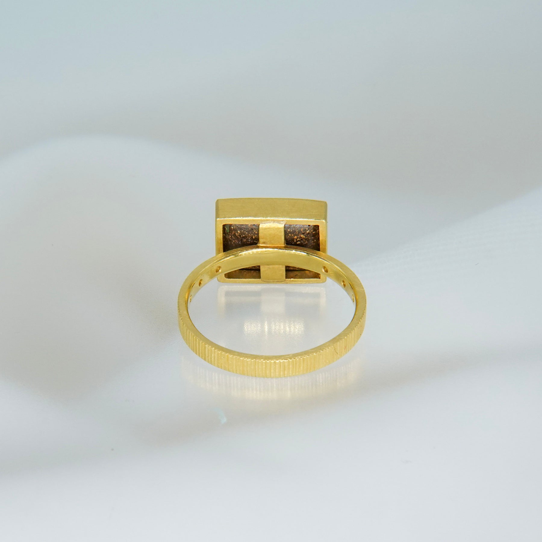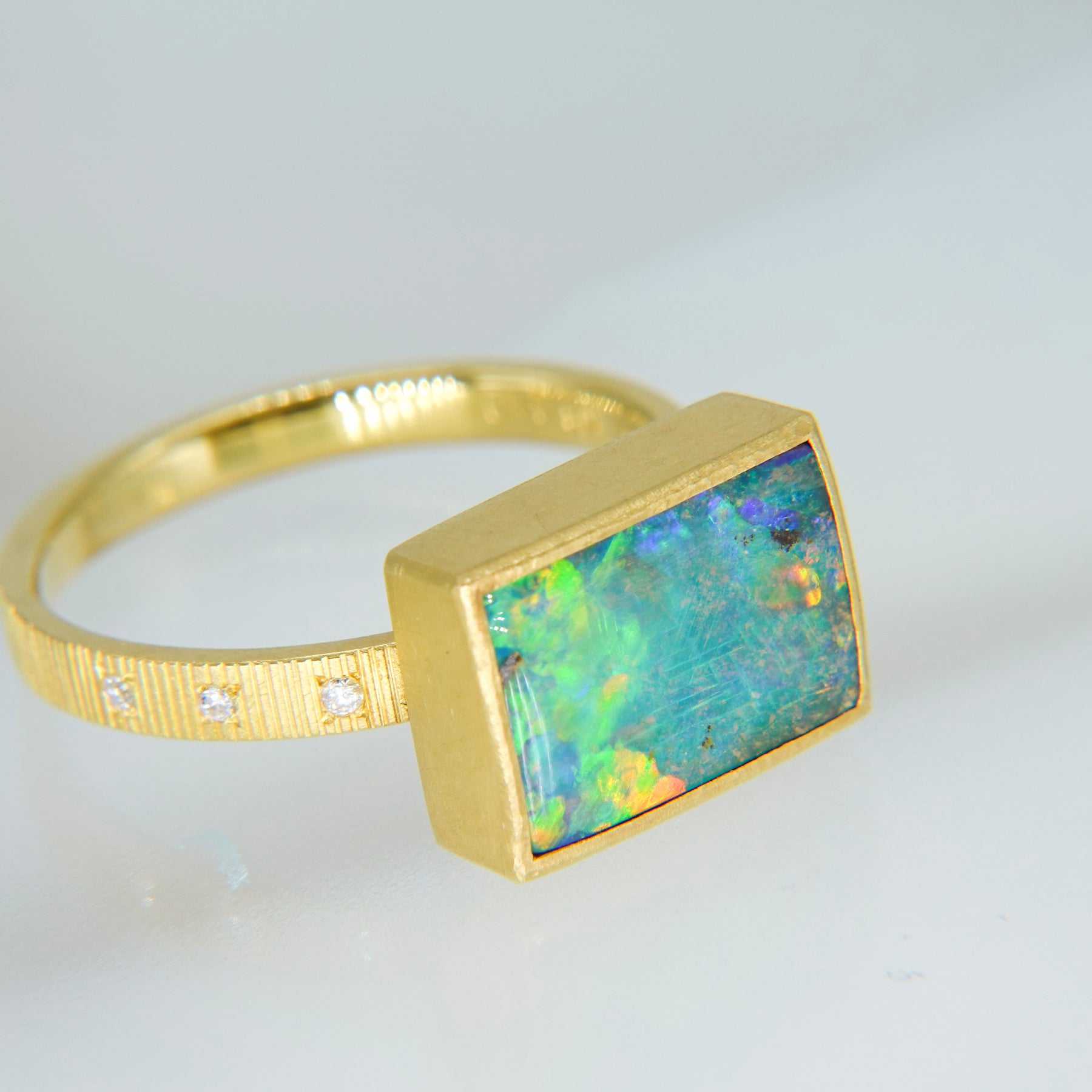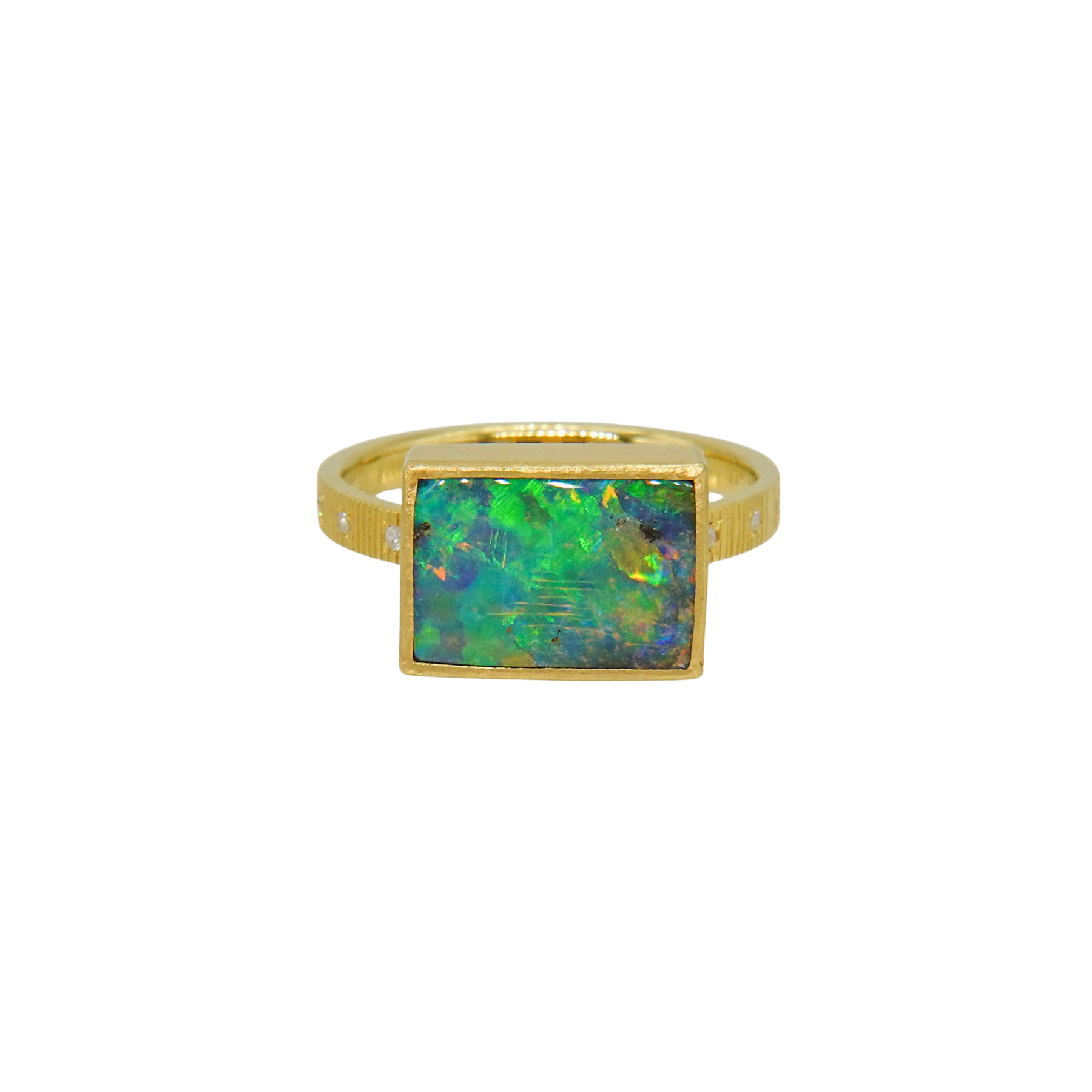 光の角度で表情を変えるオパール。 深いブルーグリーンから鮮烈なイエローまで、無限に広がる色彩が指先に宿ります。 シンプルで直線的なスクエアのフォルムと艶やかなゴールドが、知的でモダンな女性らしさを引き出すリングです。その輝きを余すことなく引き立てます。石を囲む側面のゴールドの仕立ての美しさが際立ち、身につけるたびに、思わずうっとりと見惚れてしまうリングです。