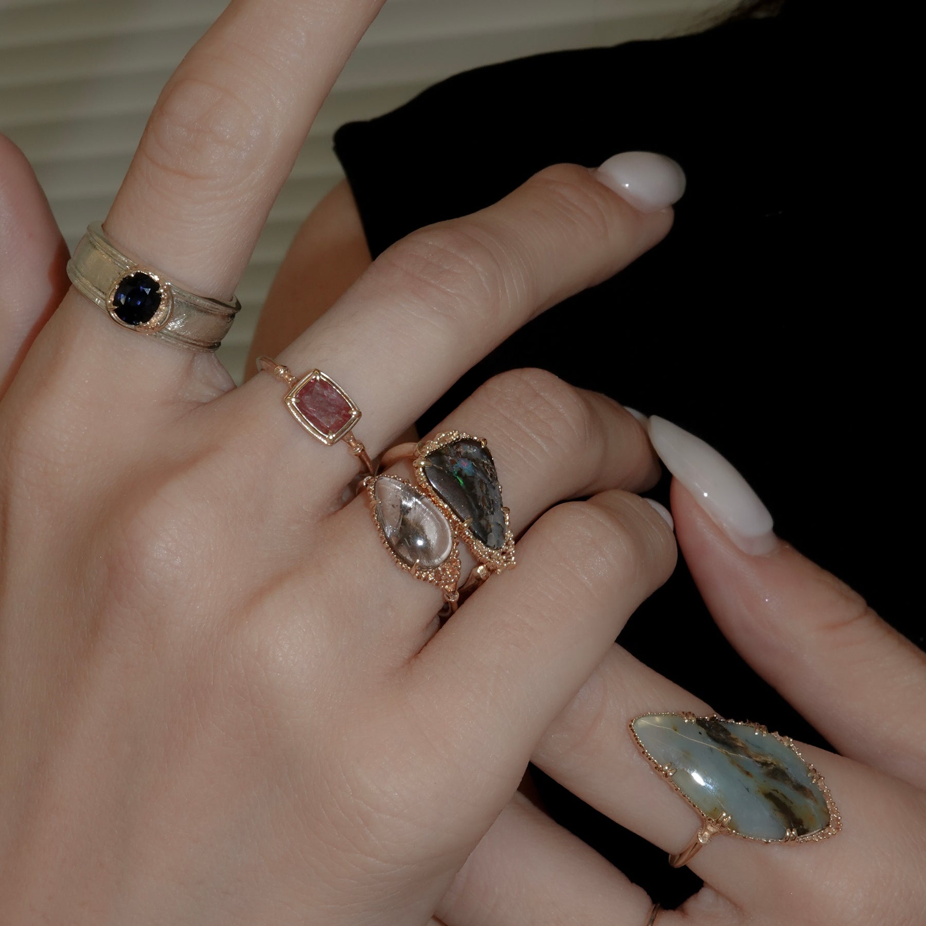 MYACALE JEWELRY(ミャカレ ジュエリー)は1点ずつ石を仕入れ、仕立てている日本のジュエリーブランド。石座やアームには繊細な装飾が施され、一本でも重ね付けでも楽しめる絶妙なバランスのアイテムが揃う。