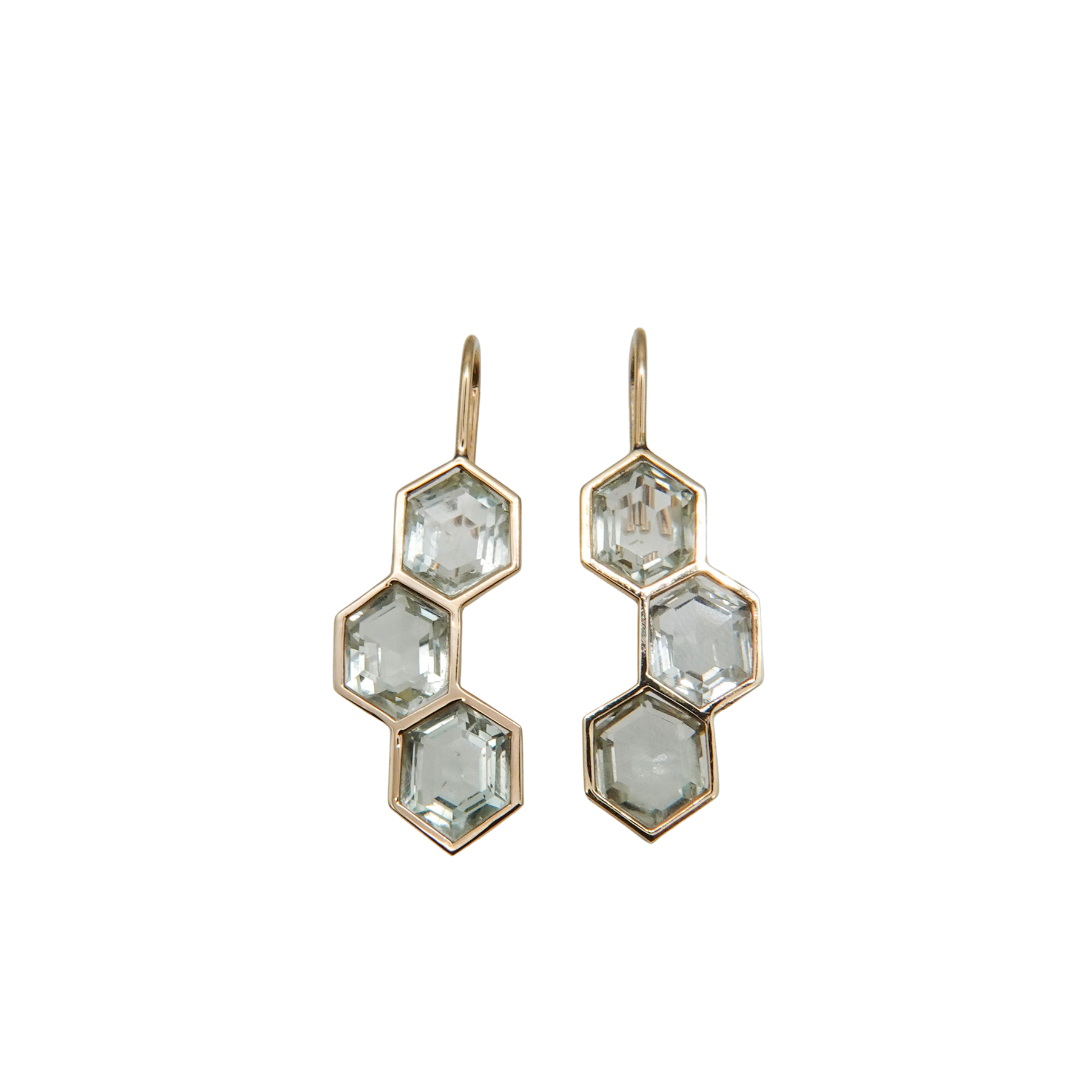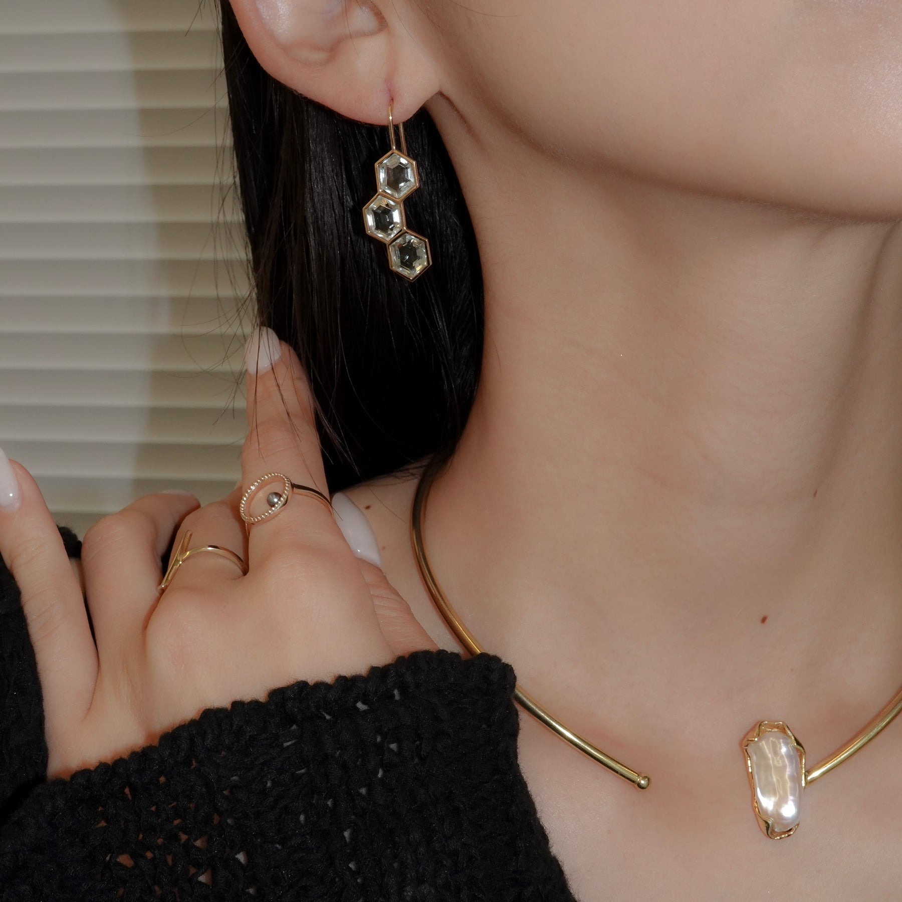 ondeを代表する「Bee Yourself」シリーズ。蜂の巣のような6角形のカラーストーンが印象的なピアスです。グリーンアメジストはブラジル産。「癒し」や「内面の調和」を象徴する石で、淡く透き通るグリーンの輝きは、上品さとナチュラルな美しさを兼ね備え、シンプルながらも印象的。