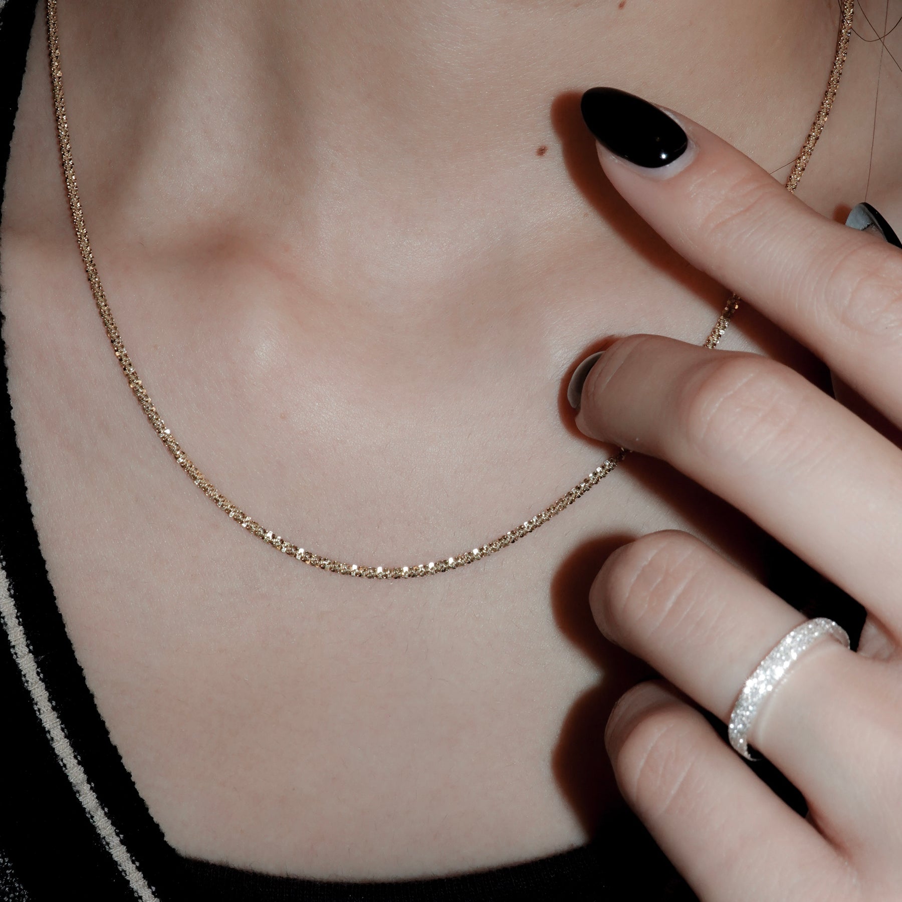 38.5〜44cmまで長さ調整ができるツイストチェーンのネックレス。目の細かいチェーンで繊細な輝きがデコルテをさりげなく華やかにしてくれます。