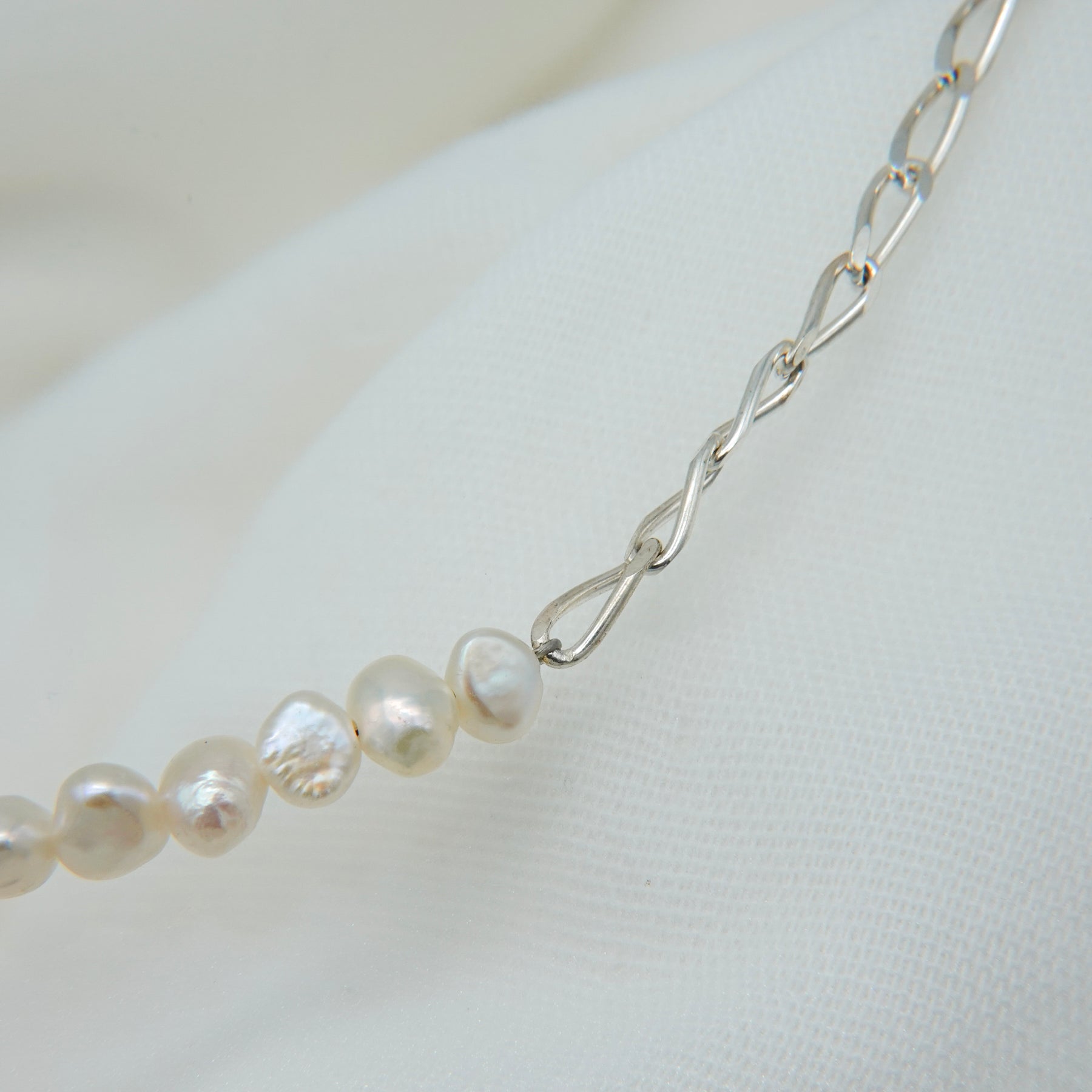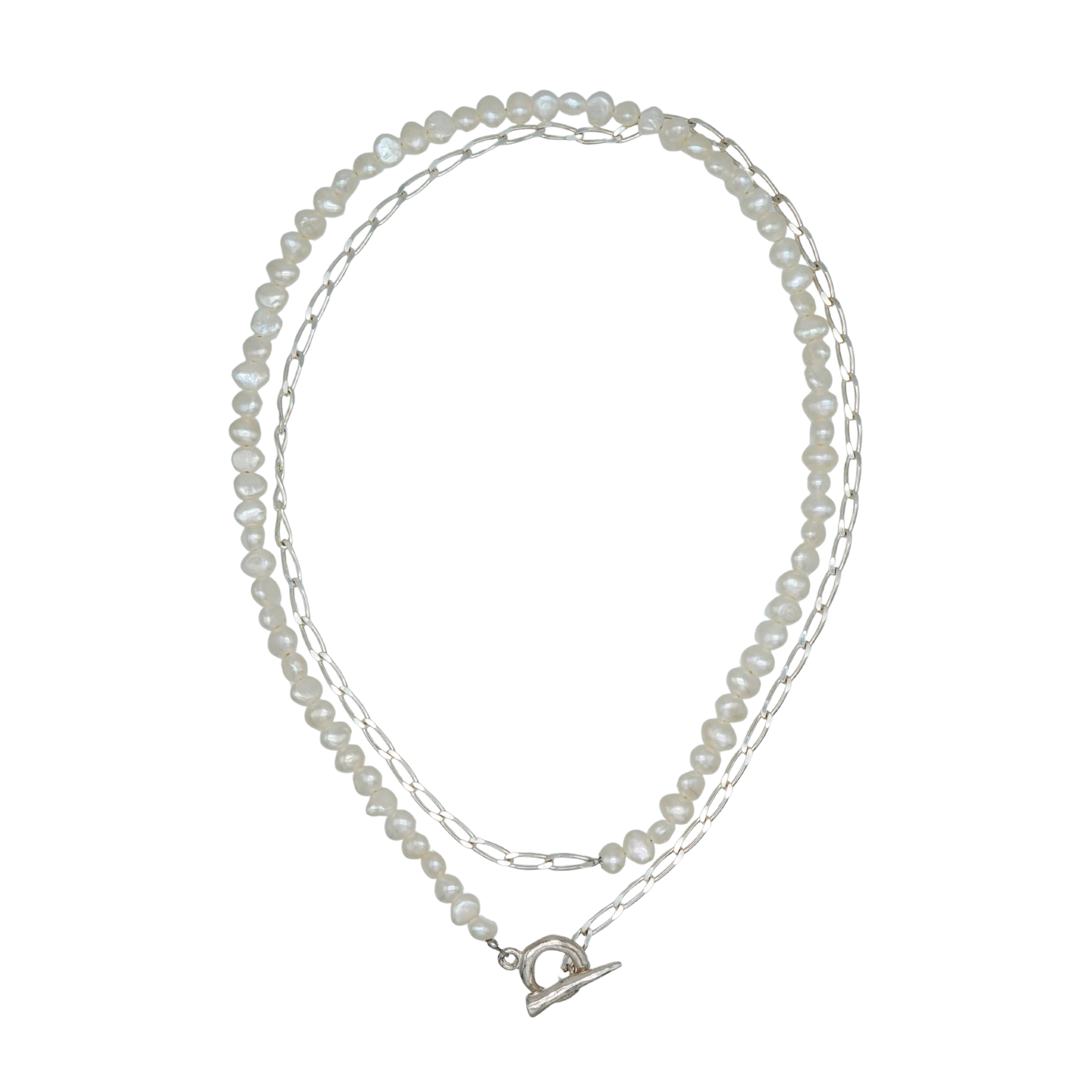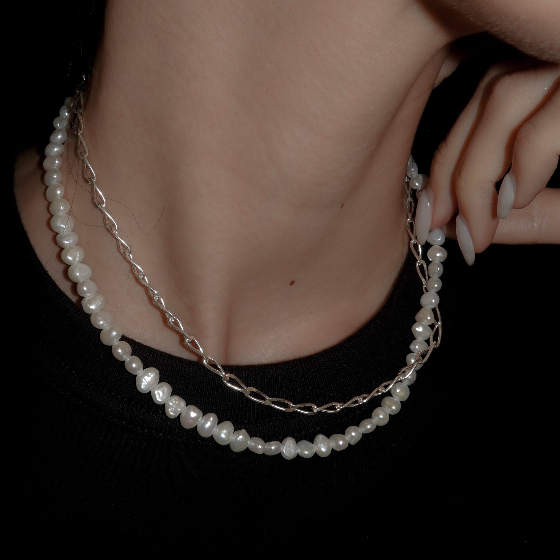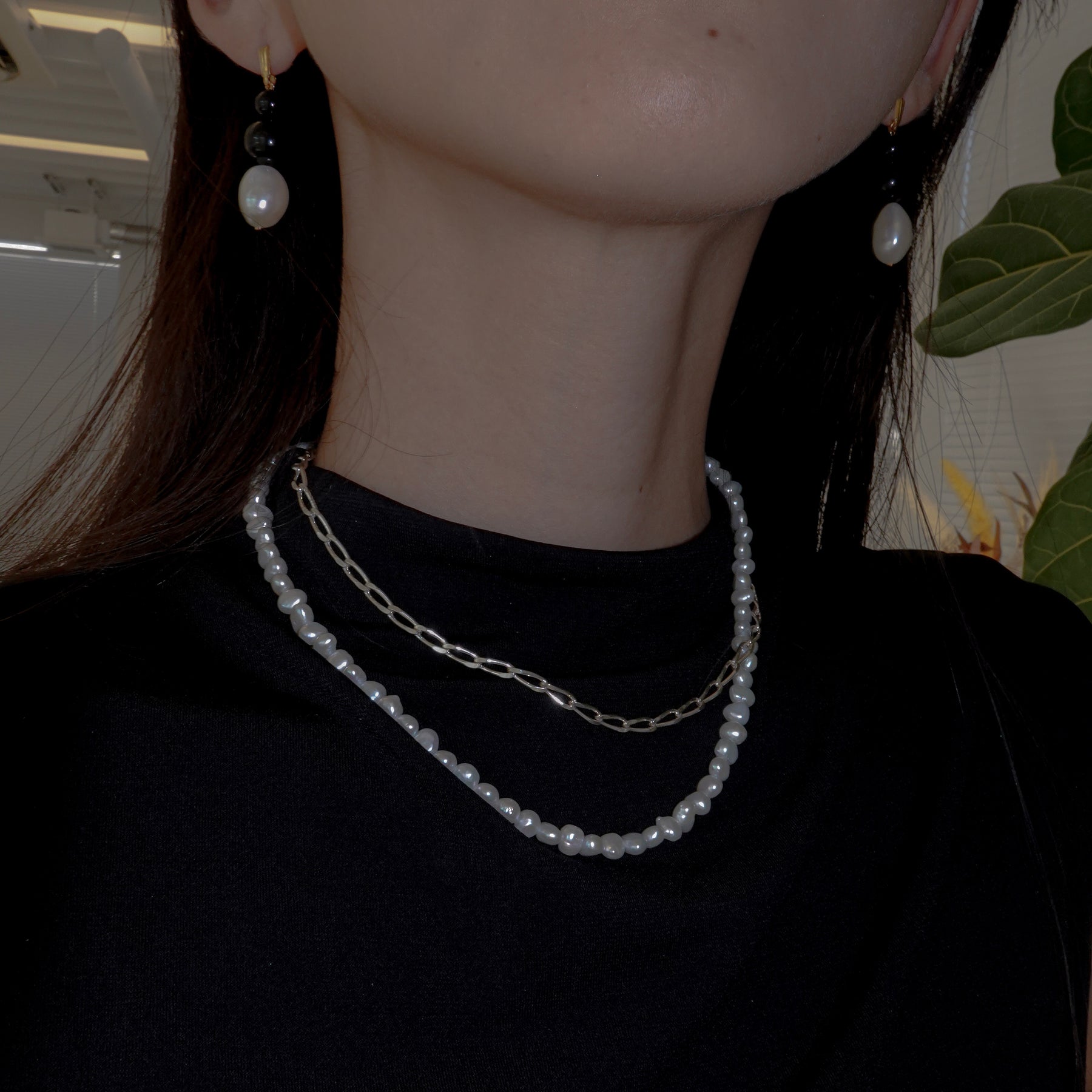 6-7mm玉のバロックパールとチェーンを組合わせたロングネックレス。ロングネックレスとしてお使い頂いても、2連使いでも、またマンテルをフロントに持って来たりと1本で様々な着け方を楽しめるアイテム。
