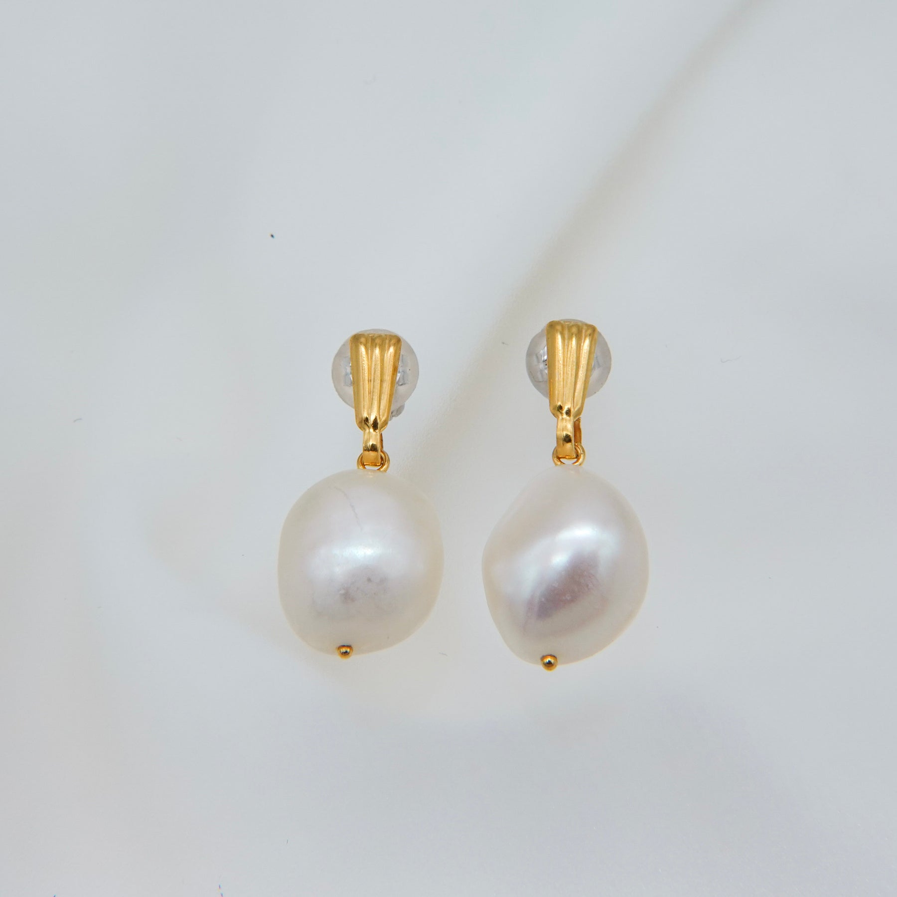 ヴィンテージ感のあるデザインの14-15mm玉のバロックパールピアス。