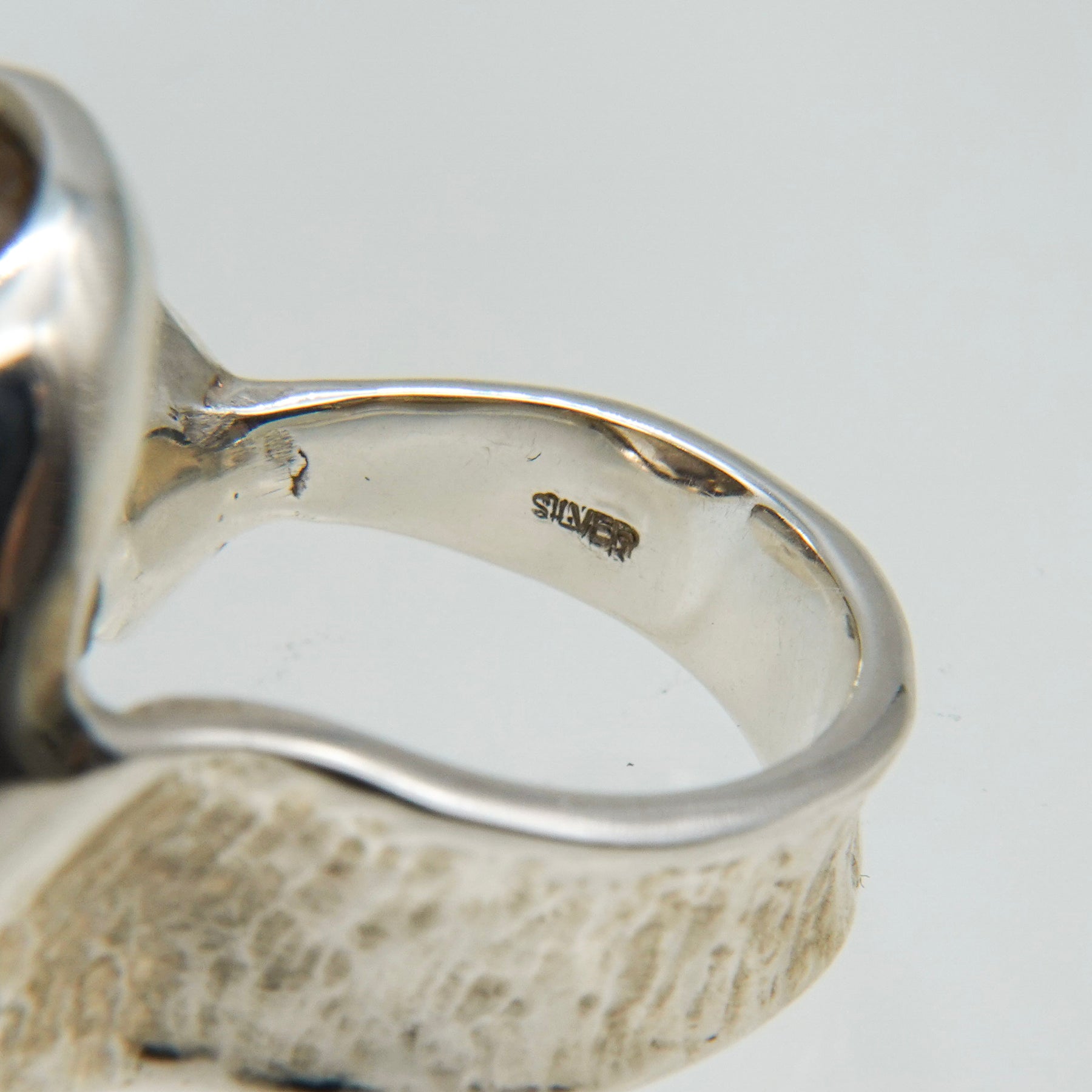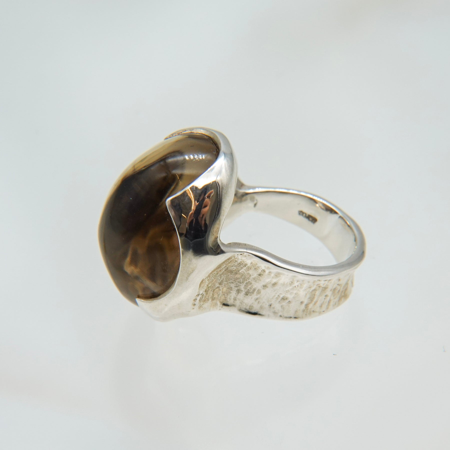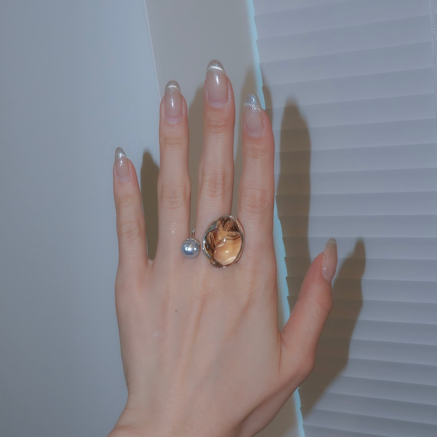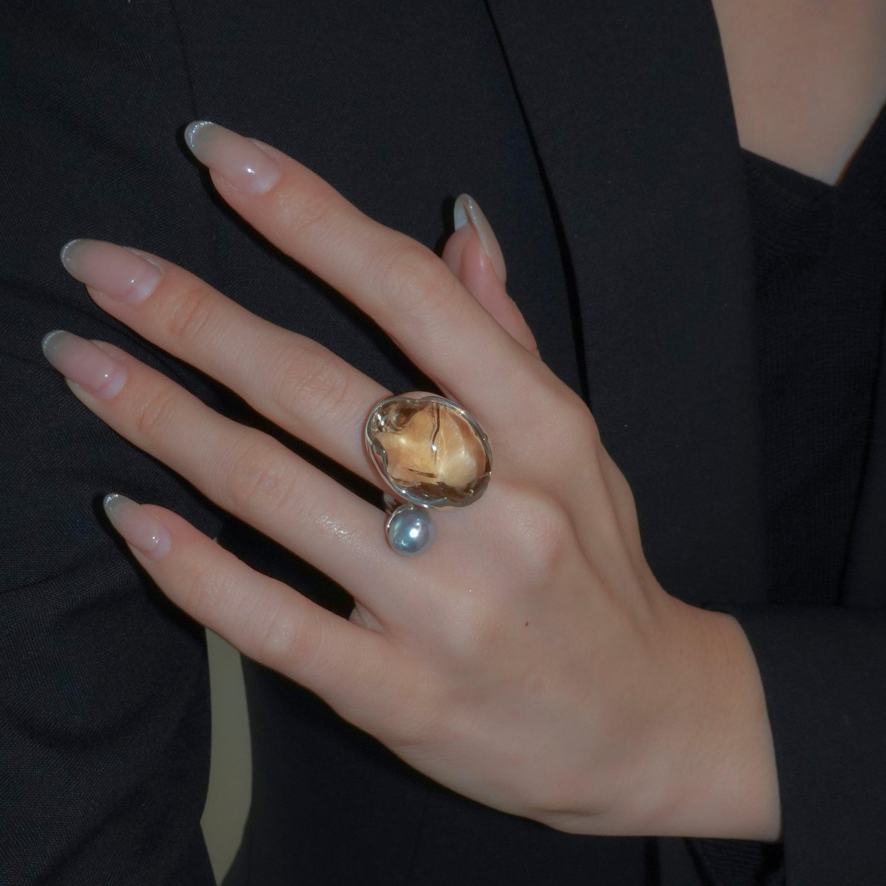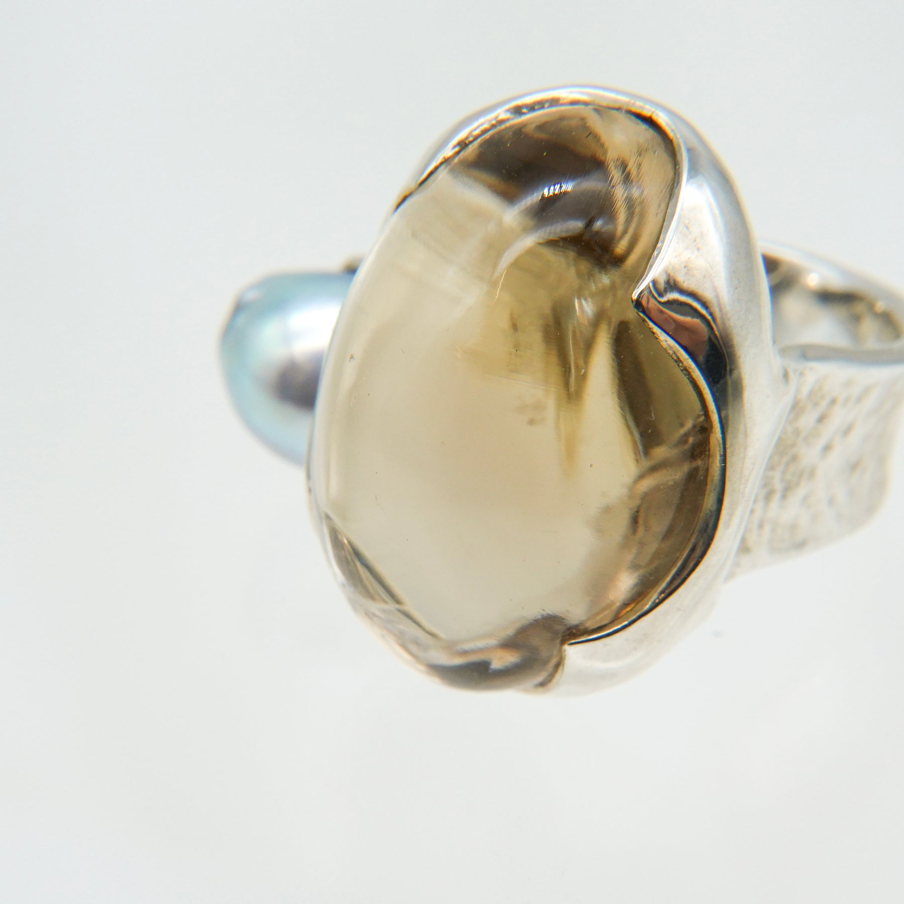 スモーキーな色合いの大ぶりなクォーツをメインストーンに、ブルーのあこやパールを組み合わせたデザインのリング。クォーツは裏側にかっこみ(職人がタガネややっとこを使って原石を切り出す技法)が施された水晶で、正面からは奥行きのある、うるうるとした輝きが見られます。