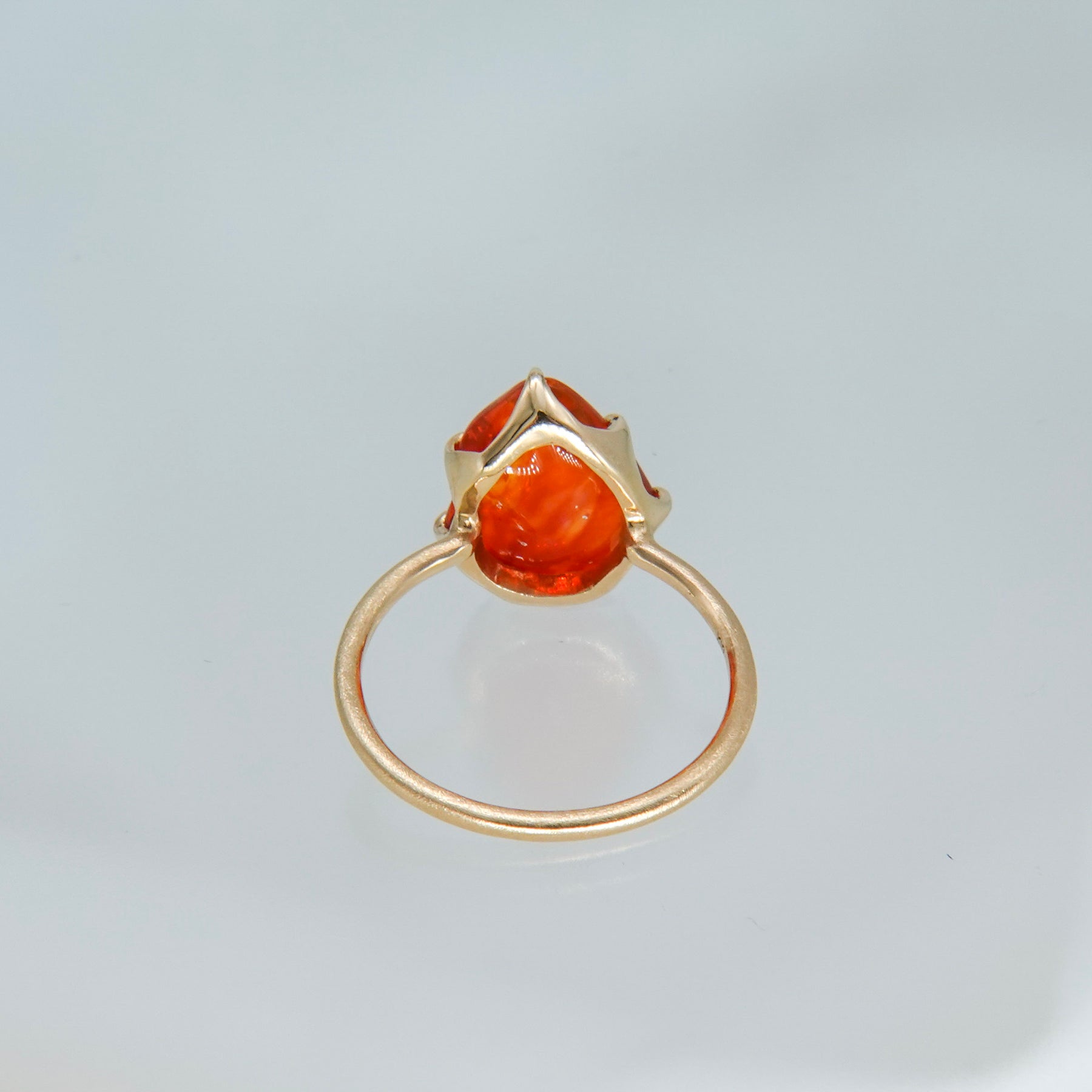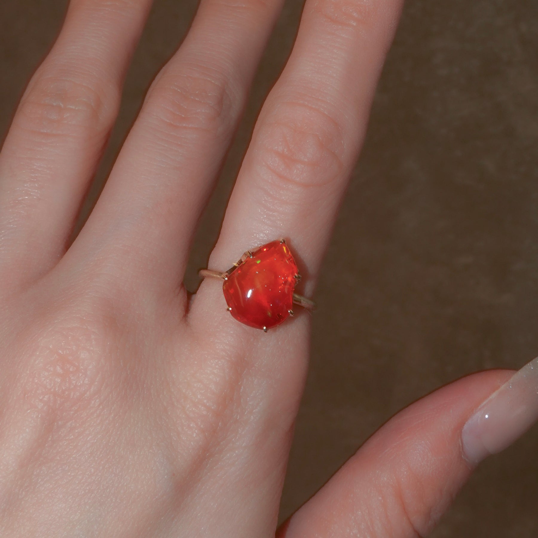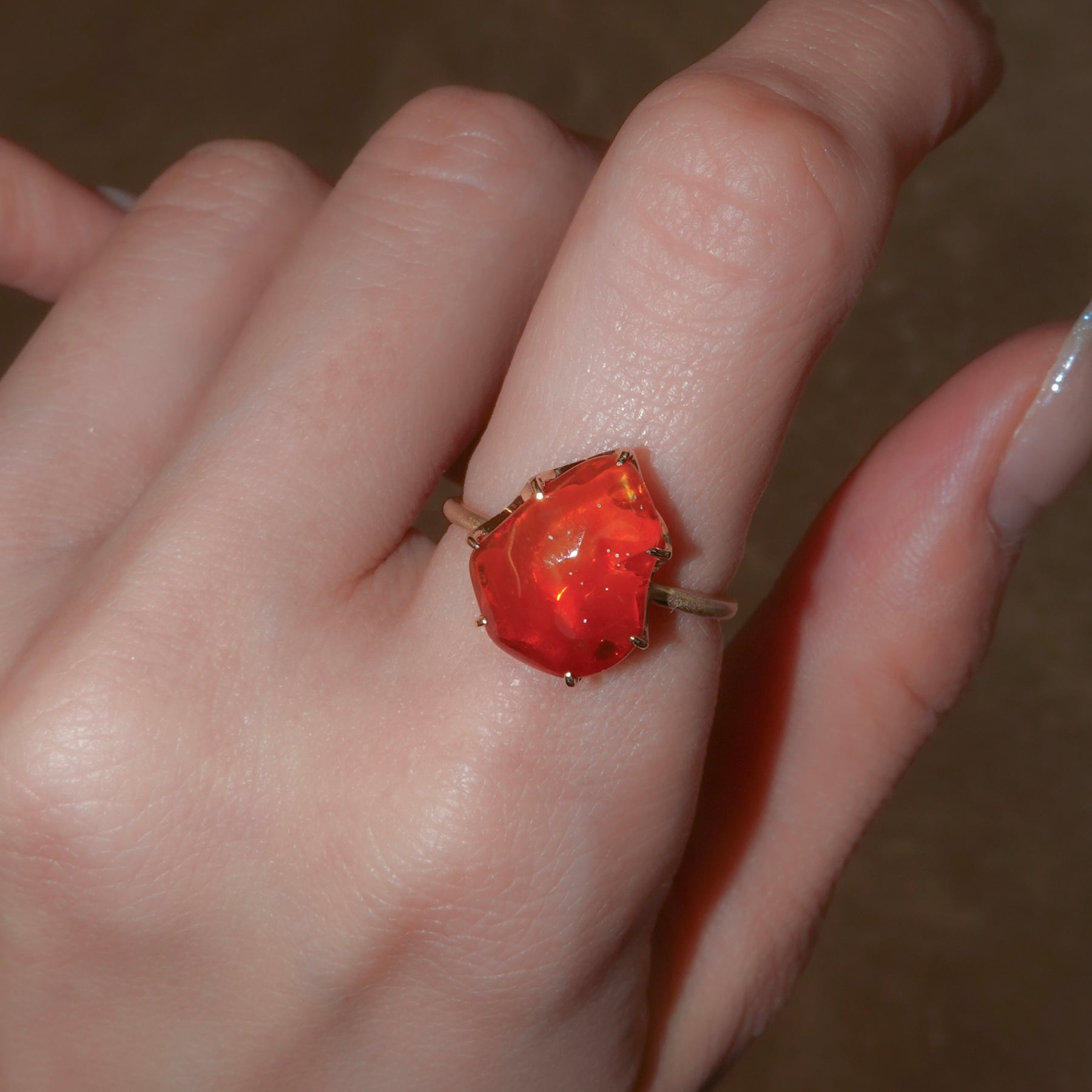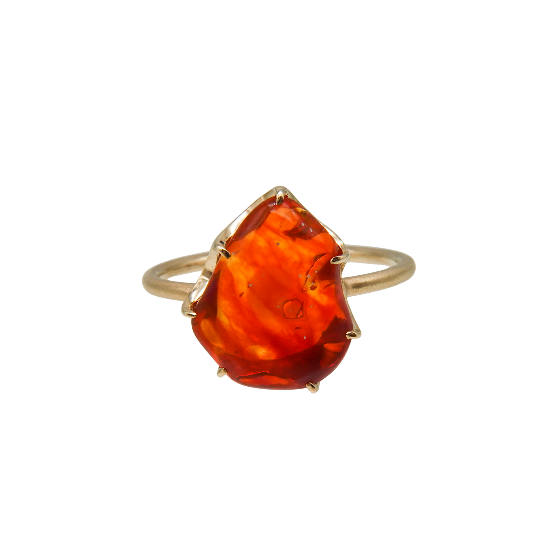 ラフカットのファイヤーオパールリング。ペアシェイプに近いフォルムのファイヤーオパールで、赤からオレンジにかけての鮮やかな発色が特徴です。表面にはラフカット特有の凹凸があり、石本来の質感を楽しめます。リングアームは幅1.5mmのマットゴールド仕上げ。