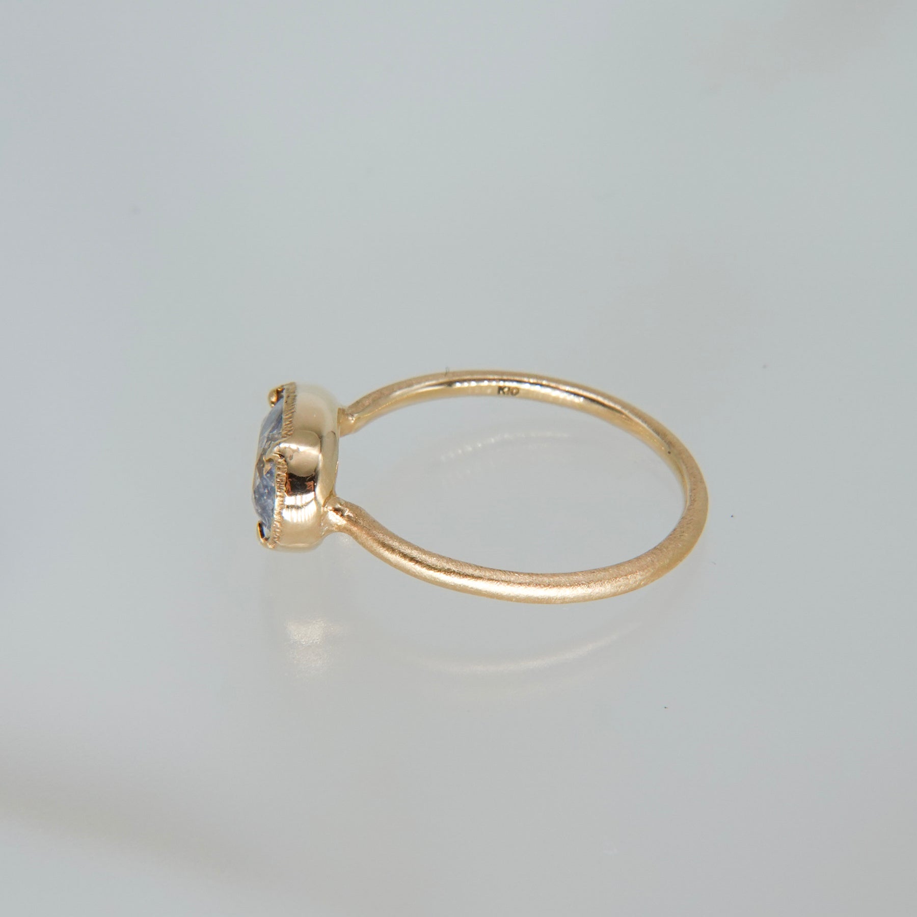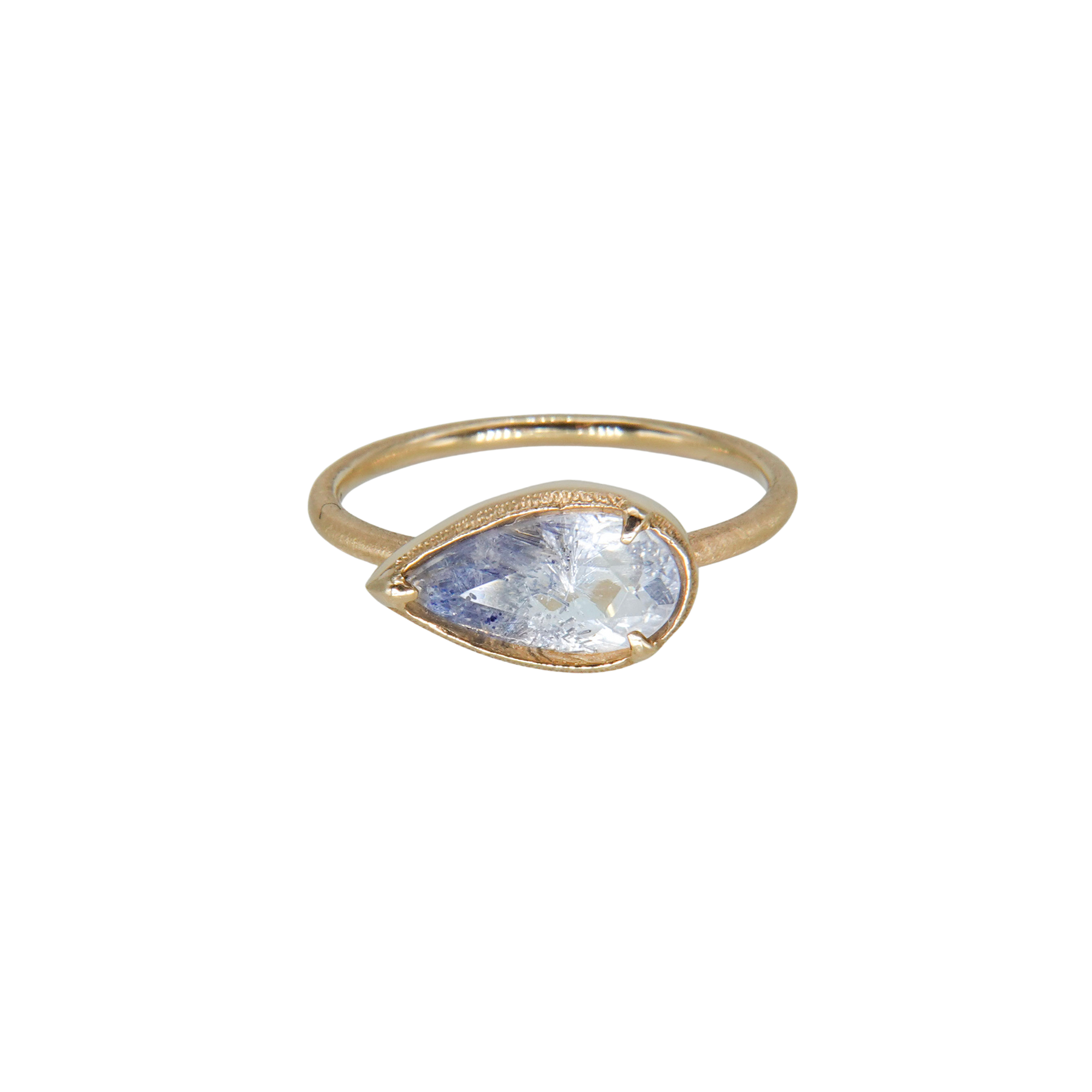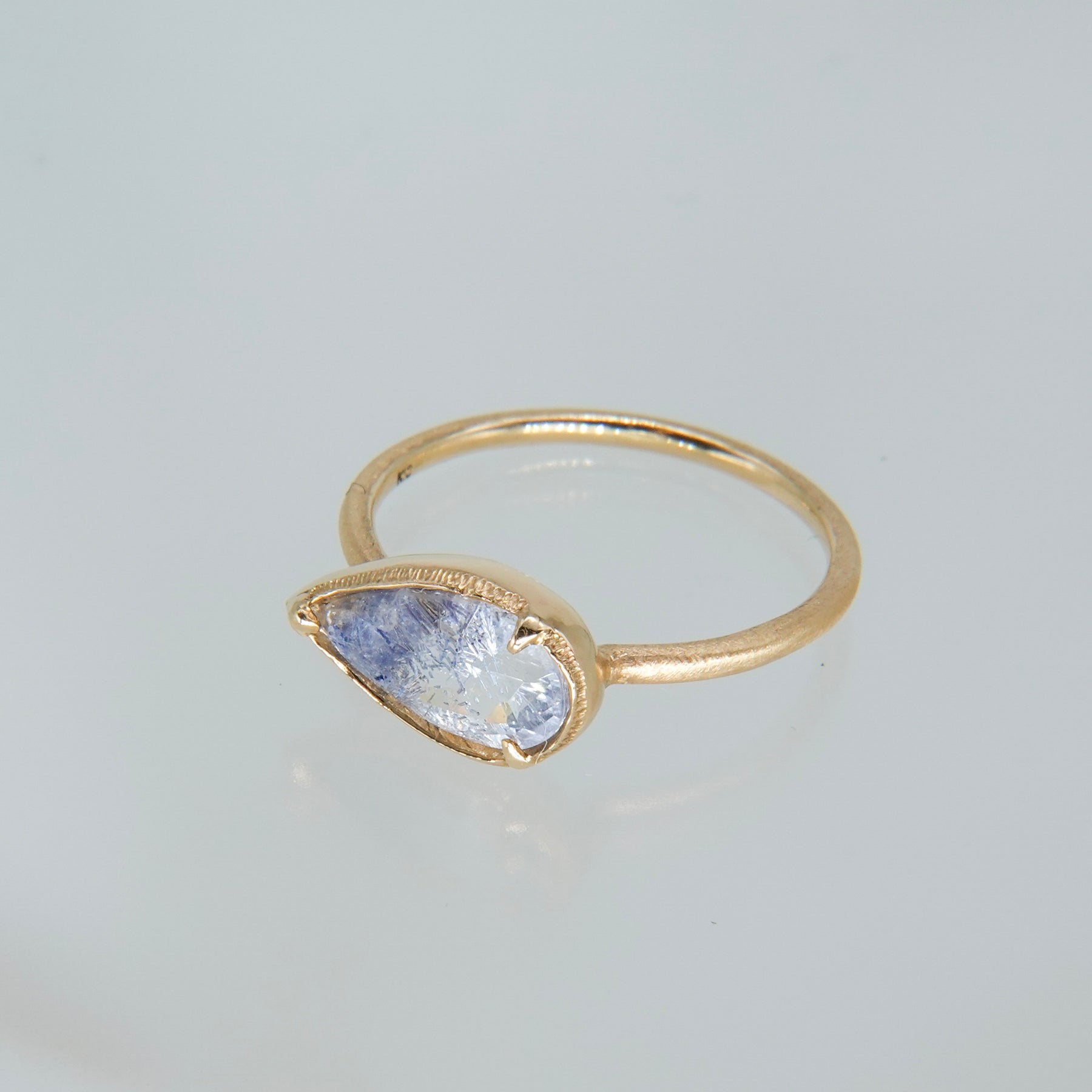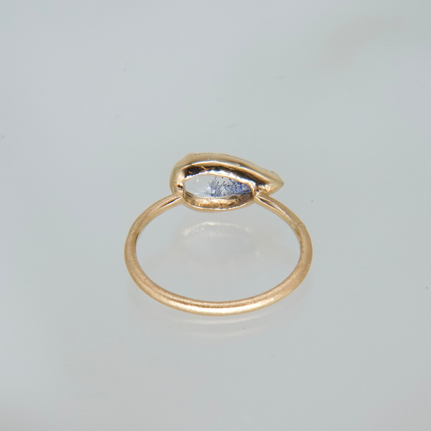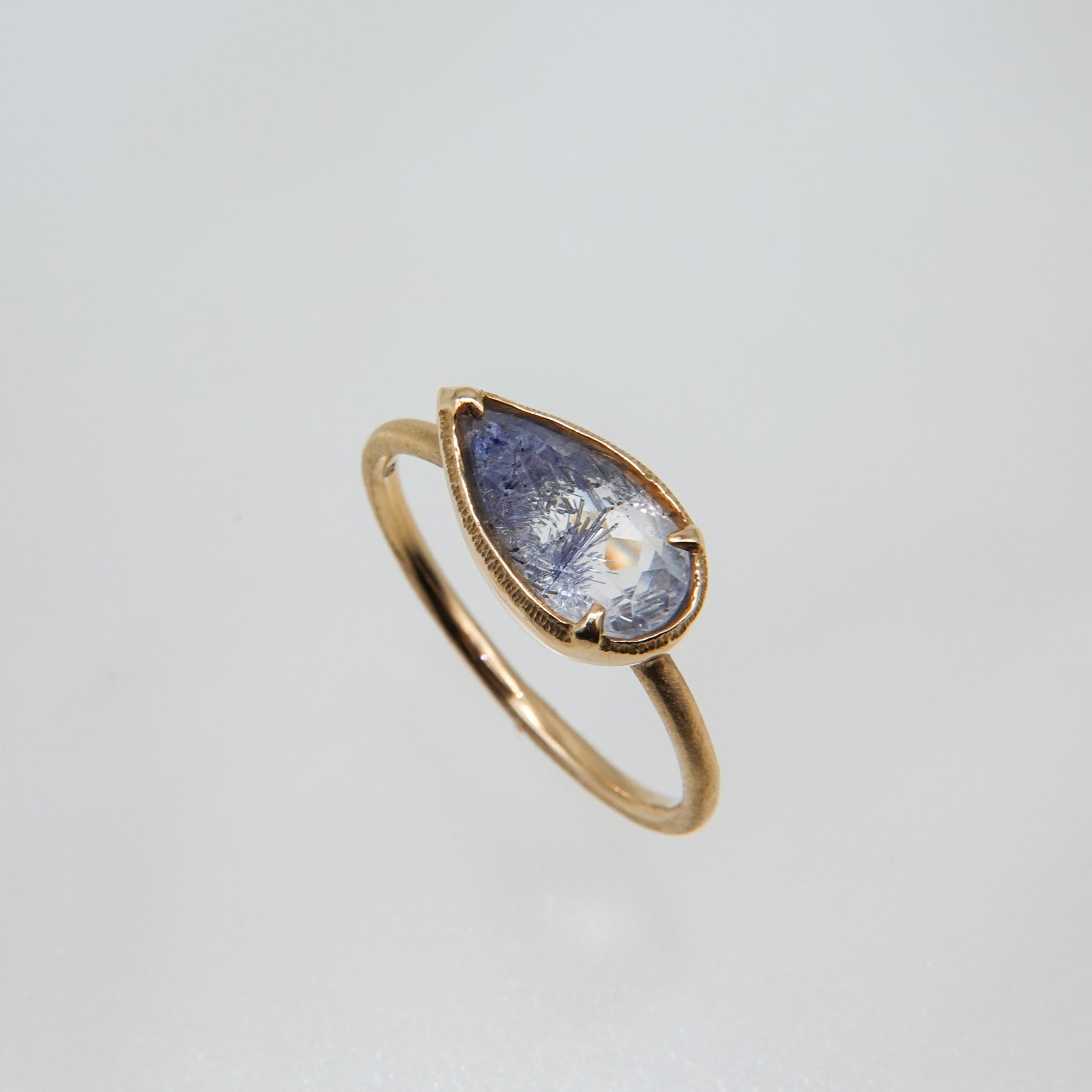 ペアシェイプ型のデュモルチェライトインクォーツリング。透明なクォーツの中にデュモルチェライトが内包された石で、先端には淡いブルーの発色が見られ、丸みのある側はクリアな表情を楽しめます。リングアームは幅1.5mmのマットゴールド仕上げ。