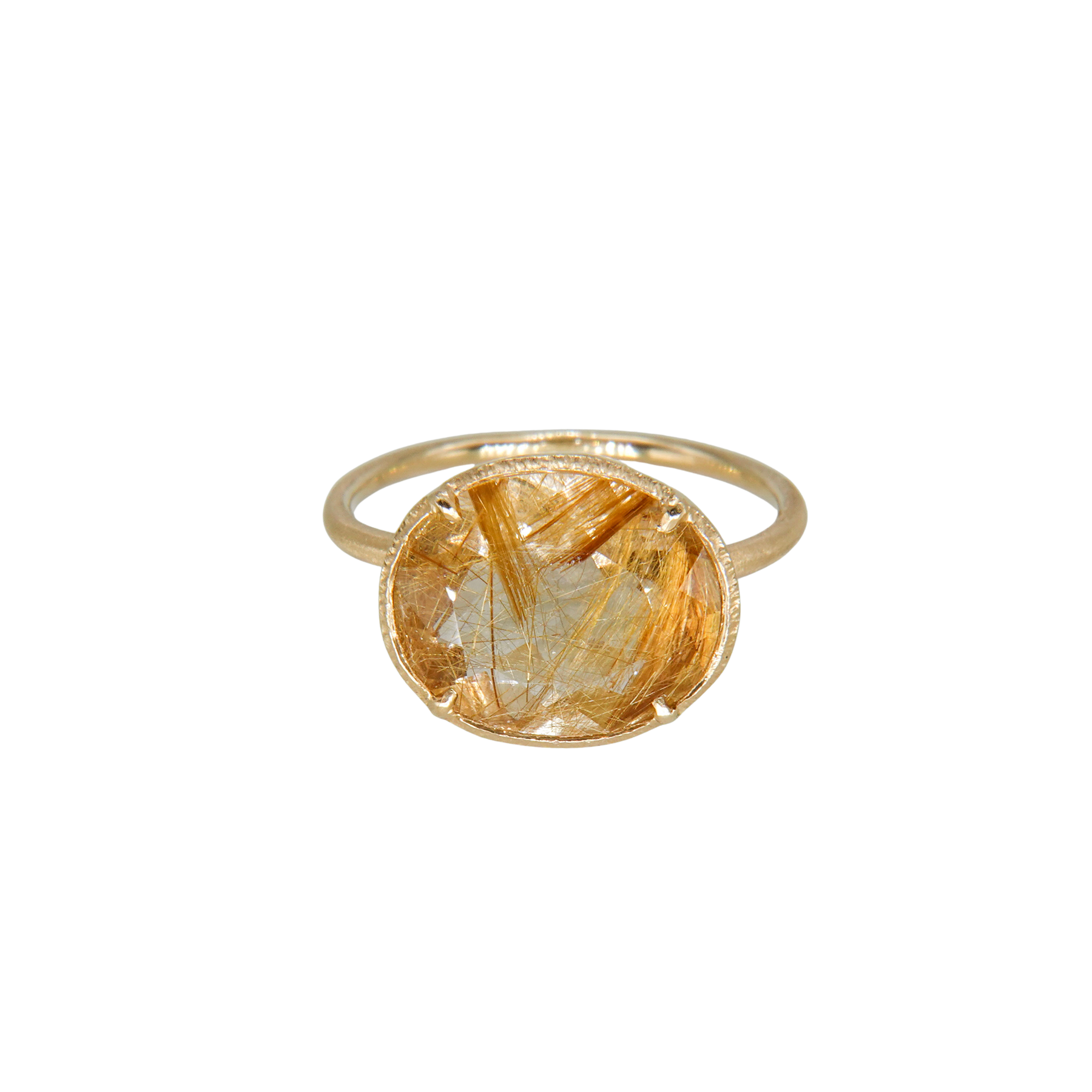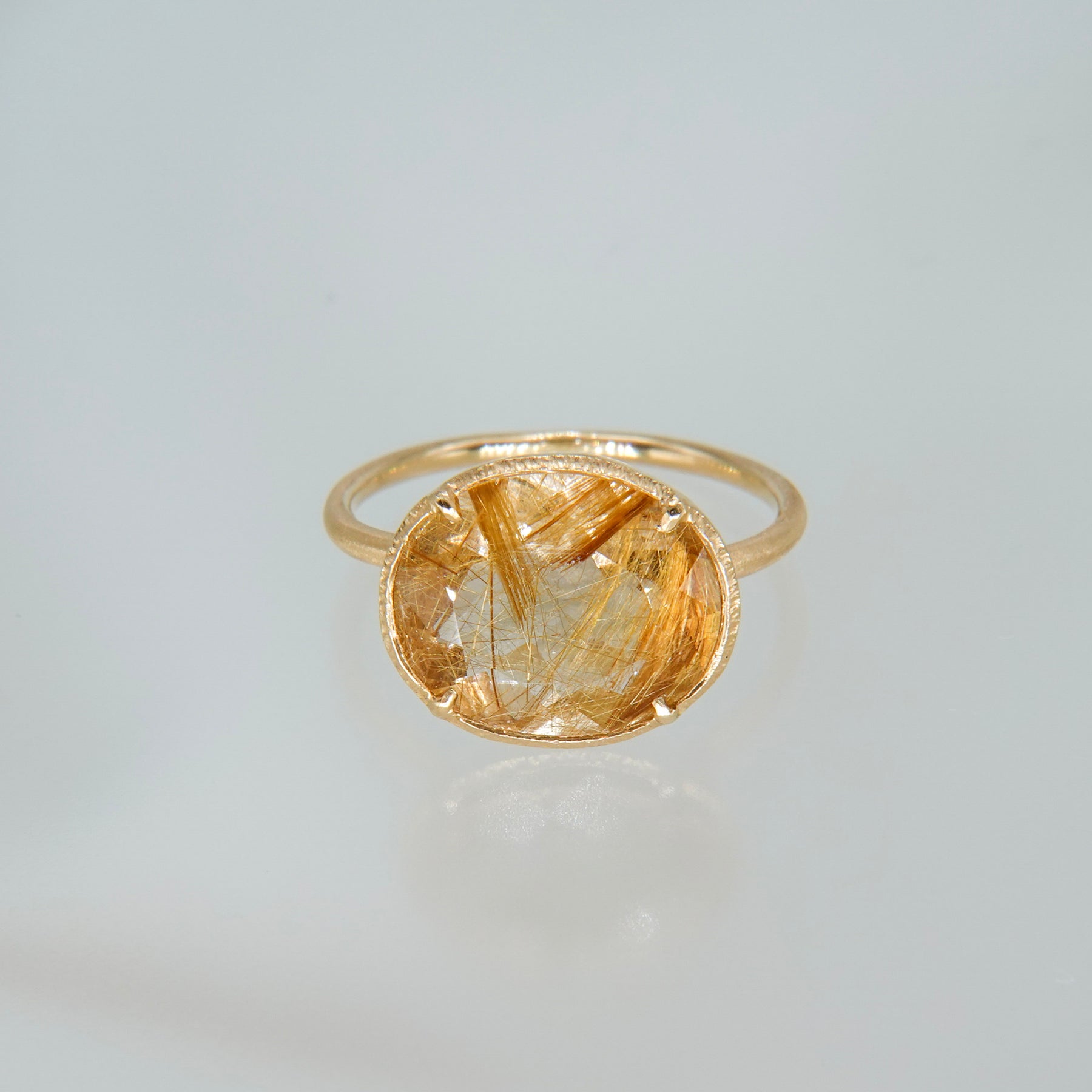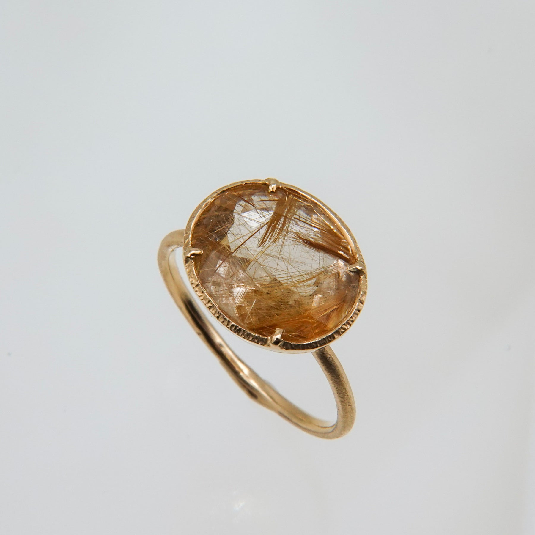 オーバル型のルチルクォーツリング。透明なクォーツの中に針状のルチル結晶を多く内包した石で、内包物と透明感のコントラストが特徴です。リングアームは幅1.5mmのマット仕上げ。