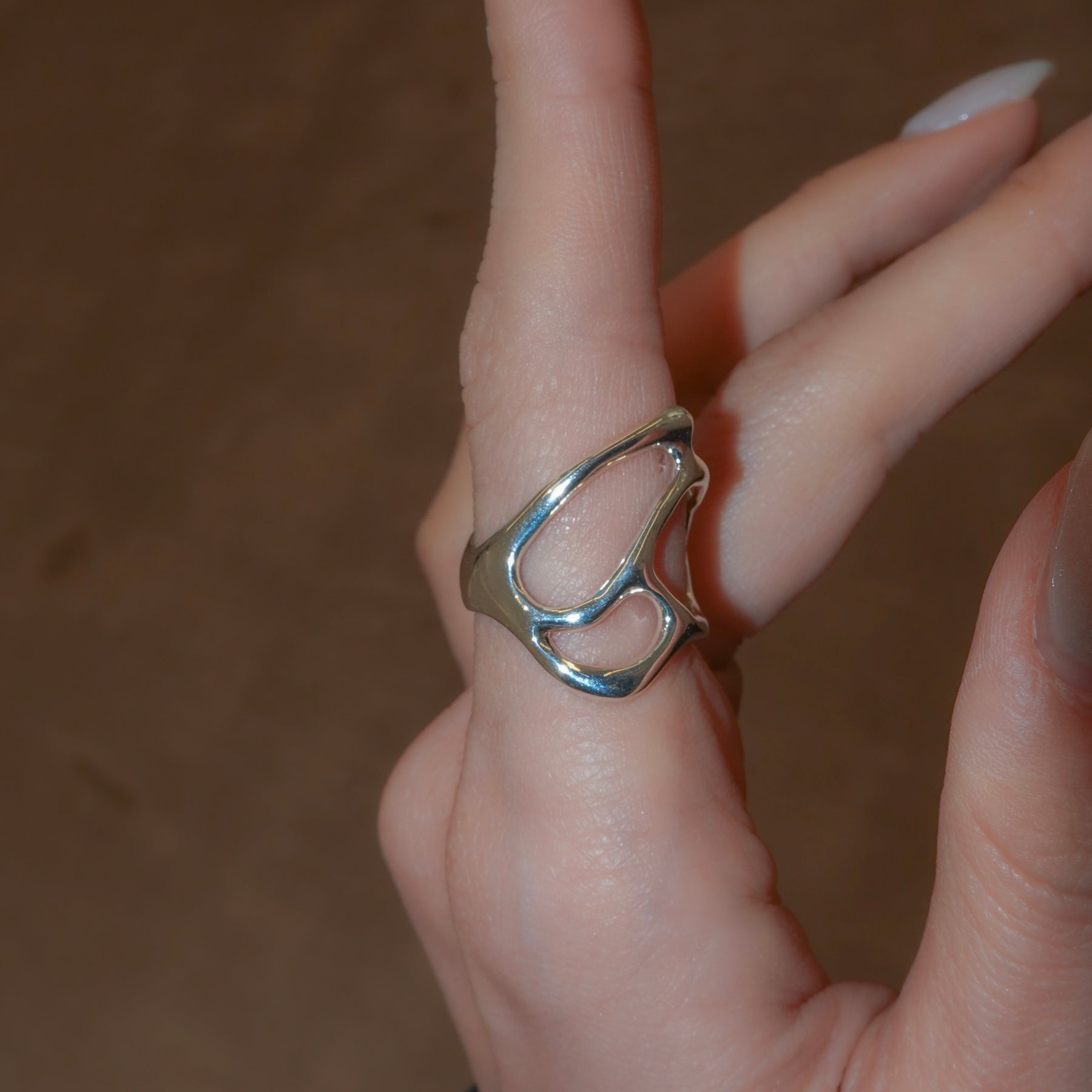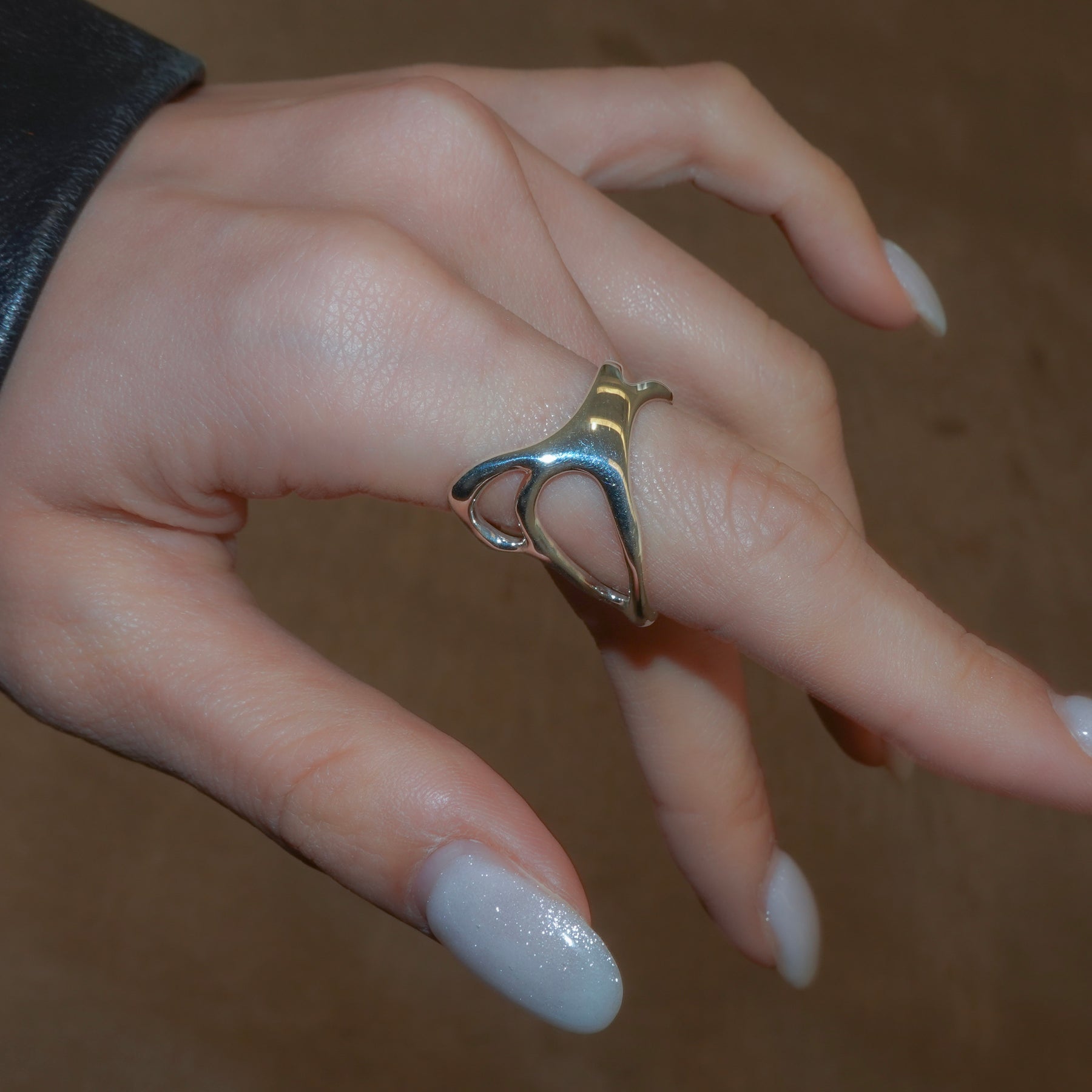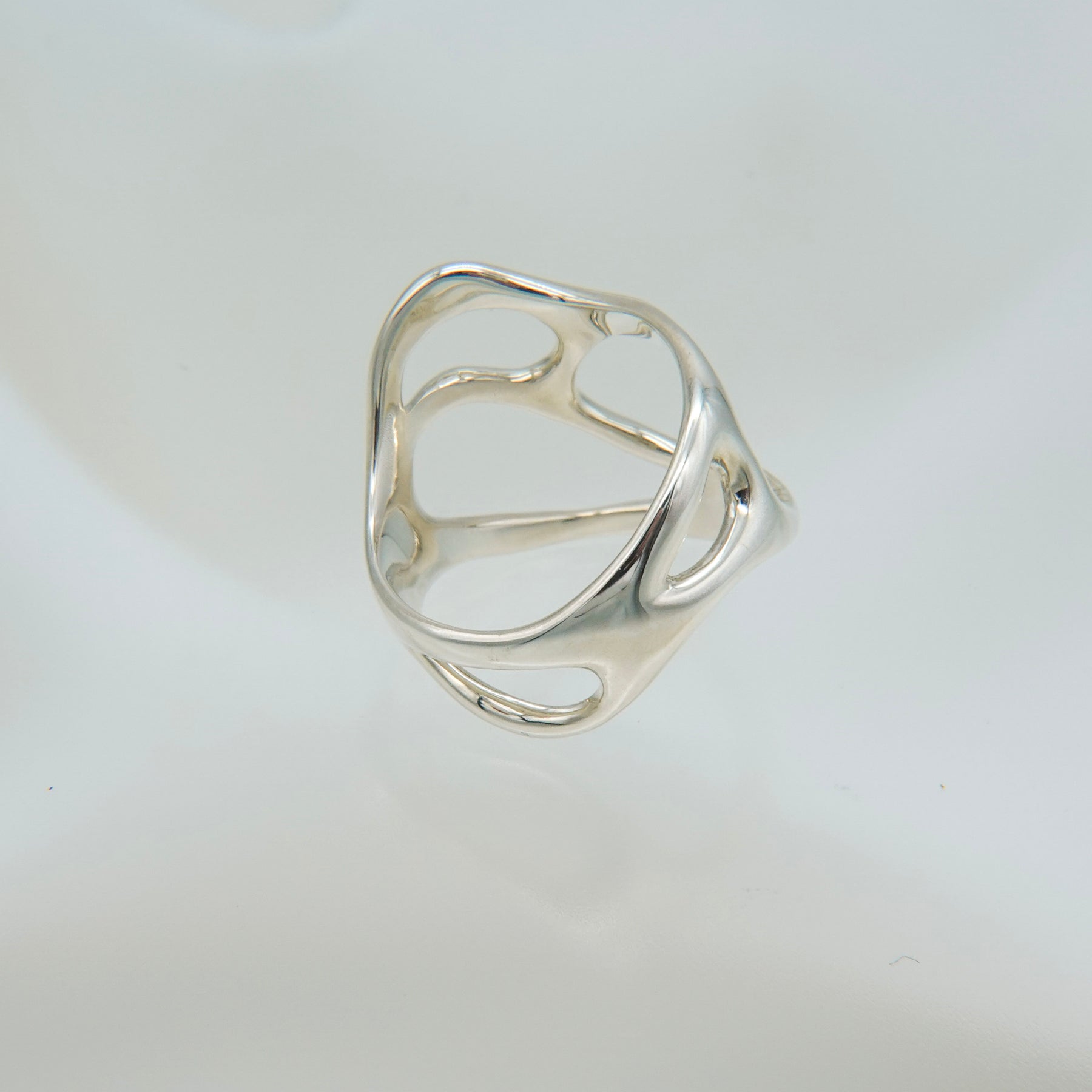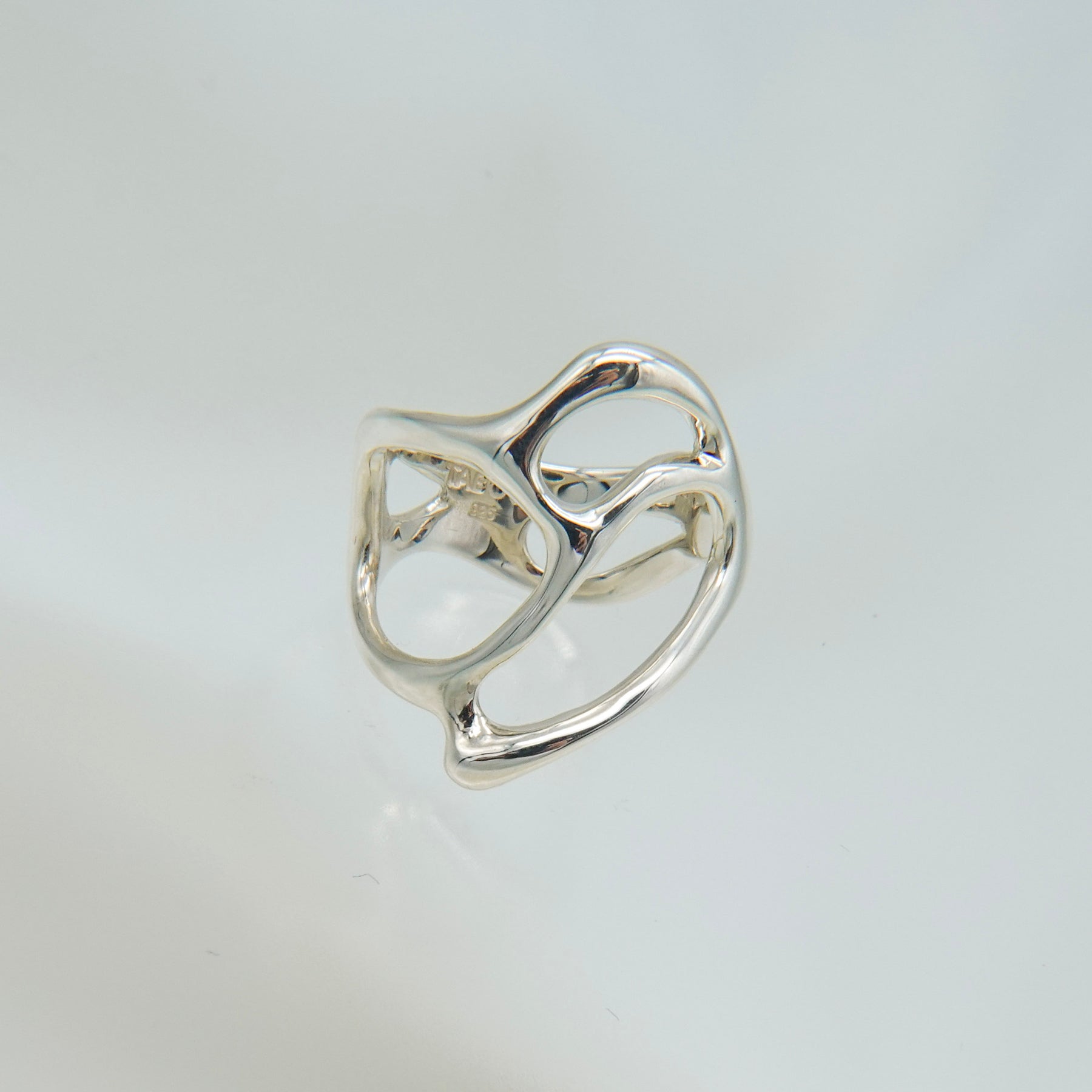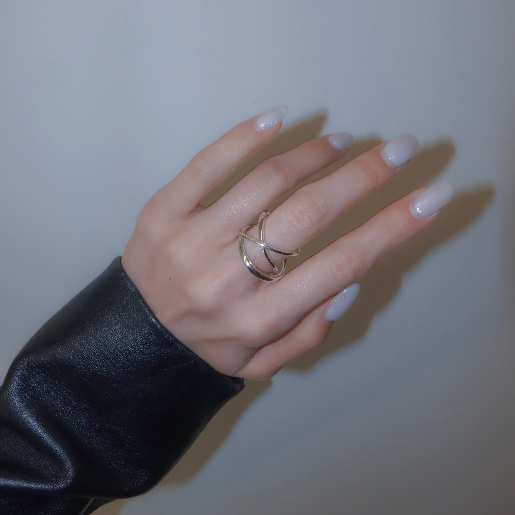 輪郭のみを描くようなオープンフォルムが印象的な、立体的なボリュームを持つリングです。