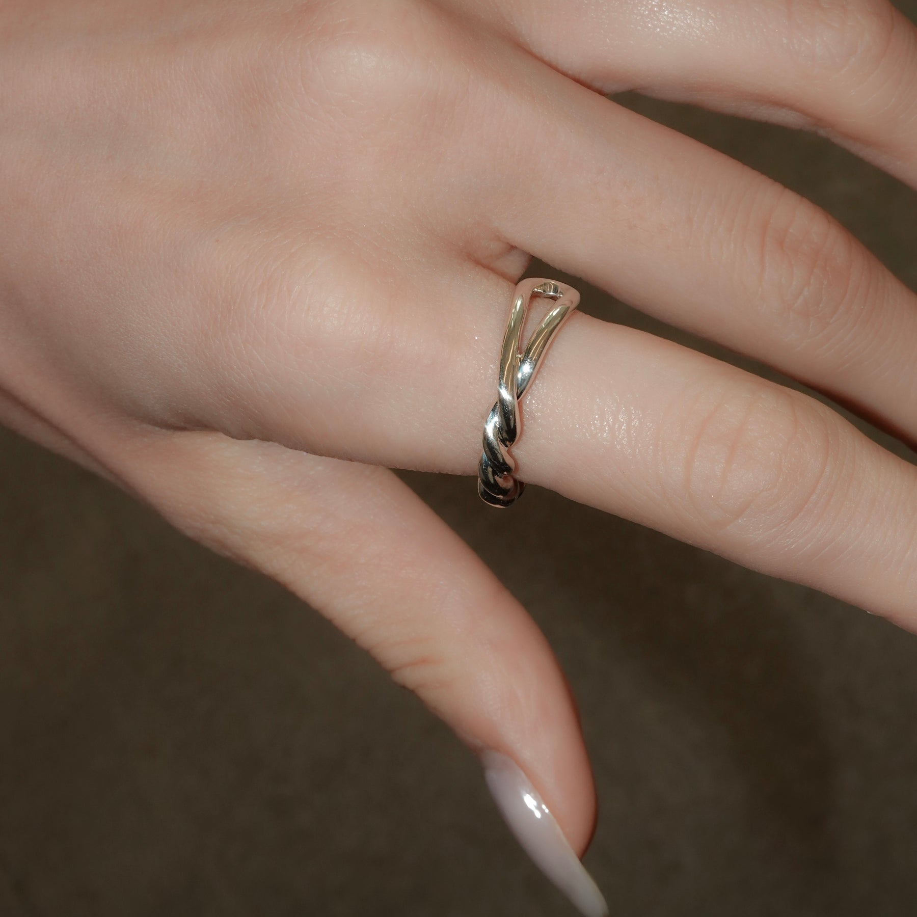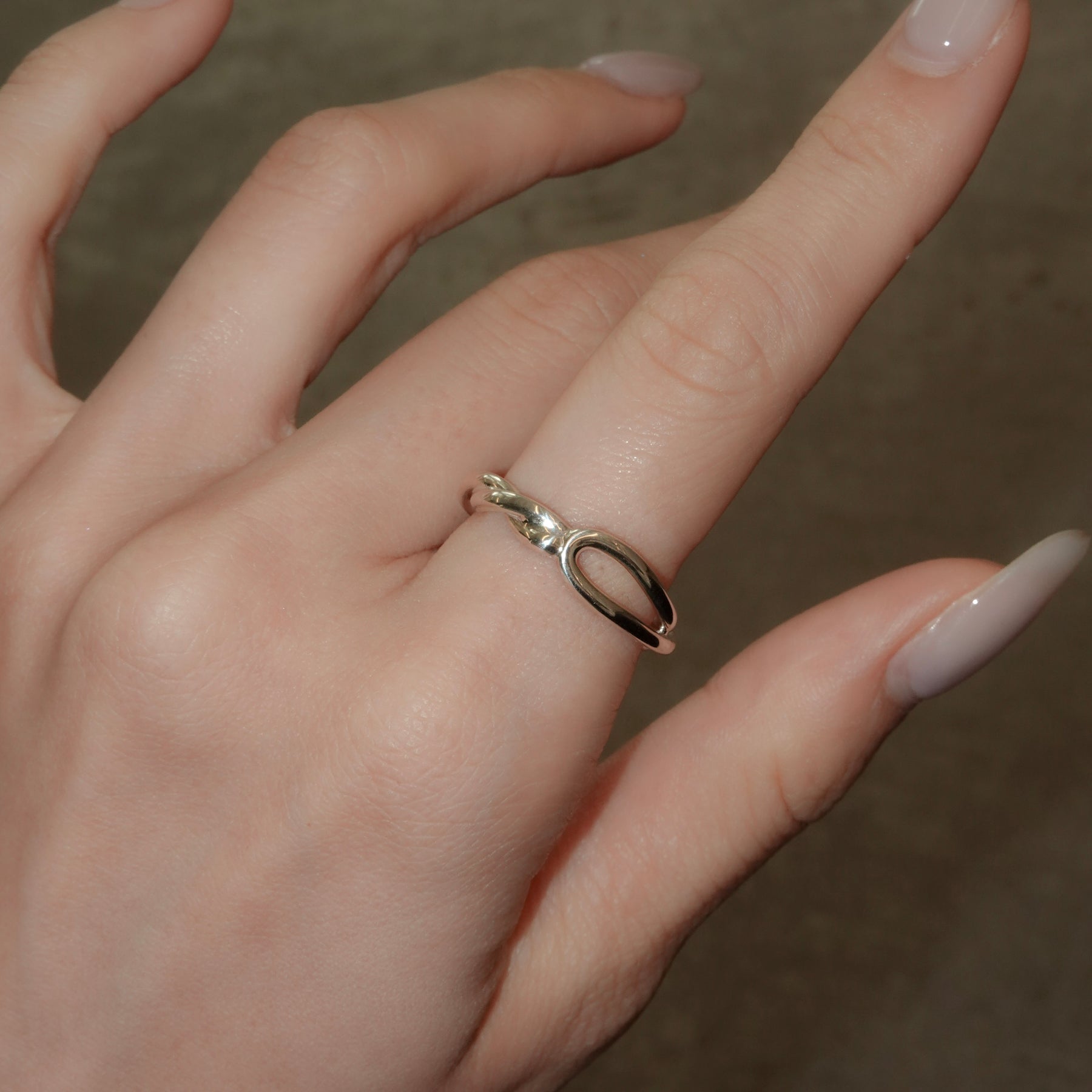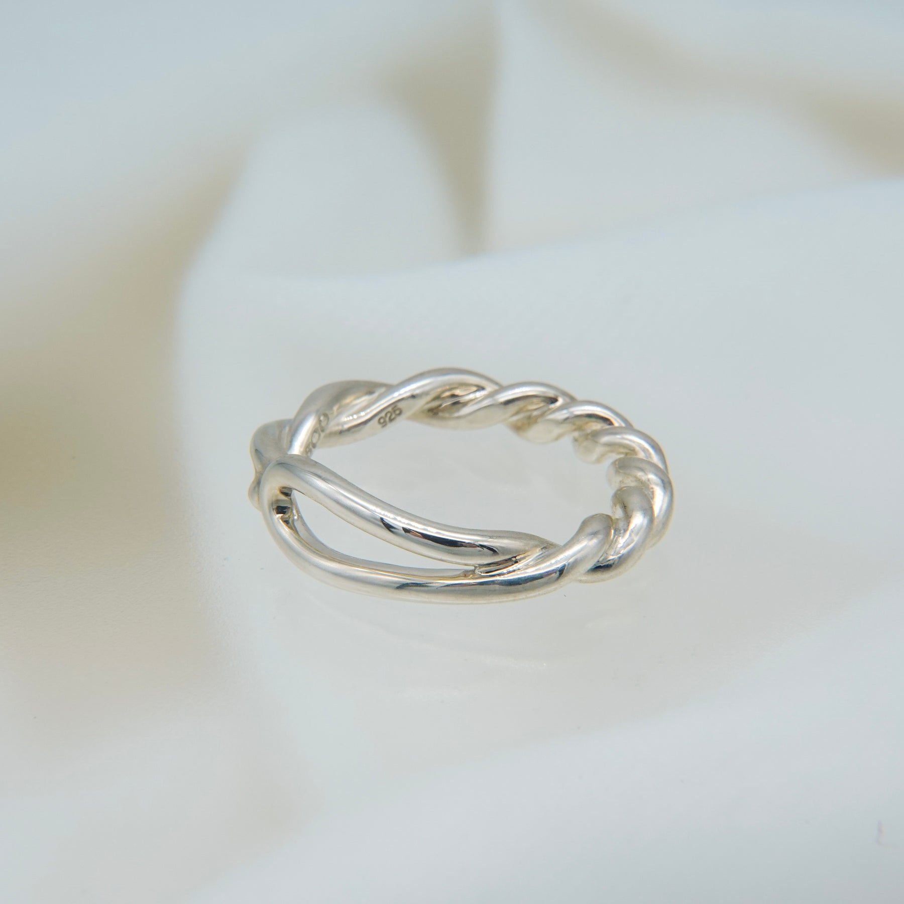 緩やかにひねられた構造が指に沿って流れるように配置され、 フロントには柔らかな曲線のモチーフを。
