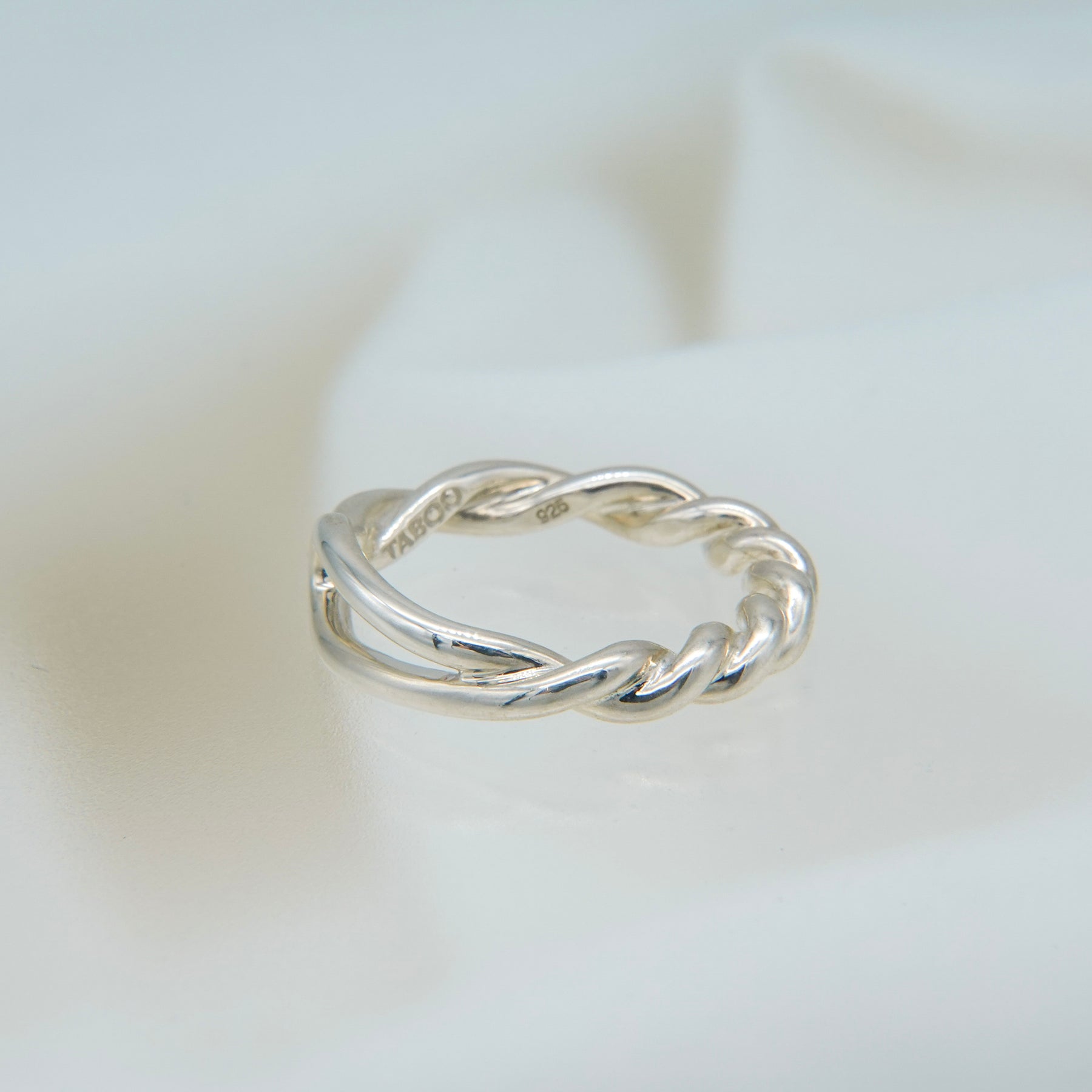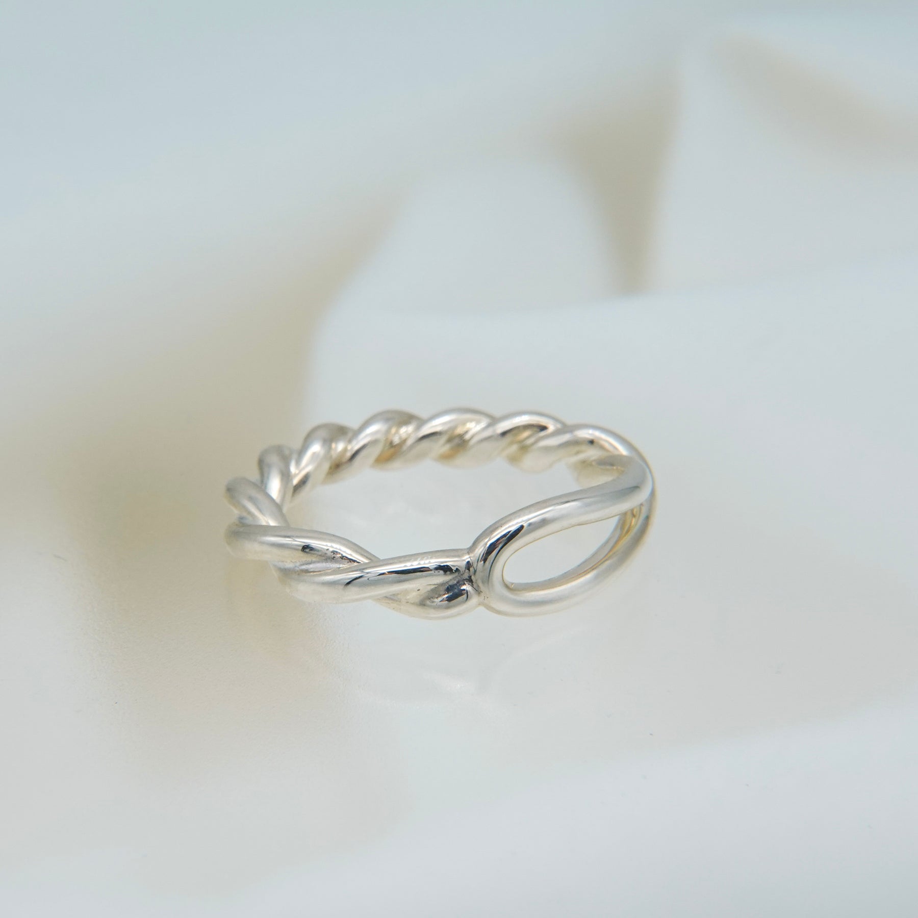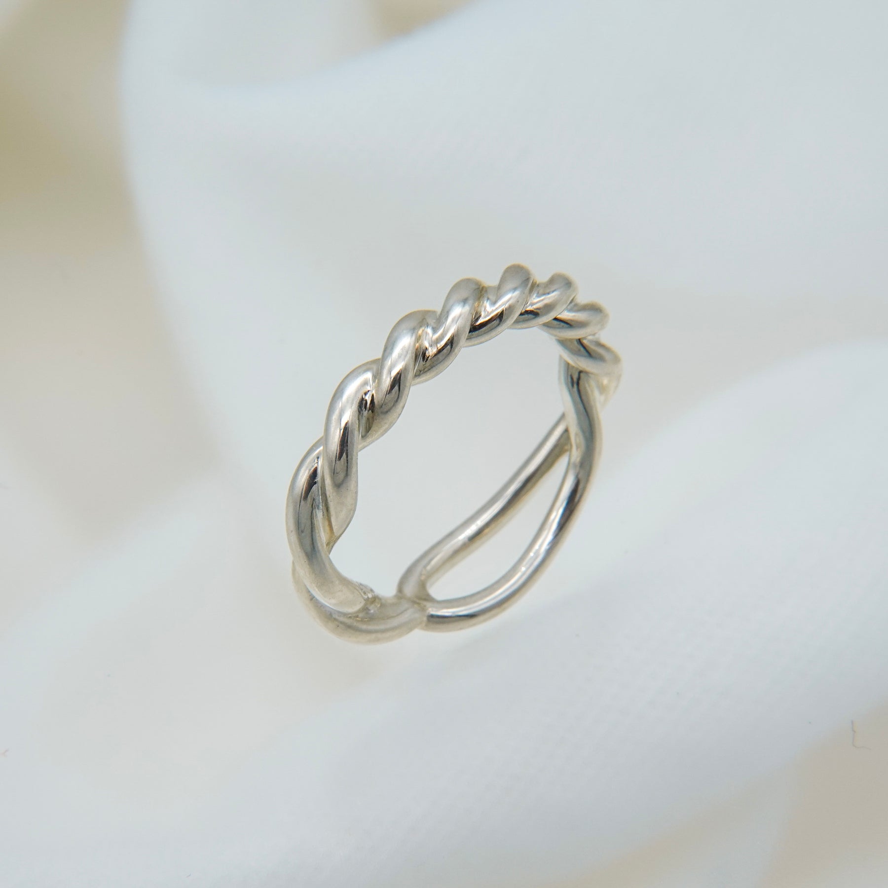 緩やかにひねられた構造が指に沿って流れるように配置され、 フロントには柔らかな曲線のモチーフを。