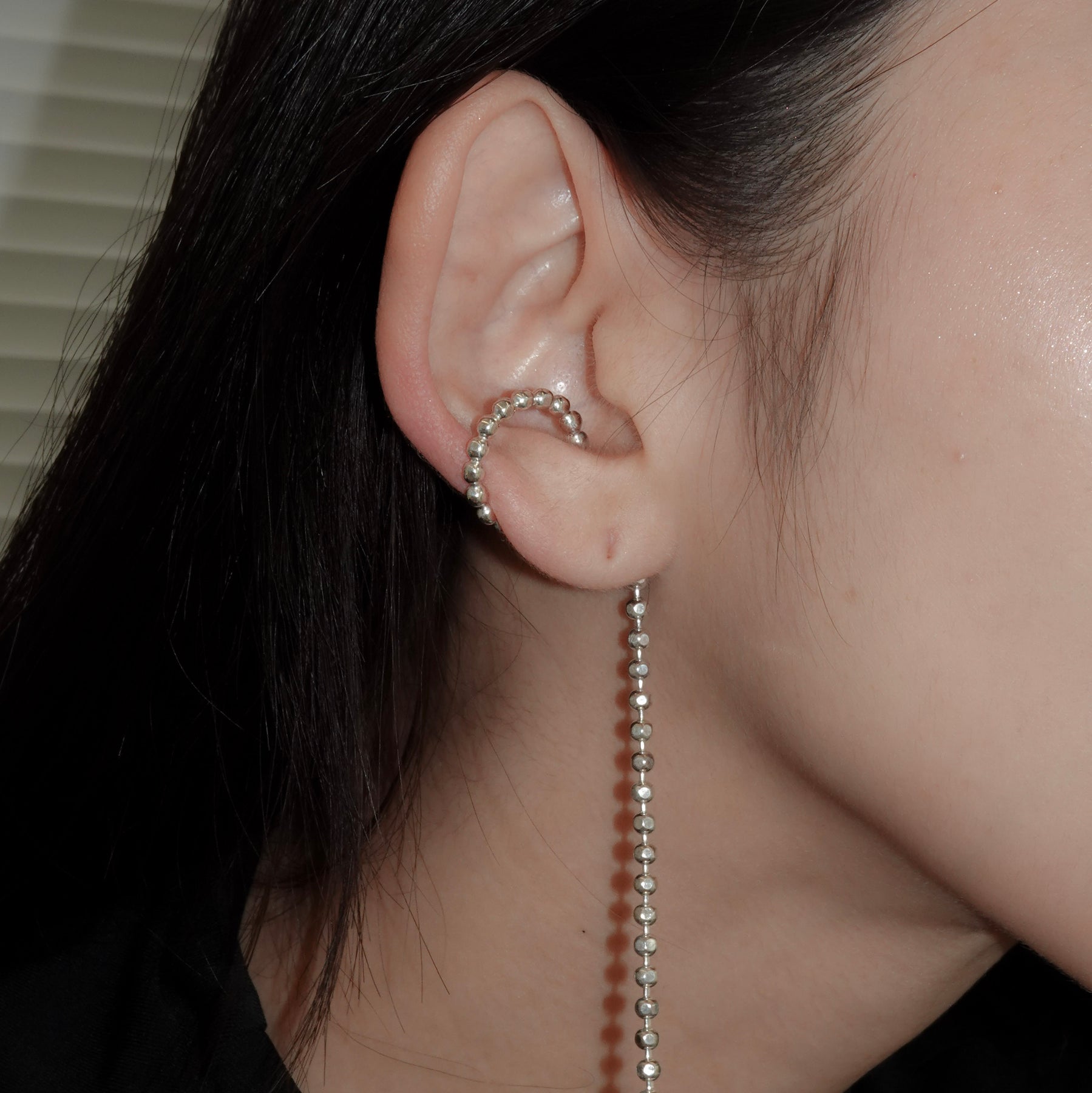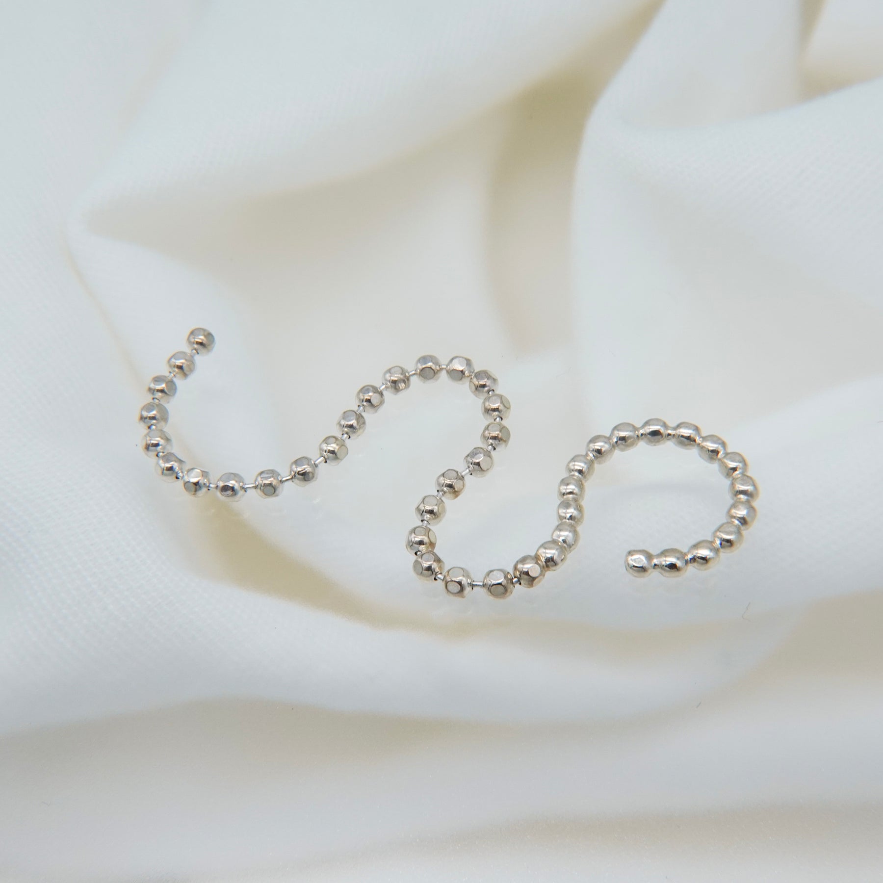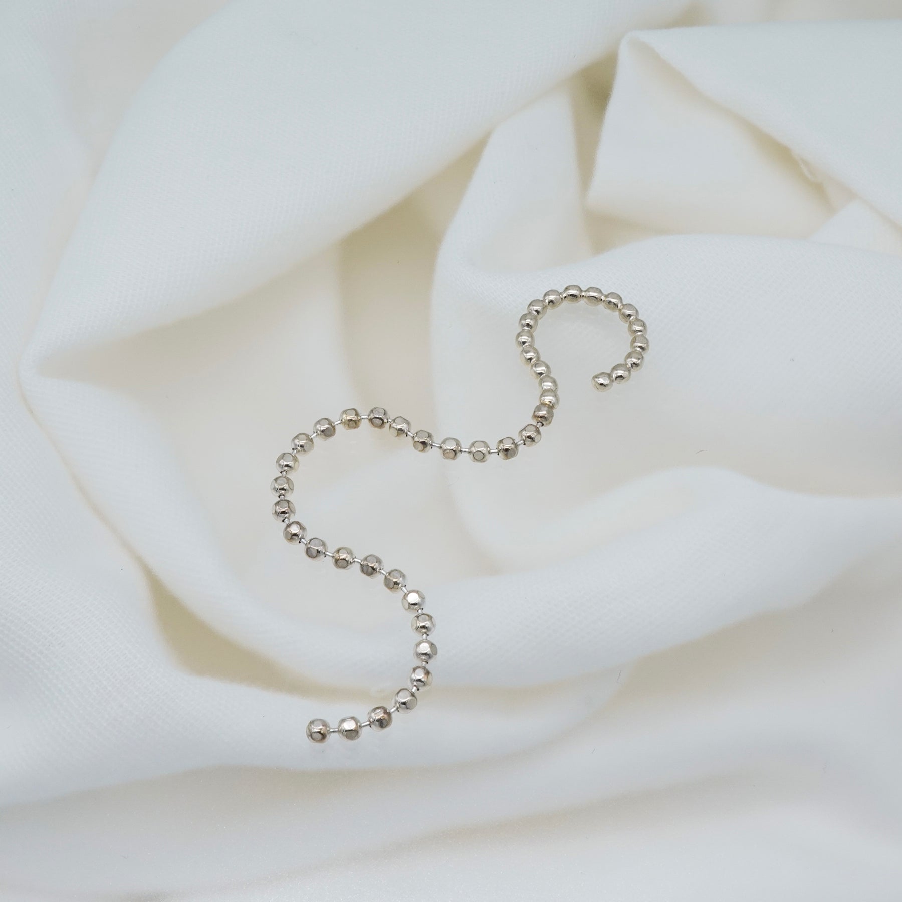 夜の湖に、ひとしずくの風が落ちた静寂のなかに広がる、目には見えない水のゆらぎ。 このイヤカフは、一見するとただの繊細なチェーン。 けれど手に取った瞬間、まるで“姿を現す”ように、装いが始まります。 カットボールチェーンの上部は固定され、下部はふわりと揺れる構造。 耳に掛けると、頬に沿って細やかに垂れ、動くたびにやさしく揺れます。 装着前と後で印象ががらりと変わる、視線を引き寄せる静かな仕掛け。 耳元で揺れるたび、日常の景色に静かな“間”を与えてくれる一品。