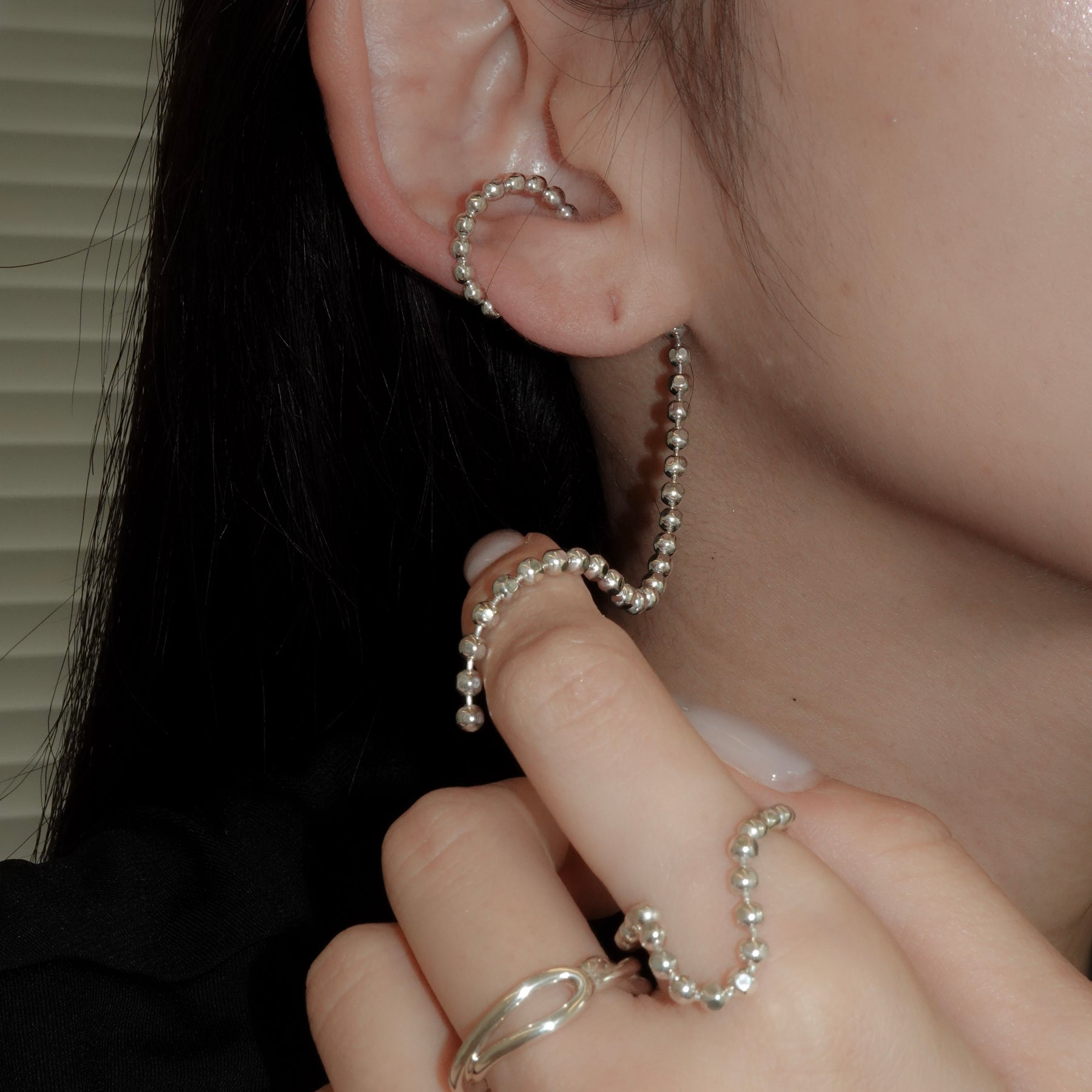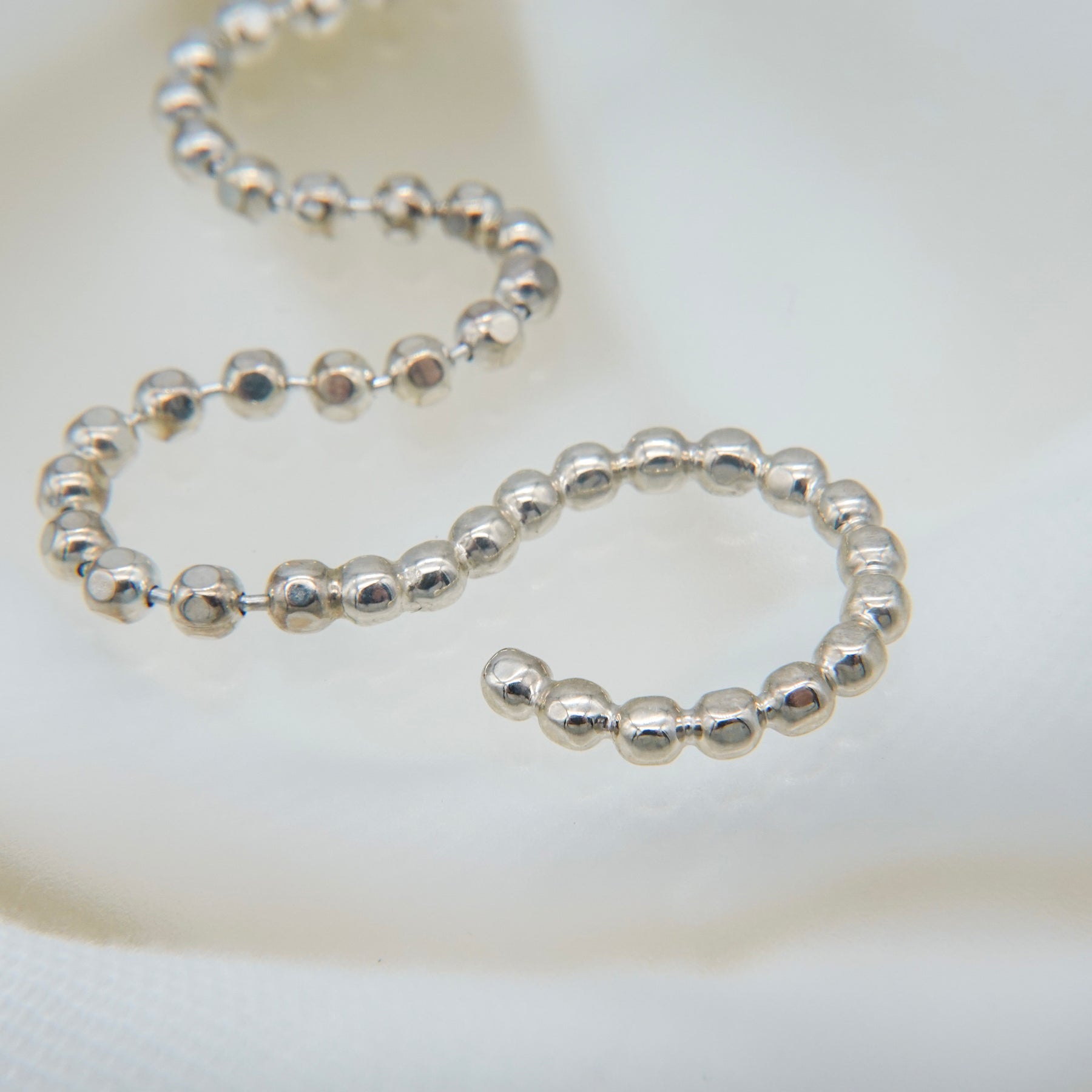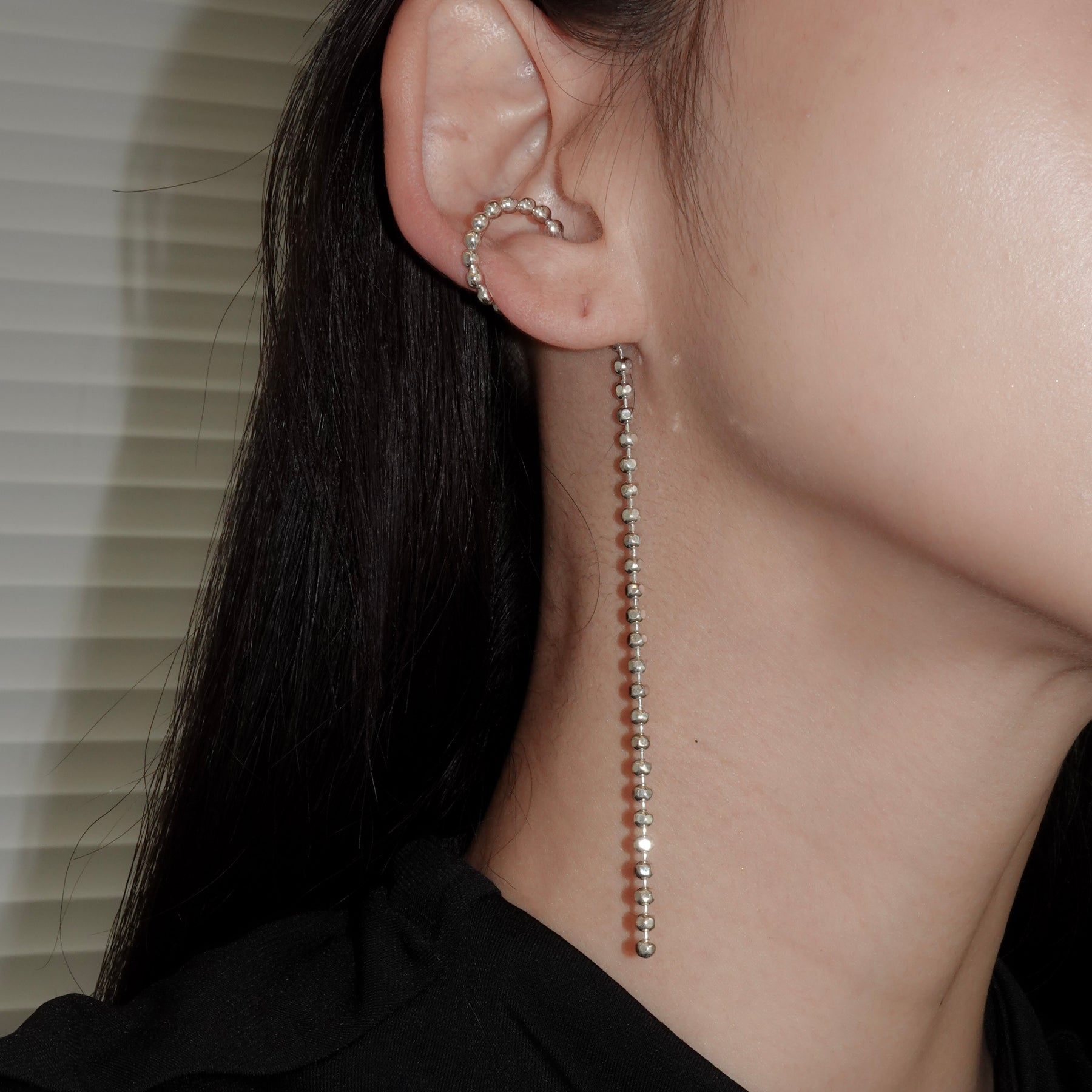 夜の湖に、ひとしずくの風が落ちた静寂のなかに広がる、目には見えない水のゆらぎ。 このイヤカフは、一見するとただの繊細なチェーン。 けれど手に取った瞬間、まるで“姿を現す”ように、装いが始まります。 カットボールチェーンの上部は固定され、下部はふわりと揺れる構造。 耳に掛けると、頬に沿って細やかに垂れ、動くたびにやさしく揺れます。 装着前と後で印象ががらりと変わる、視線を引き寄せる静かな仕掛け。 耳元で揺れるたび、日常の景色に静かな“間”を与えてくれる一品。