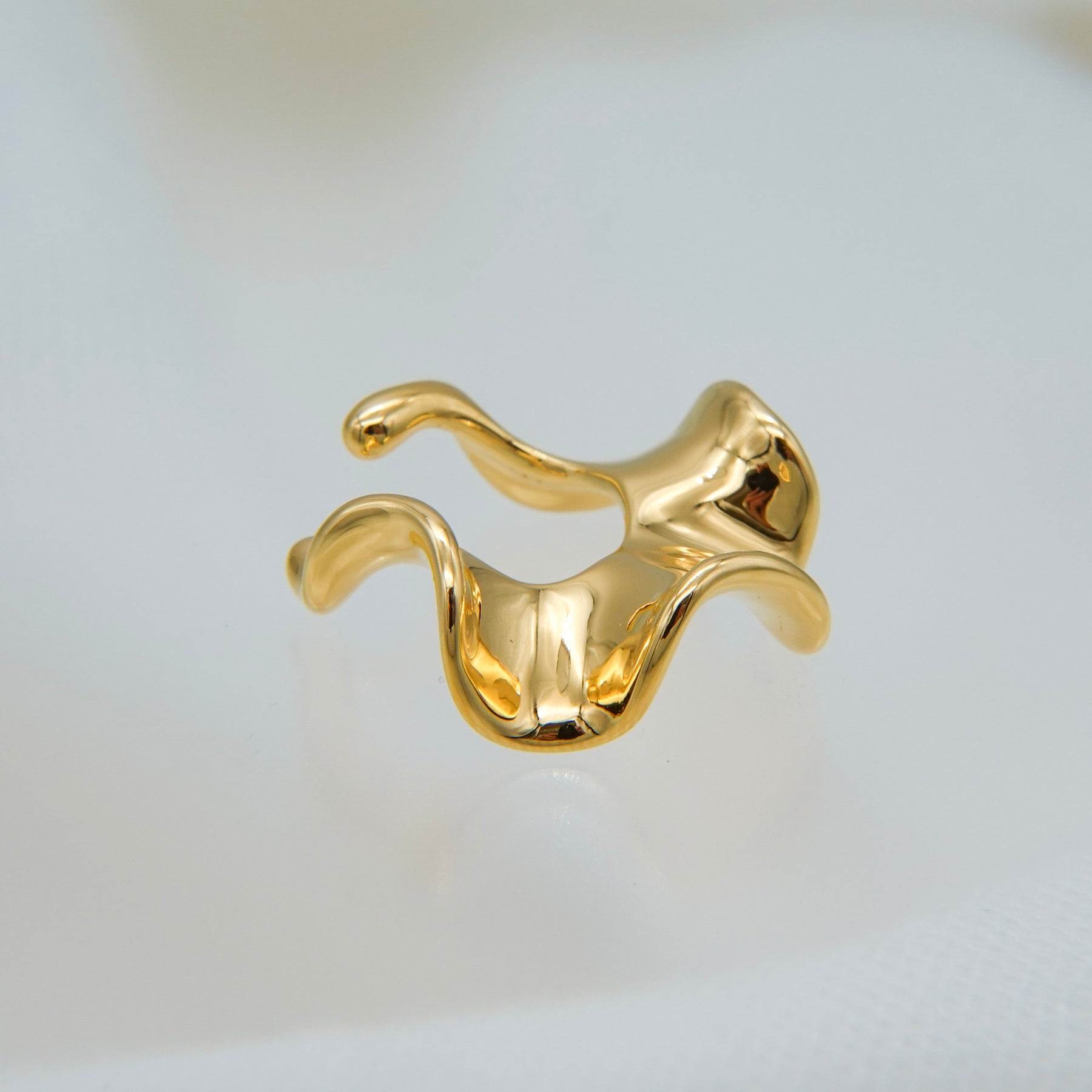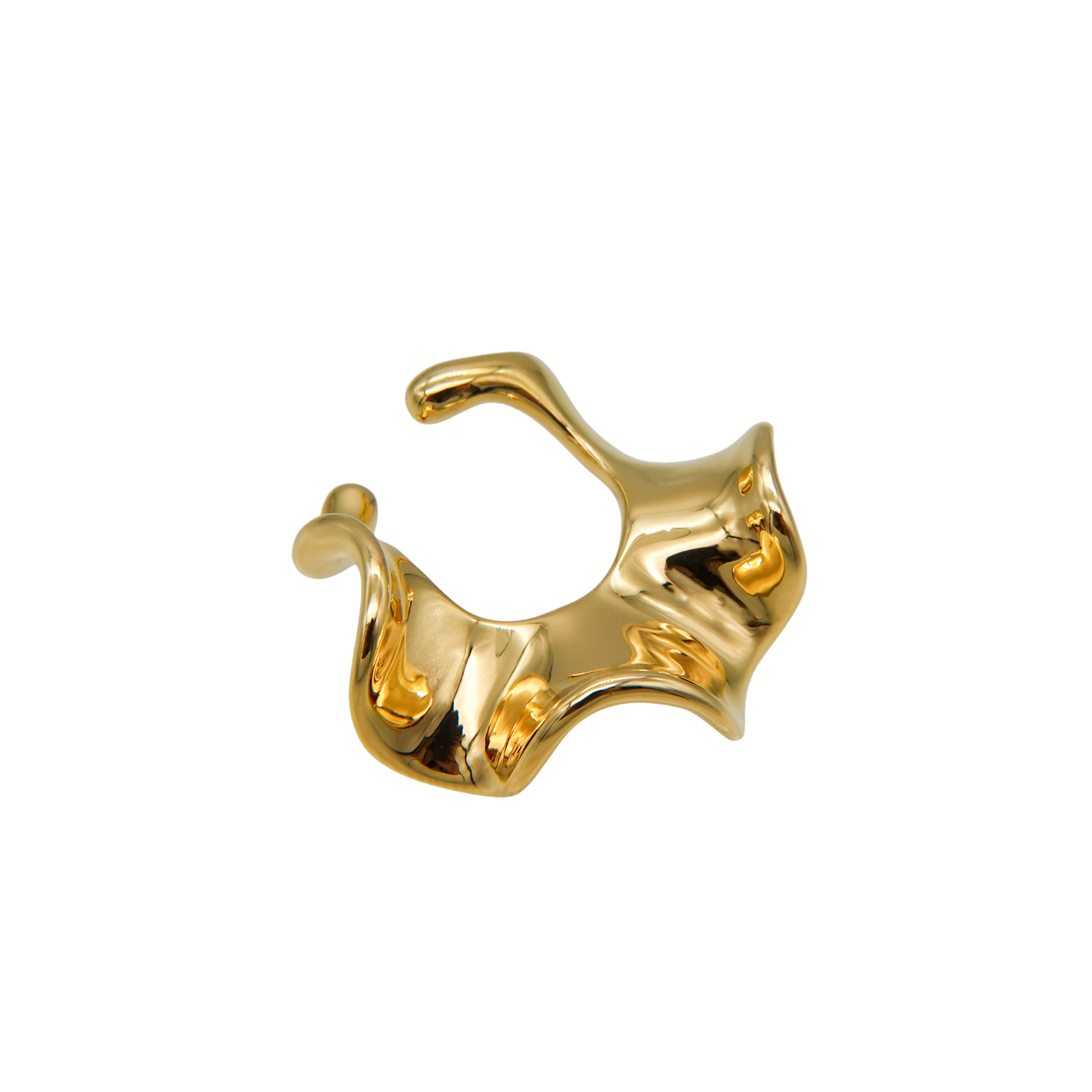 耳から光の花びらがこぼれ落ちるようなデザインのイヤカフ。 甘く優しいフリルのようなフォルムと、金属のクールな質感のコントラストが生み出す豊かな表情が、肌に、装いに、その日の気分に、ふんわり寄り添いながら”花”を添えます。 大きすぎず小さすぎずのちょうどいいサイズ感で、ひとつでも顔周りが華やぐ存在感がありつつ、着け心地はふわっと軽やか。また、開口部の両端を少し斜めにずらしてあるため、耳からスルッと抜けて落ちにくく、着用時に耳に沿うような角度がつくのも特徴です。