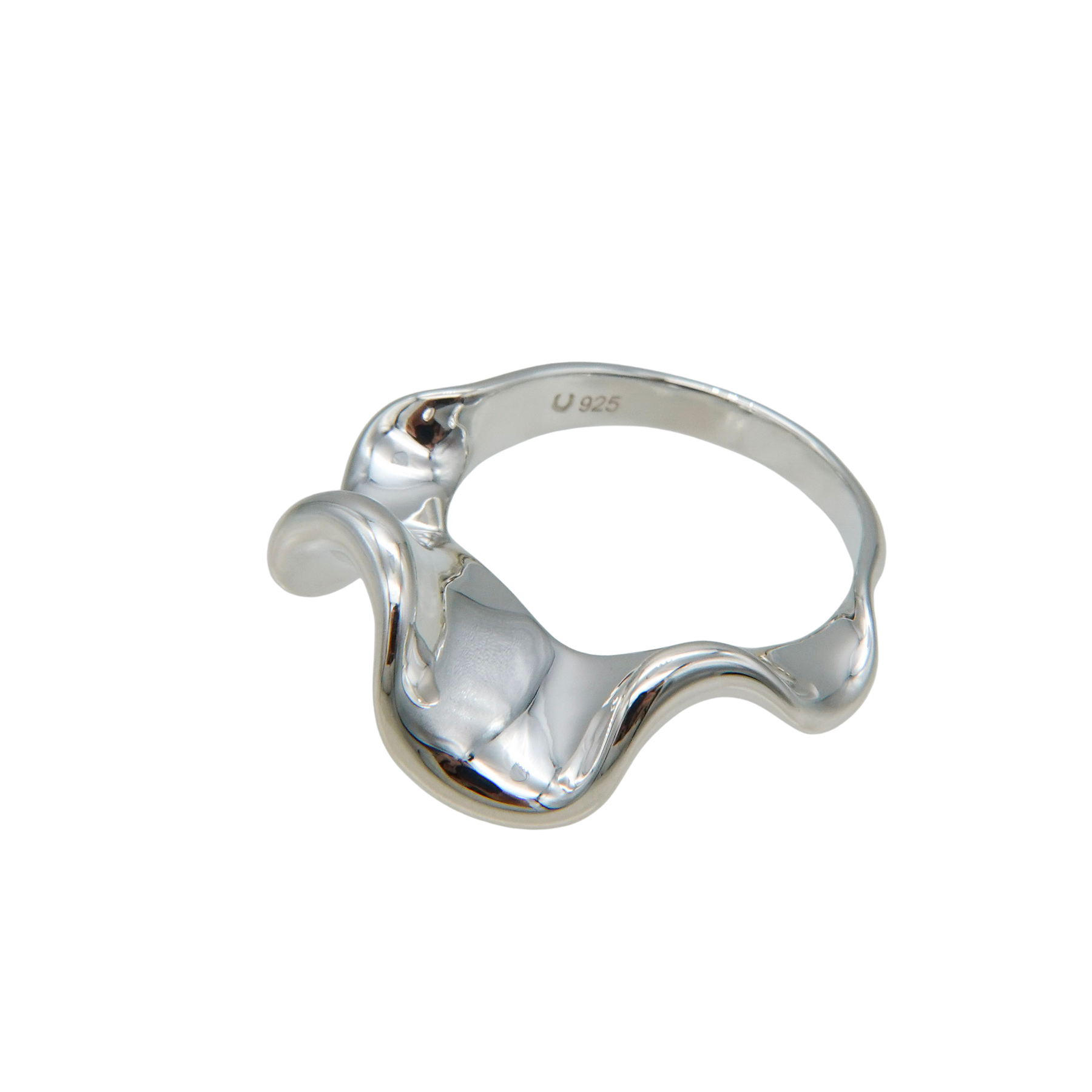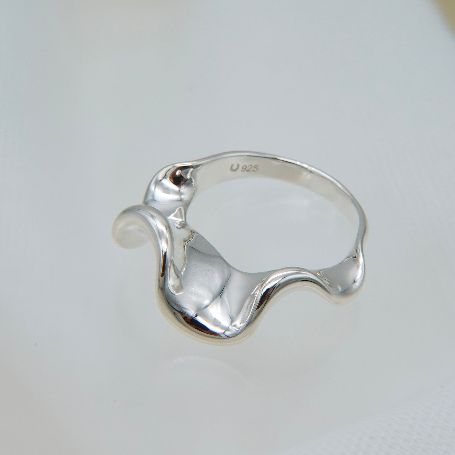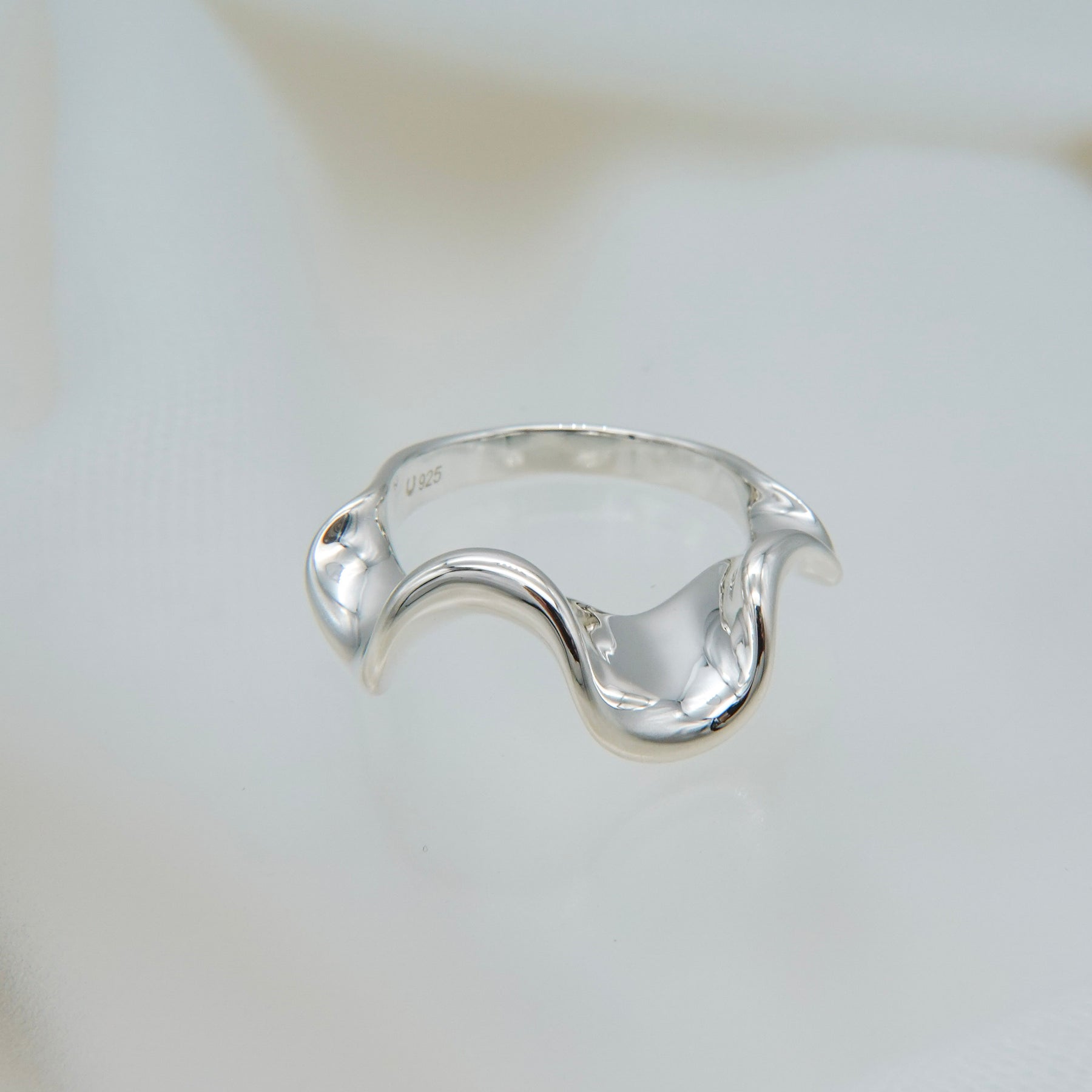 波打つバラの花弁を、磨き上げたシルバーならではのしっとり潤んだようなみずみずしい輝きで表現したフローラコレクションのリング。 甘く優しいフリルのようなフォルムと、金属のクールな質感のコントラストが生み出す豊かな表情が、肌に、装いに、その日の気分に、ふんわり寄り添いながら”花”を添えるデザインです。 花びらをくり抜いたような形のリングは、ひとつでも存在感たっぷり。 一見大胆に見えて、柔らかな手指の曲線にふわっとなじみ、手元を優しく華やいだ雰囲気に仕上げます。いつものTシャツにも、お気に入りのドレスにも。 印象的なきらめきで品よく映えるリングです。