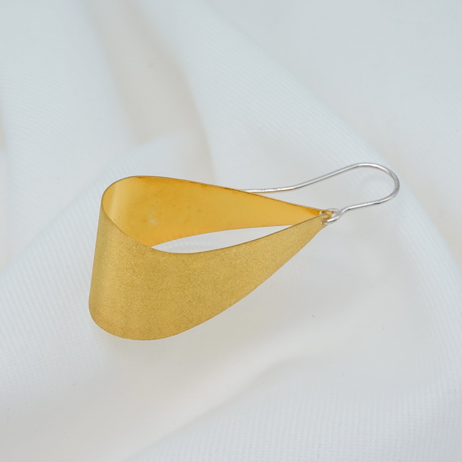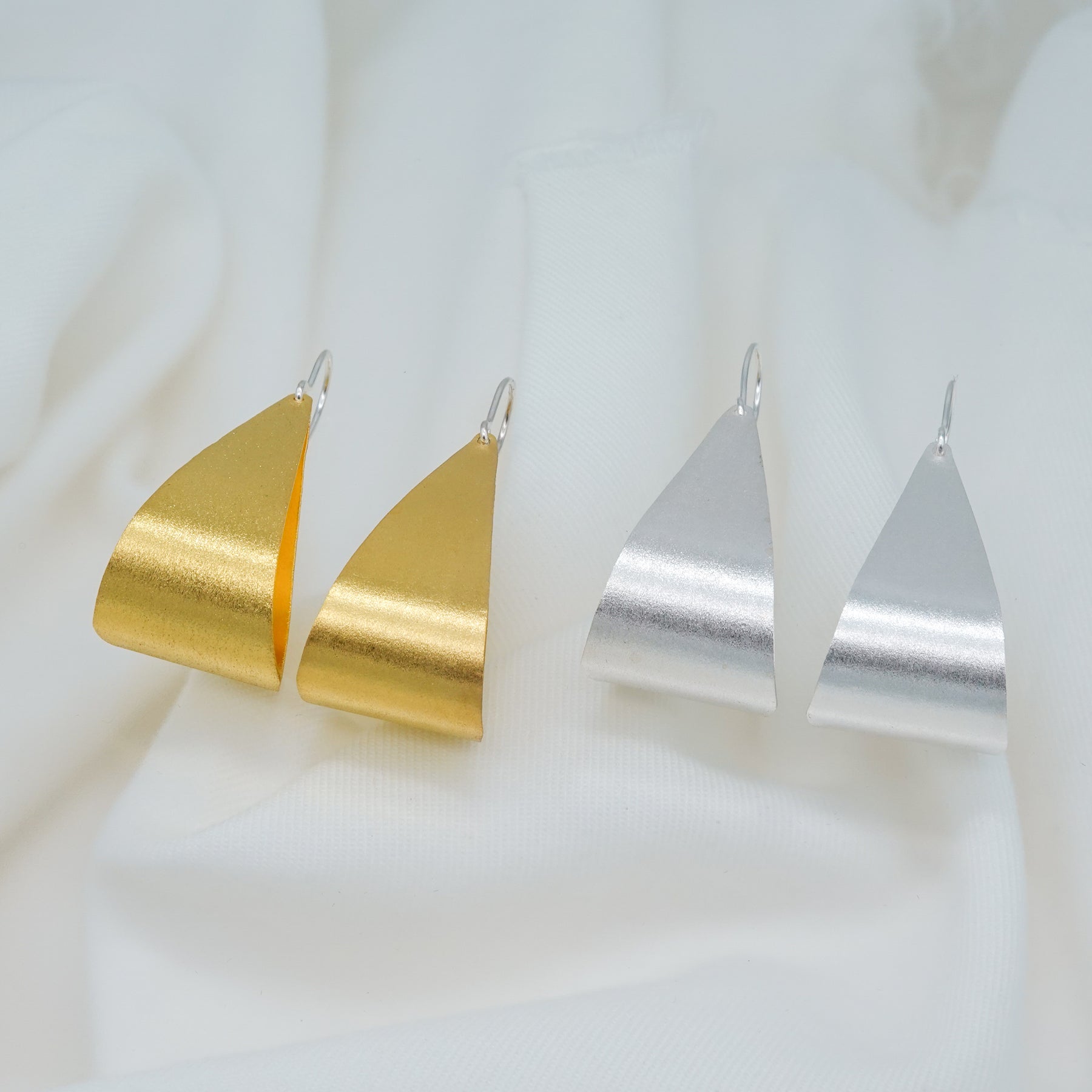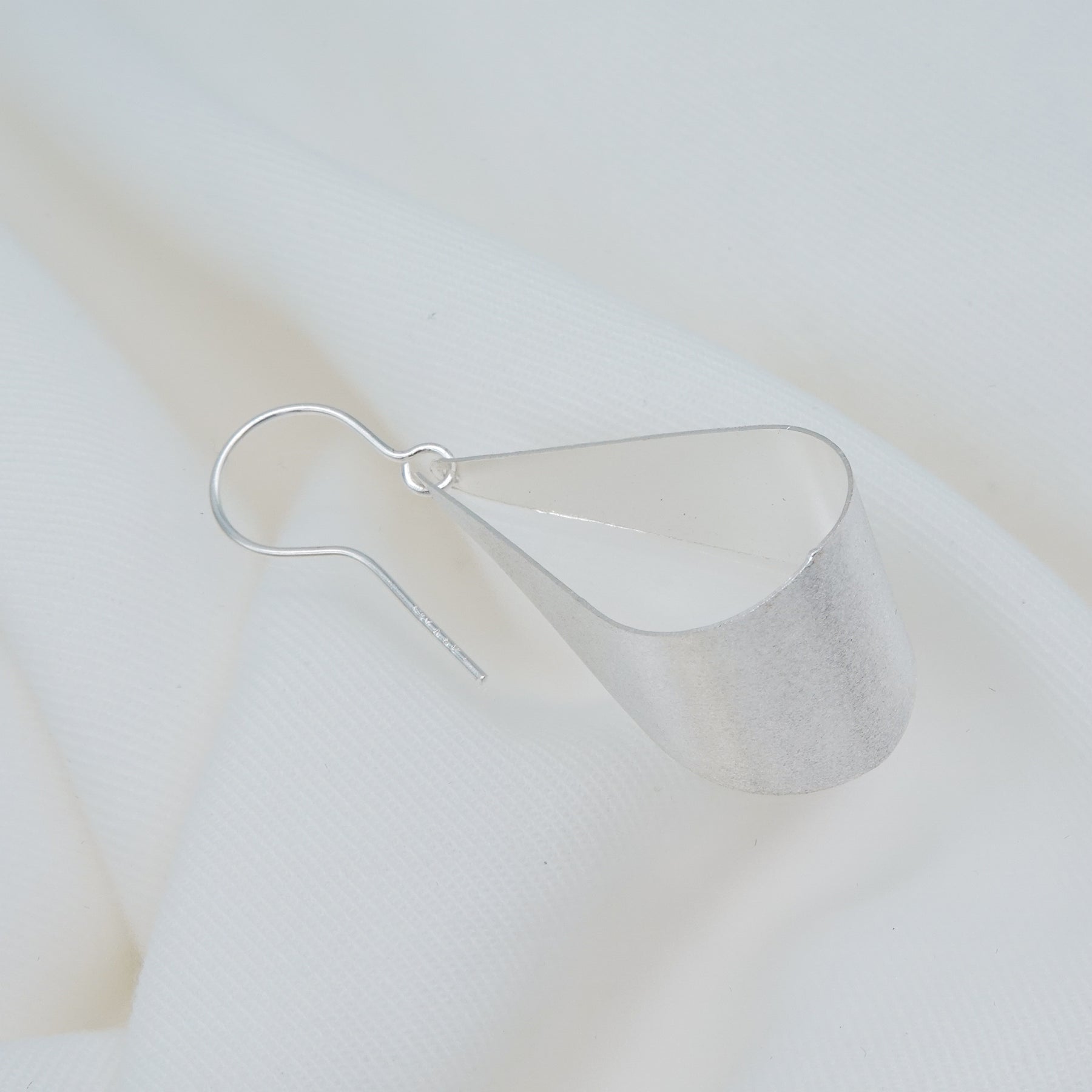 極限まで薄いプレートを丸く曲げた、ふわふわと宙に舞う風船を彷彿とさせるピアス。表面はマット仕上げで、大ぶりなモチーフながら落ち着いた印象です。