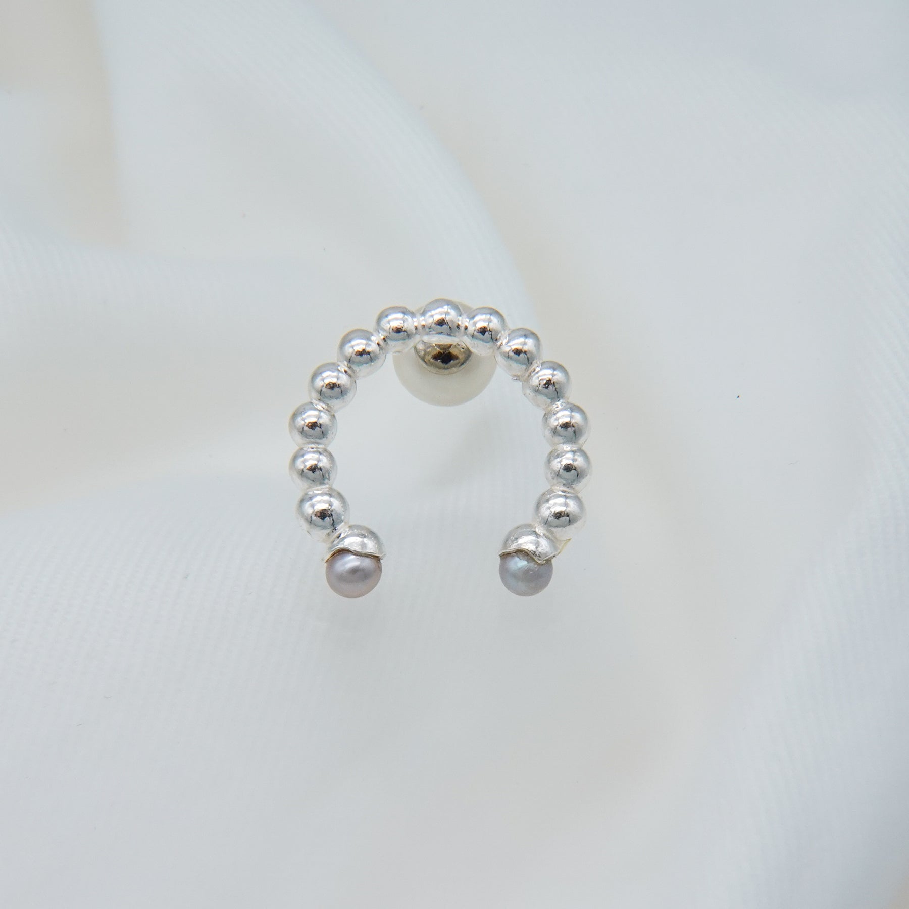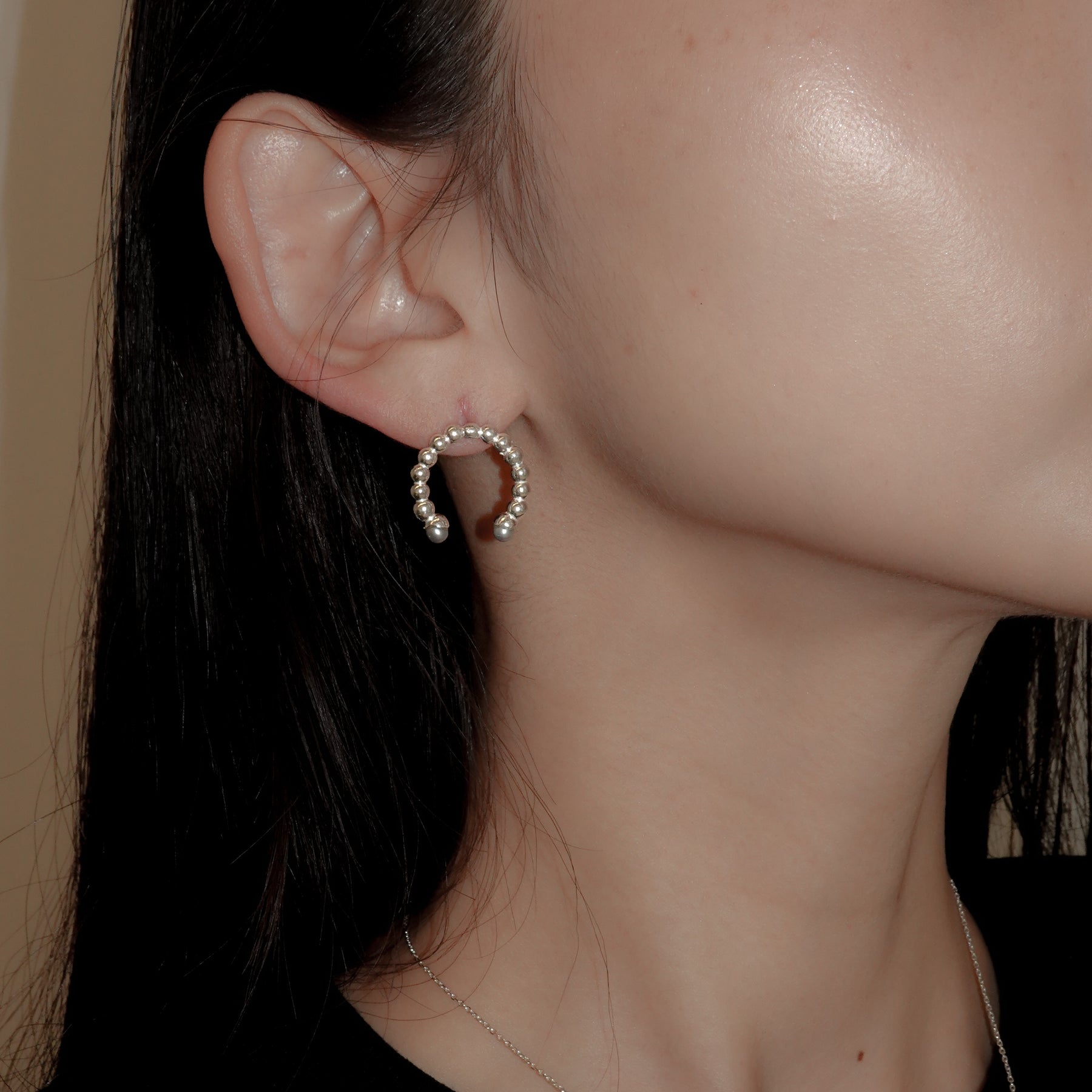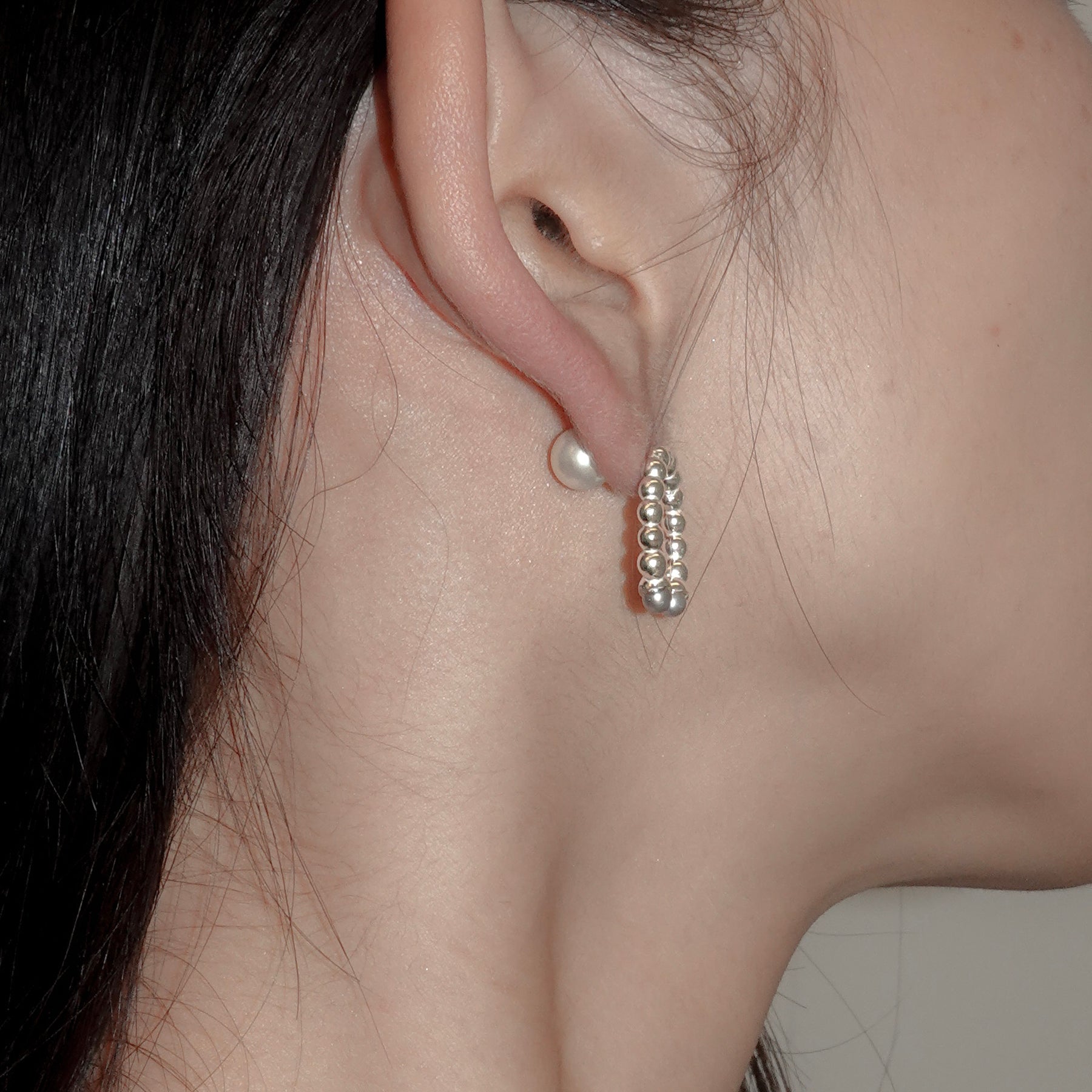 ミニマルな球体が連なり、耳元に軽やかなリズムを生むピアス。端にあしらった小さなパールが、静かな個性を引き立てます。 こちらのアイテムは片耳販売となります。