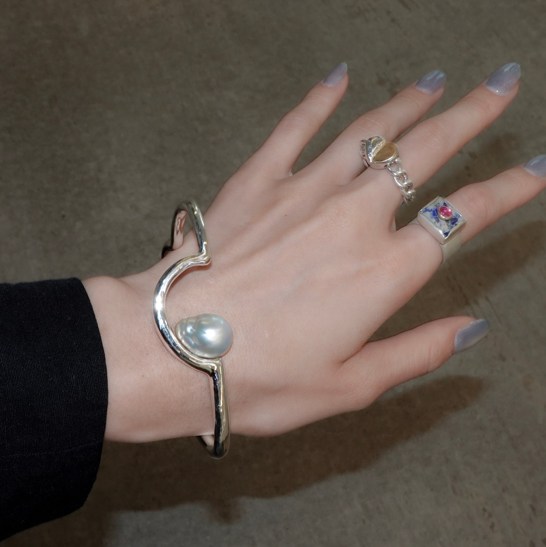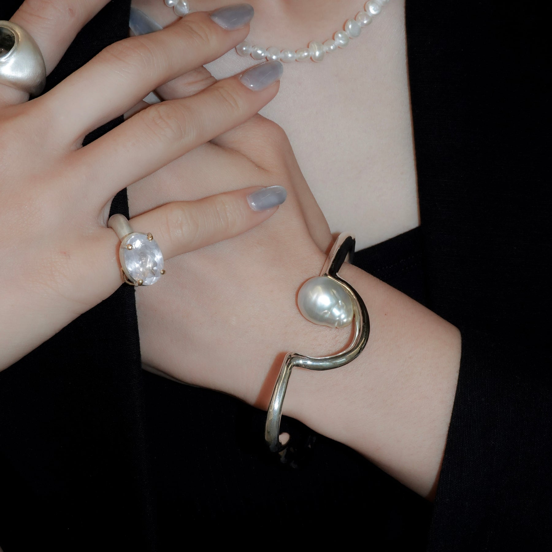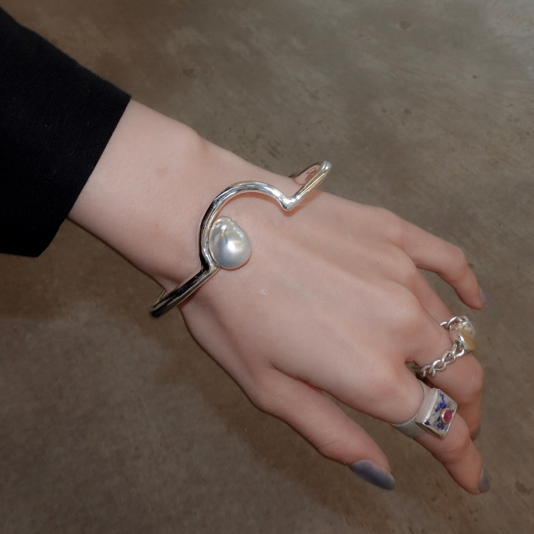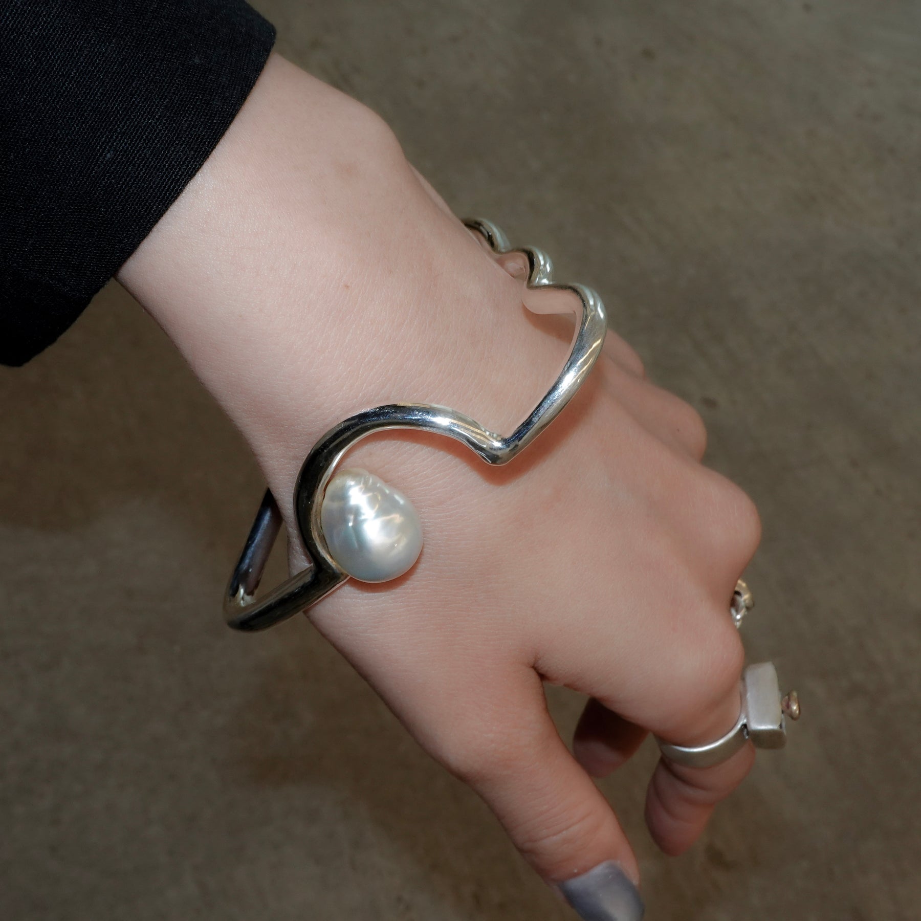 バロックパールがあしらわれた個性抜群のフォルムのバングル。