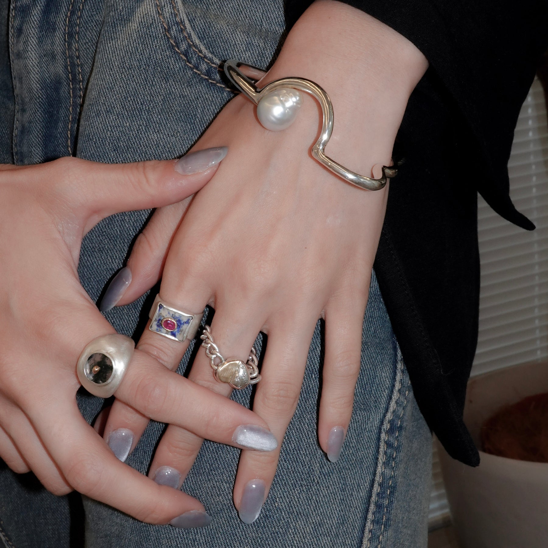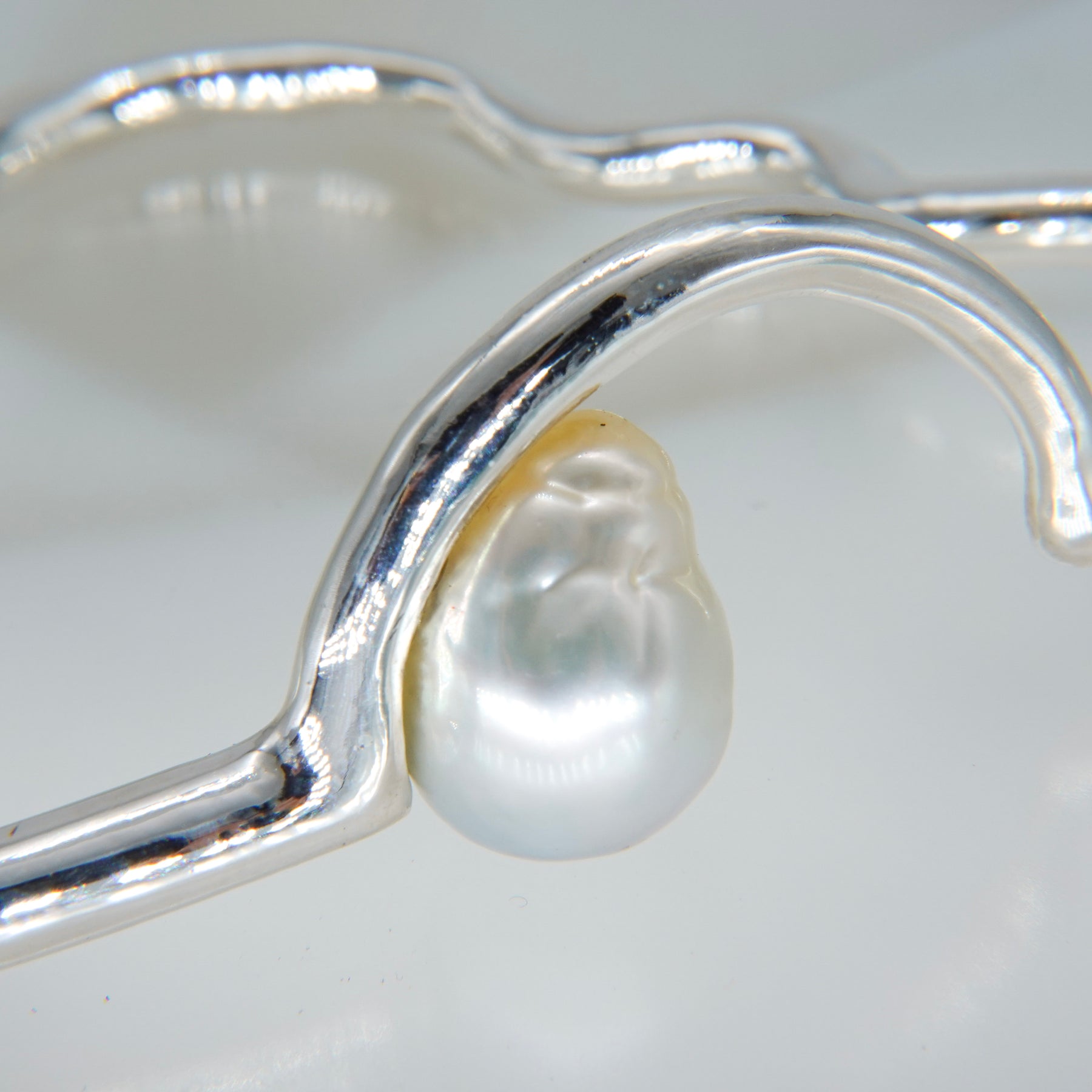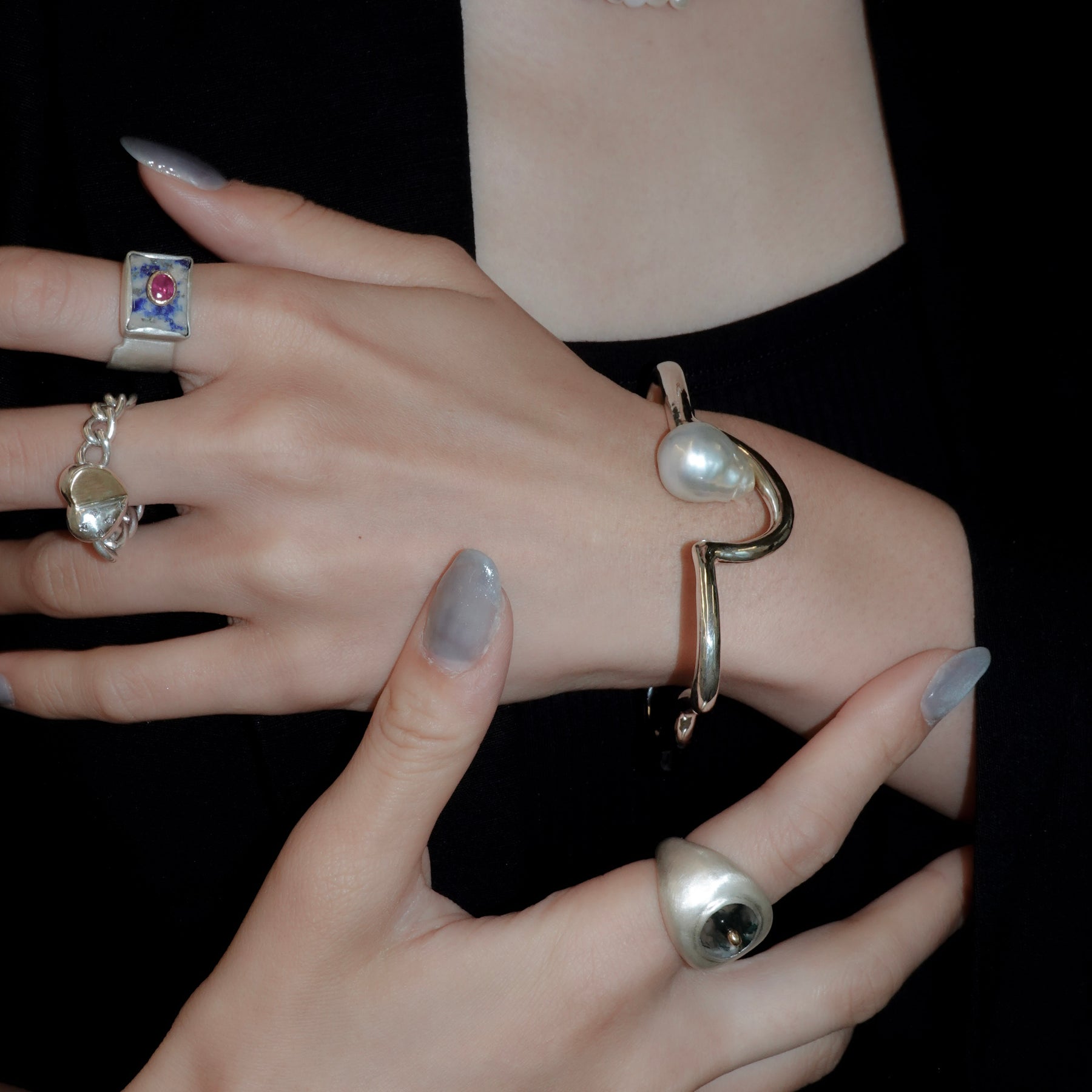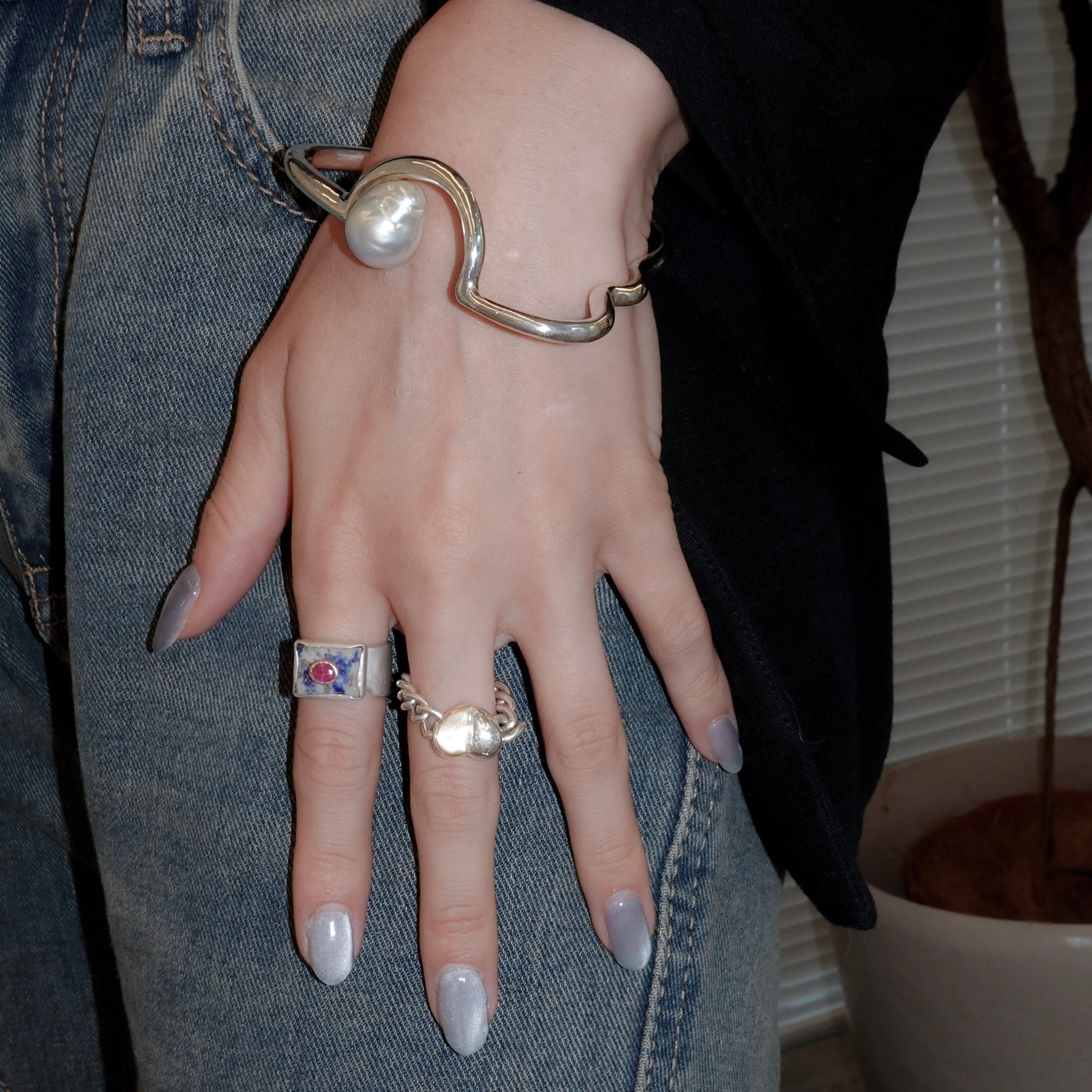 バロックパールがあしらわれた個性抜群のフォルムのバングル。