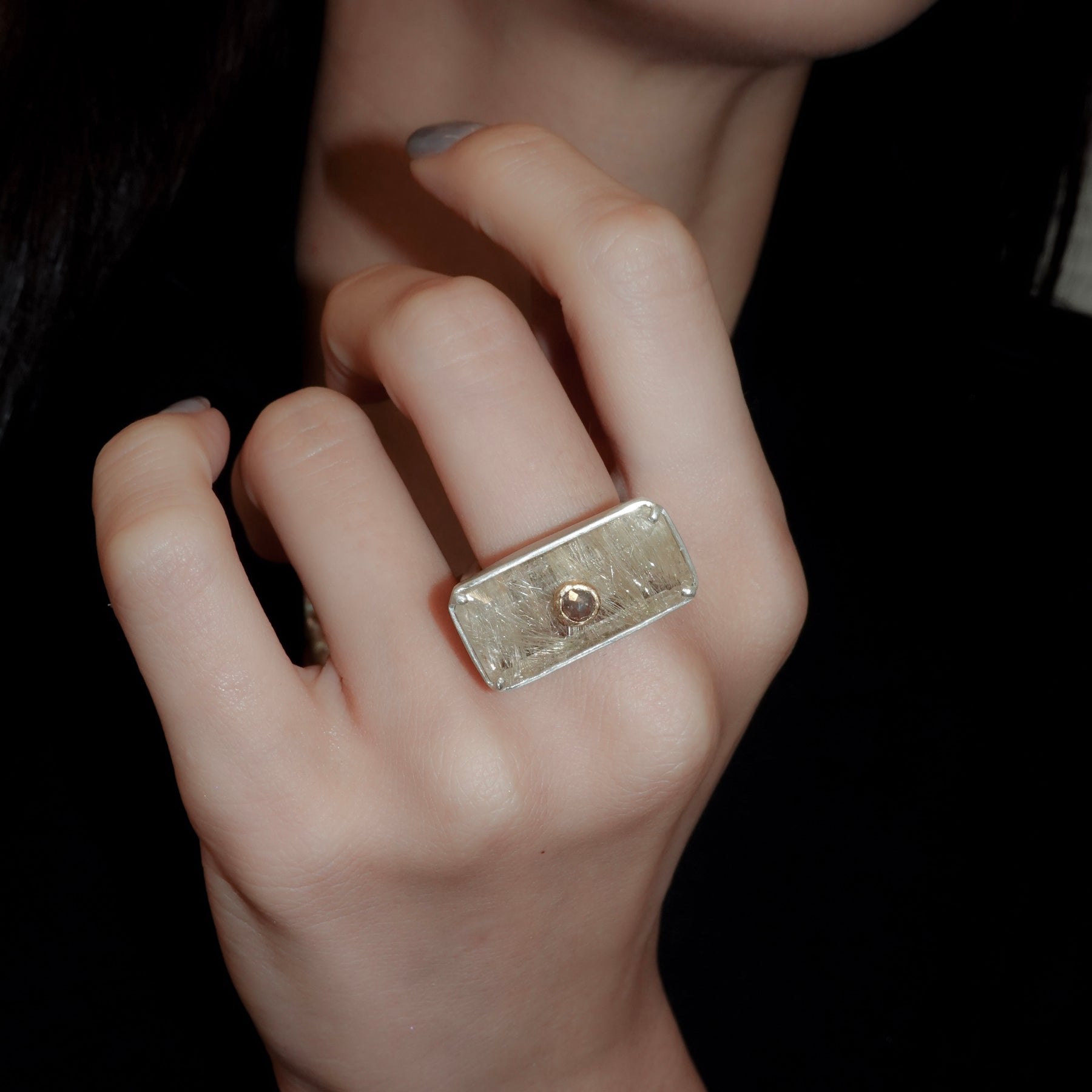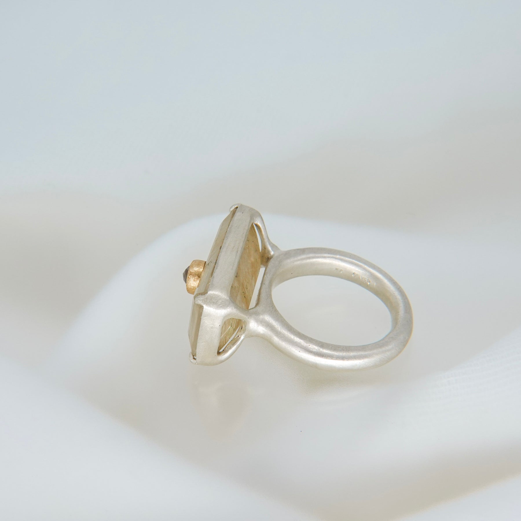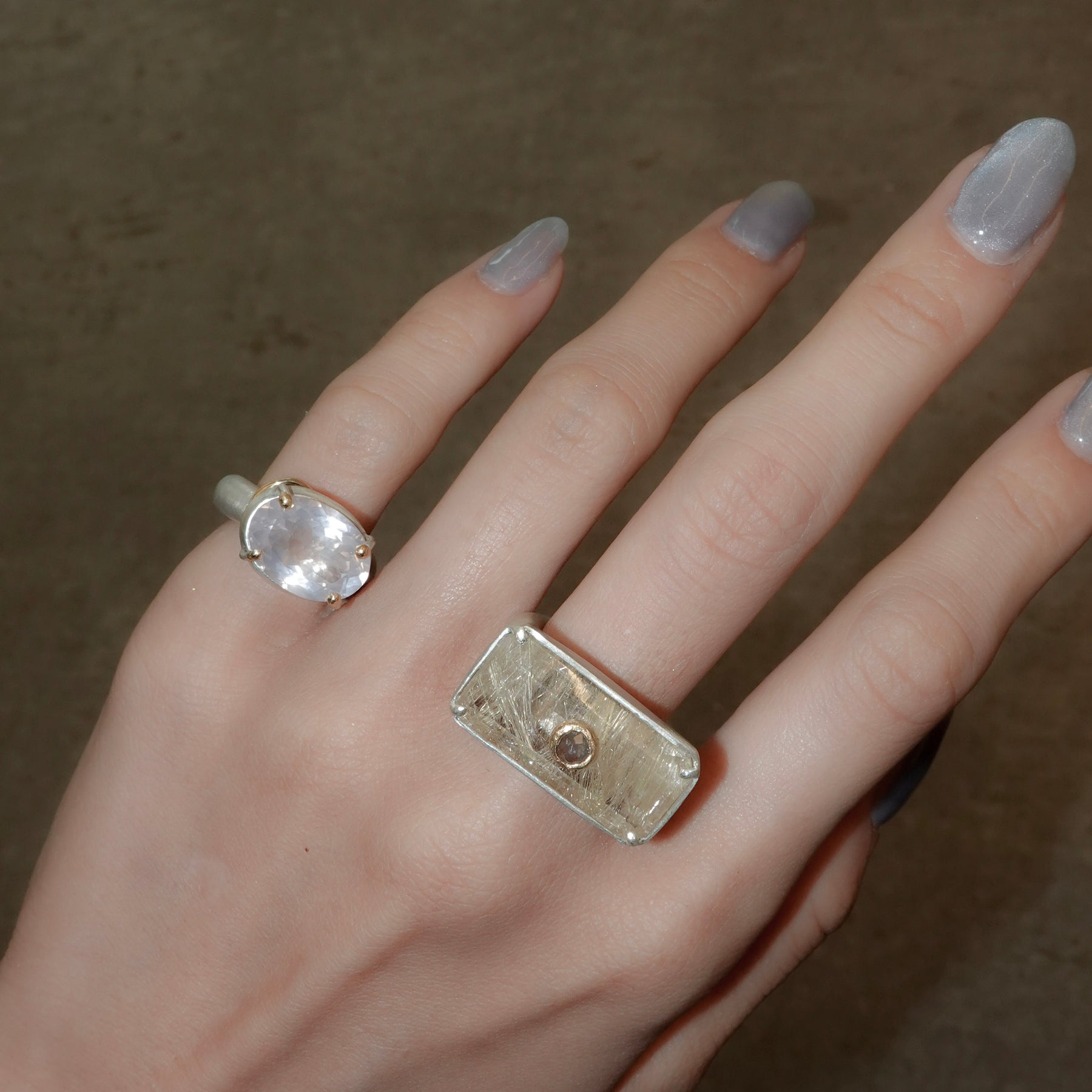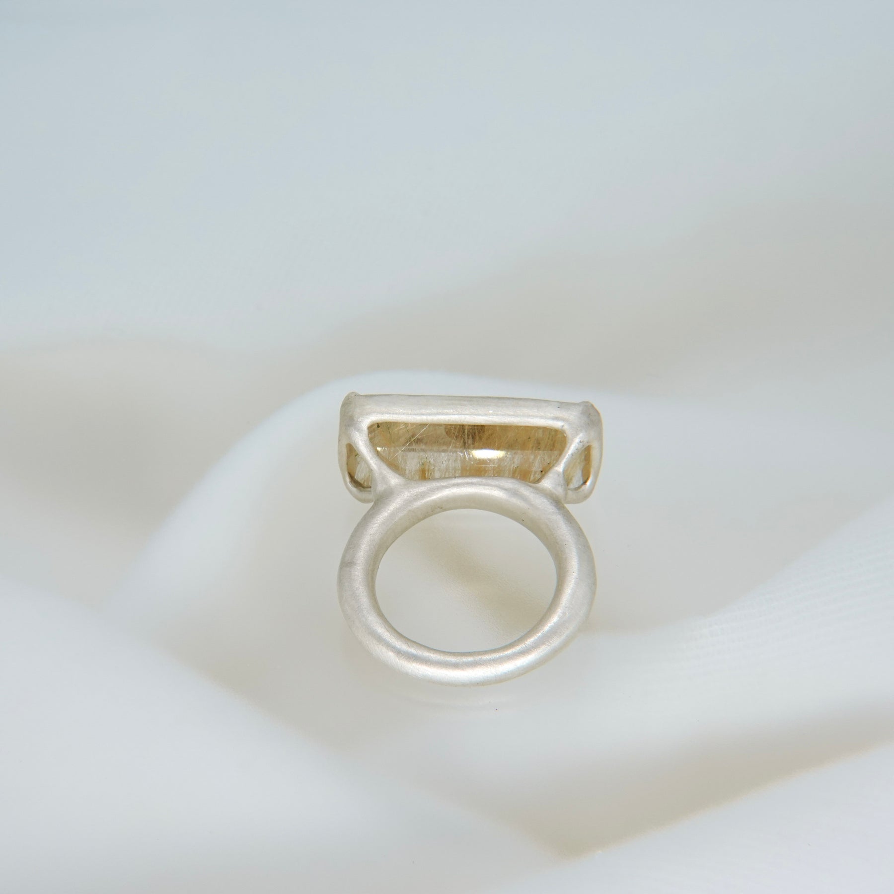 ぽってりとボリューム感のあるマットシルバーのアームに、大粒のスクエアカット・ルチルクォーツを配したリング。