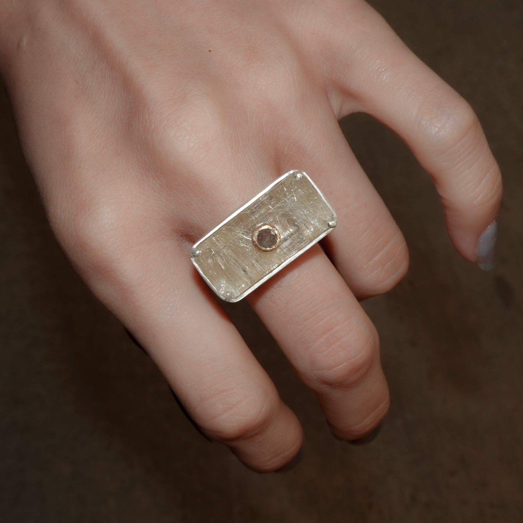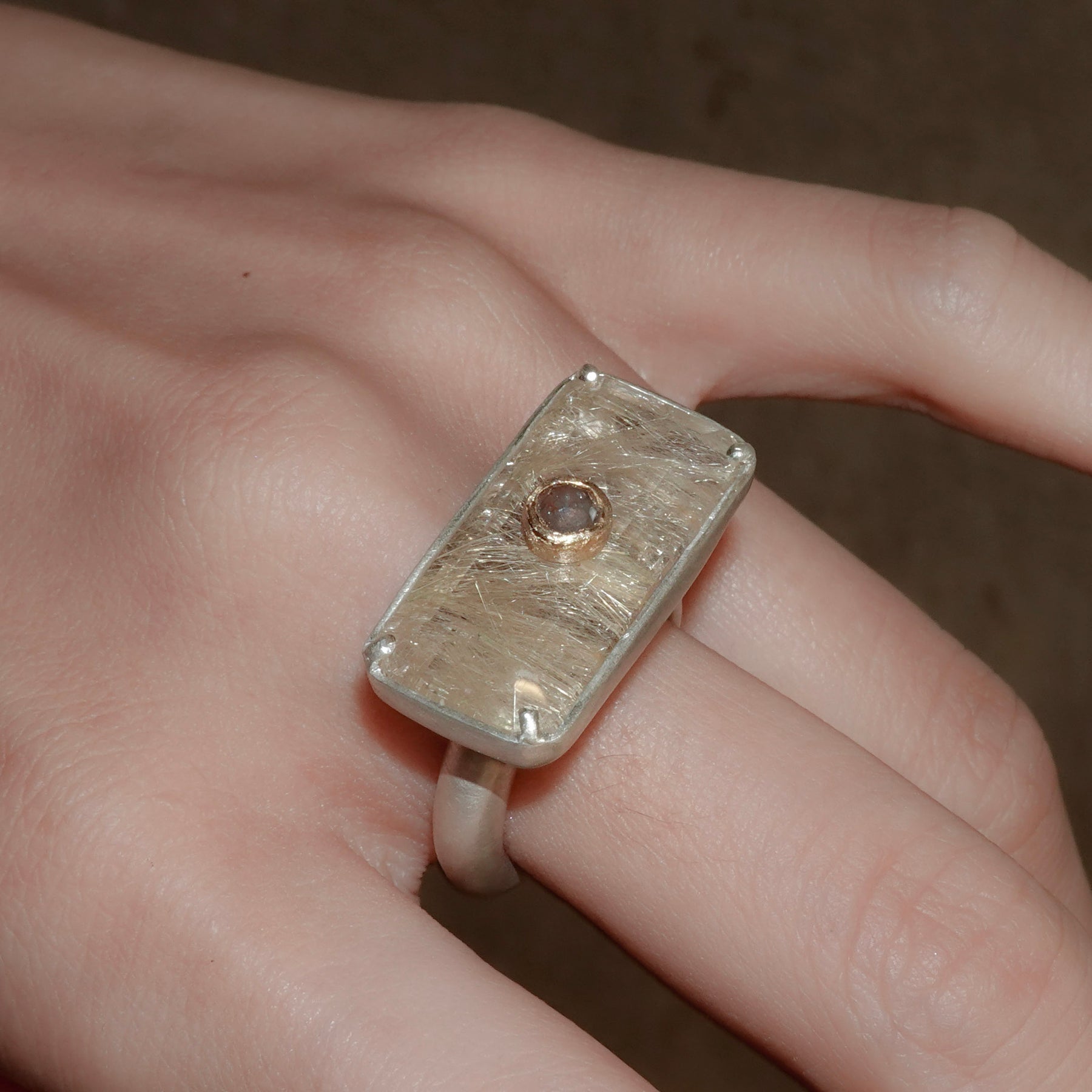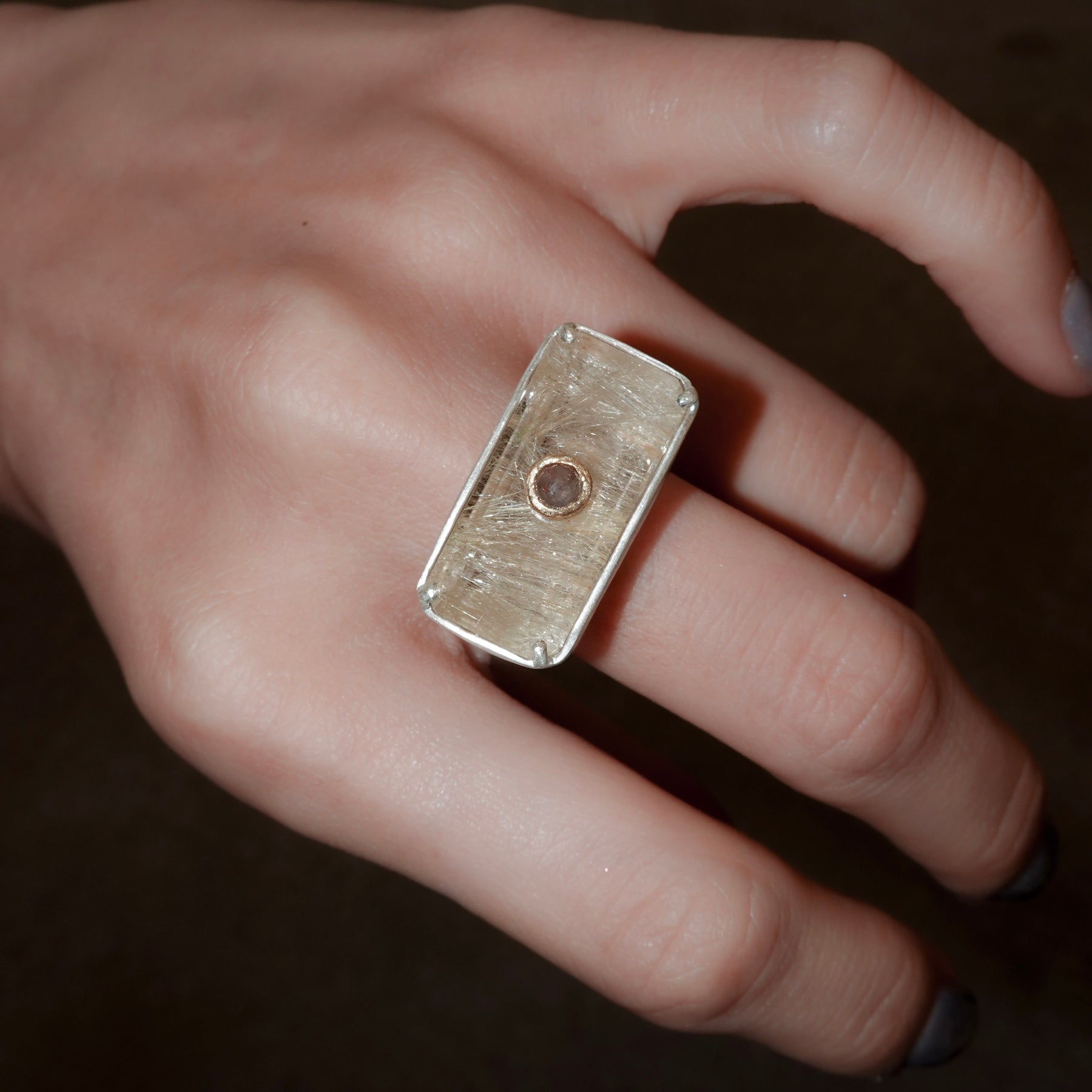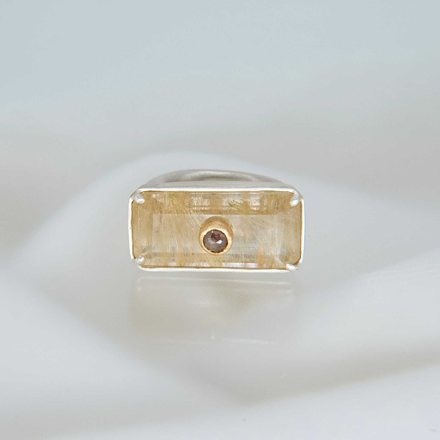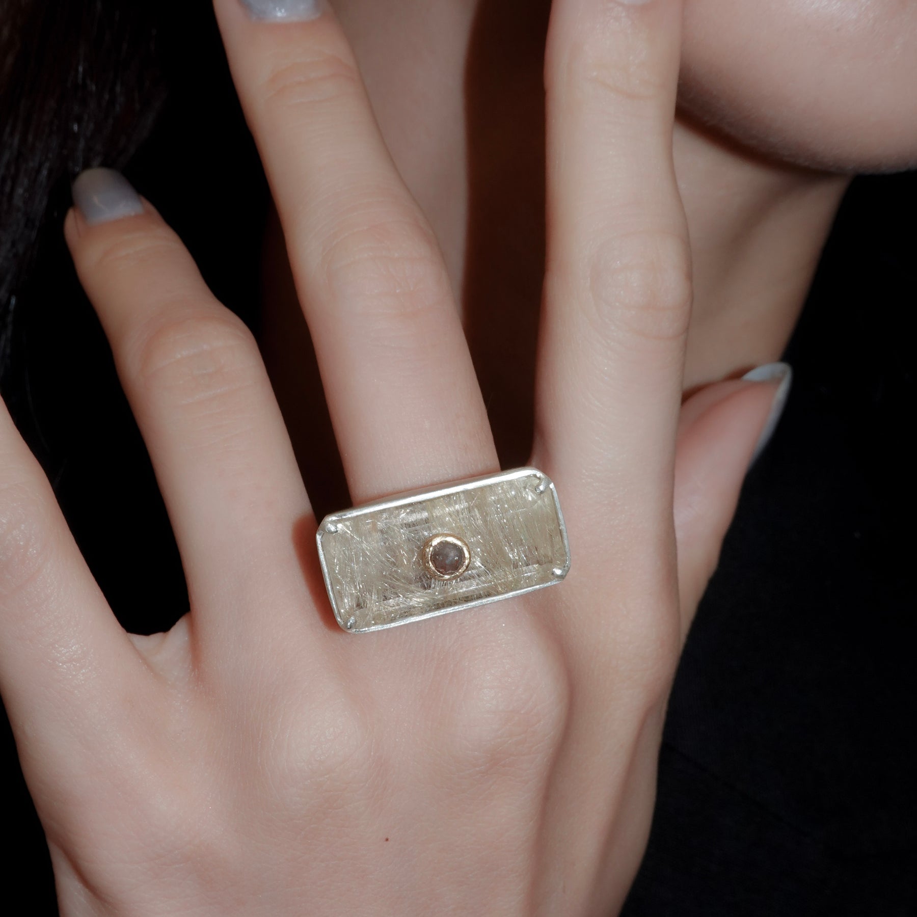 ぽってりとボリューム感のあるマットシルバーのアームに、大粒のスクエアカット・ルチルクォーツを配したリング。