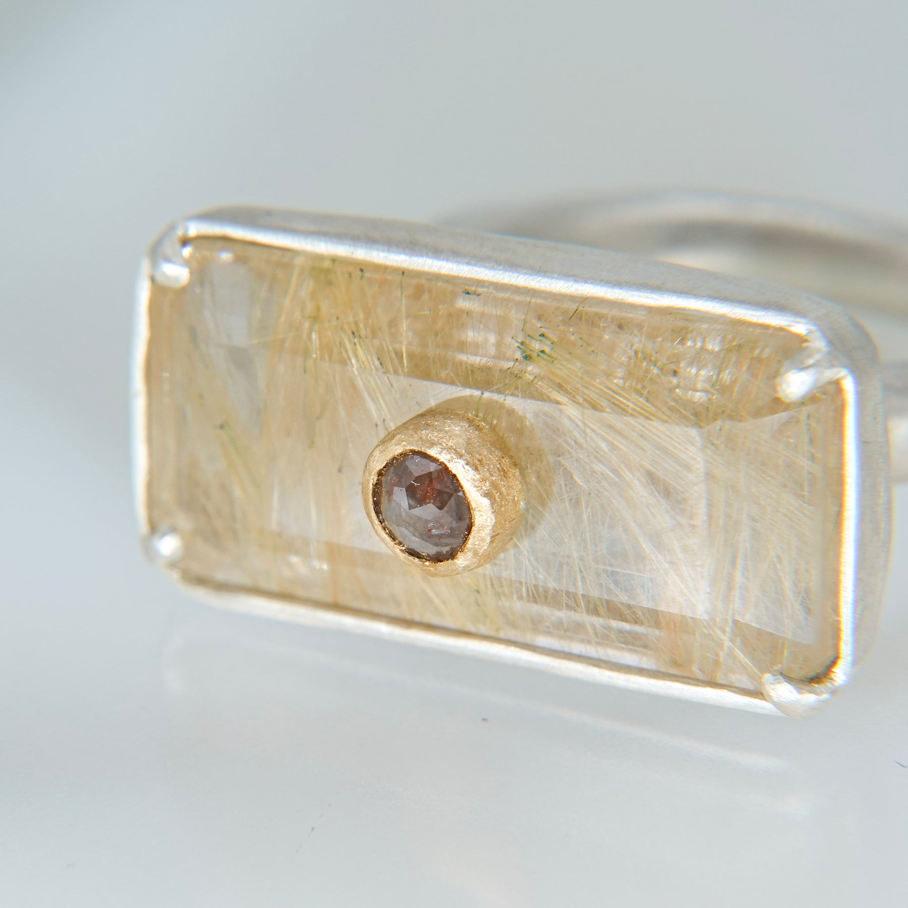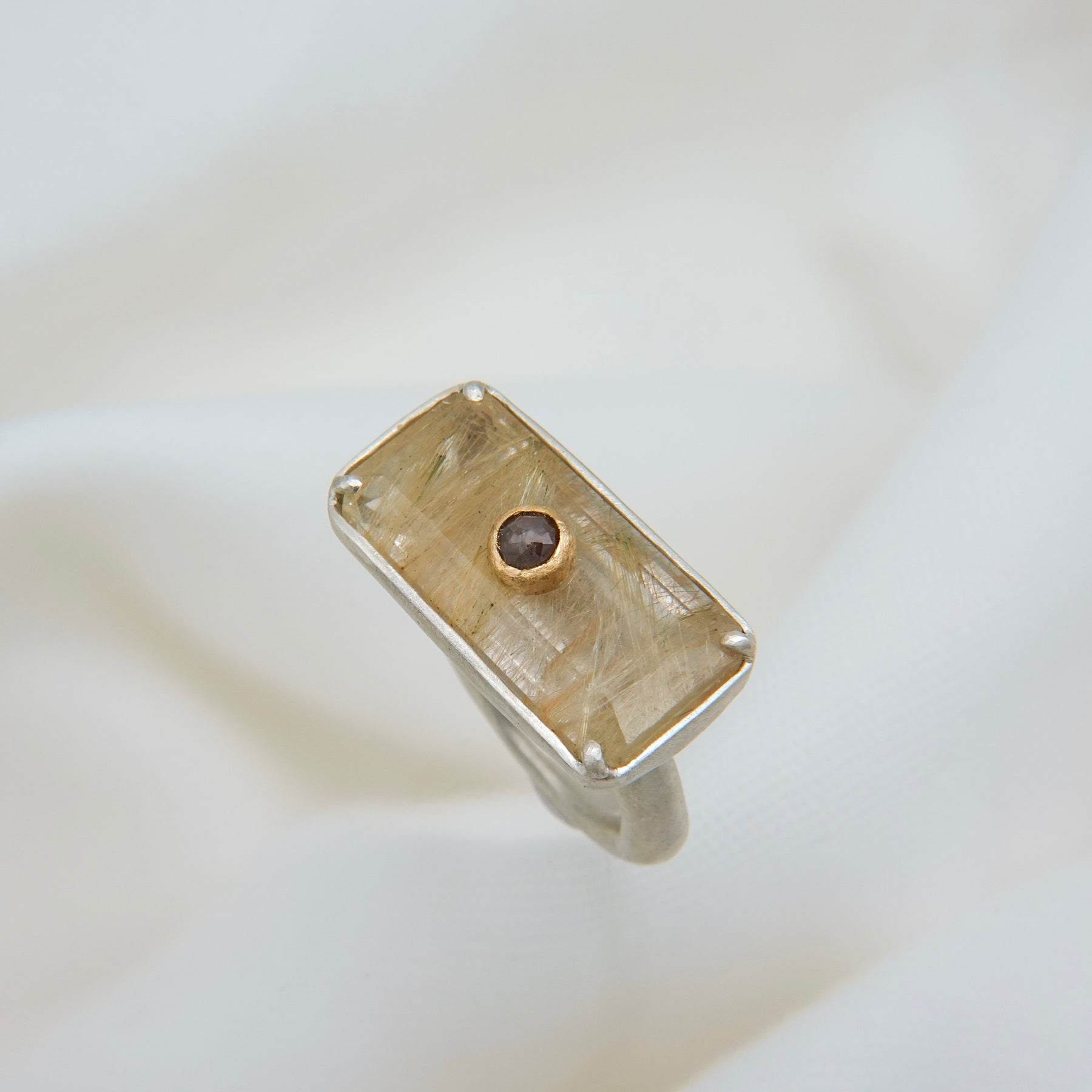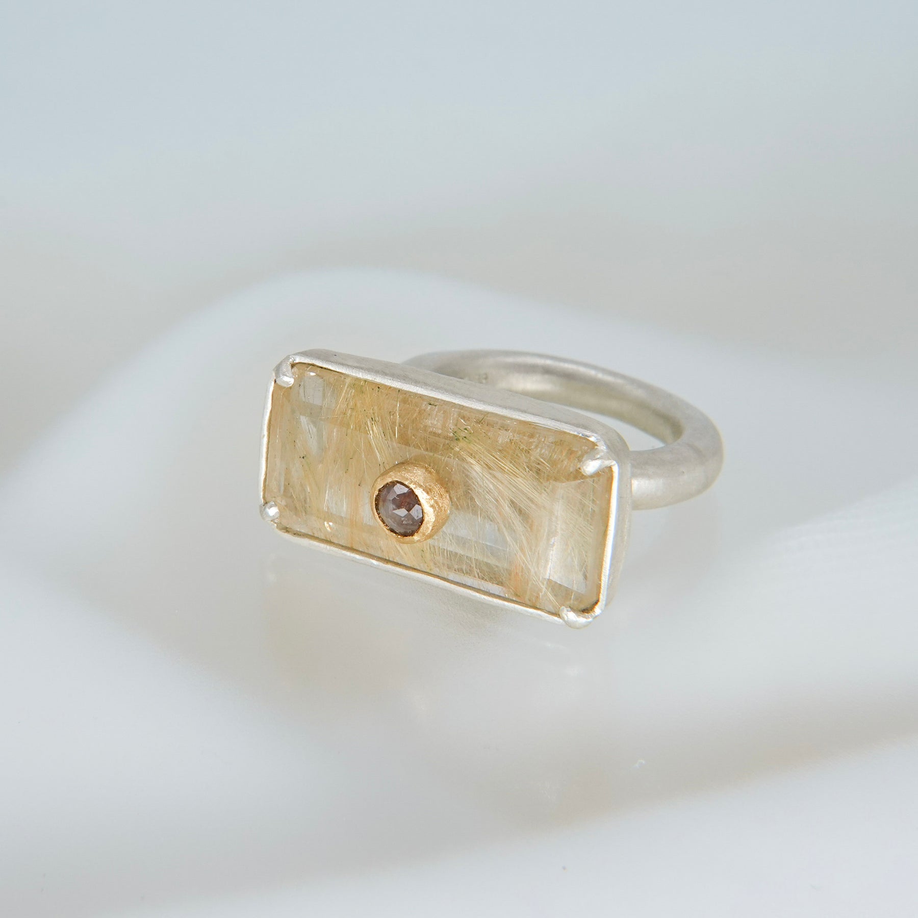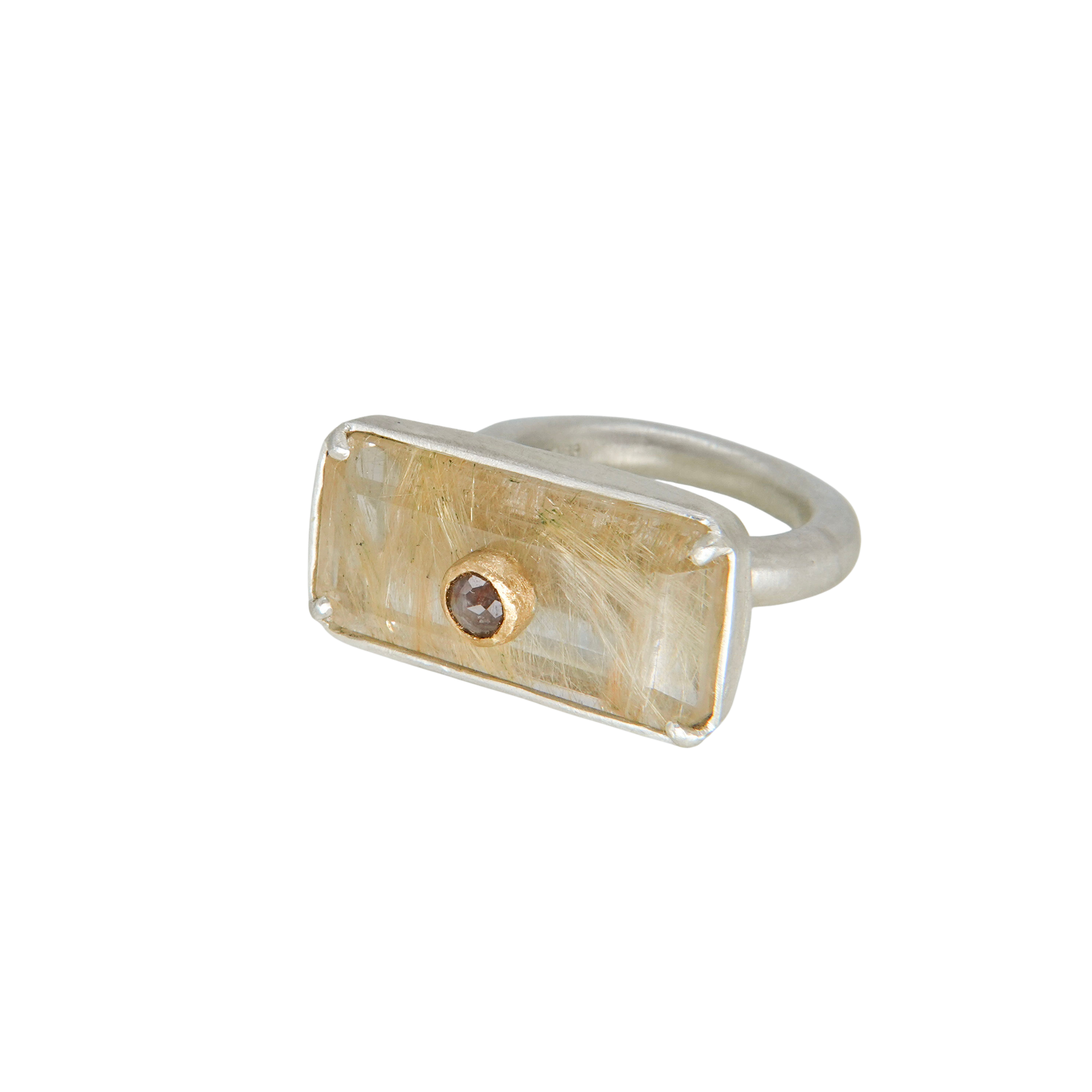ぽってりとボリューム感のあるマットシルバーのアームに、大粒のスクエアカット・ルチルクォーツを配したリング。