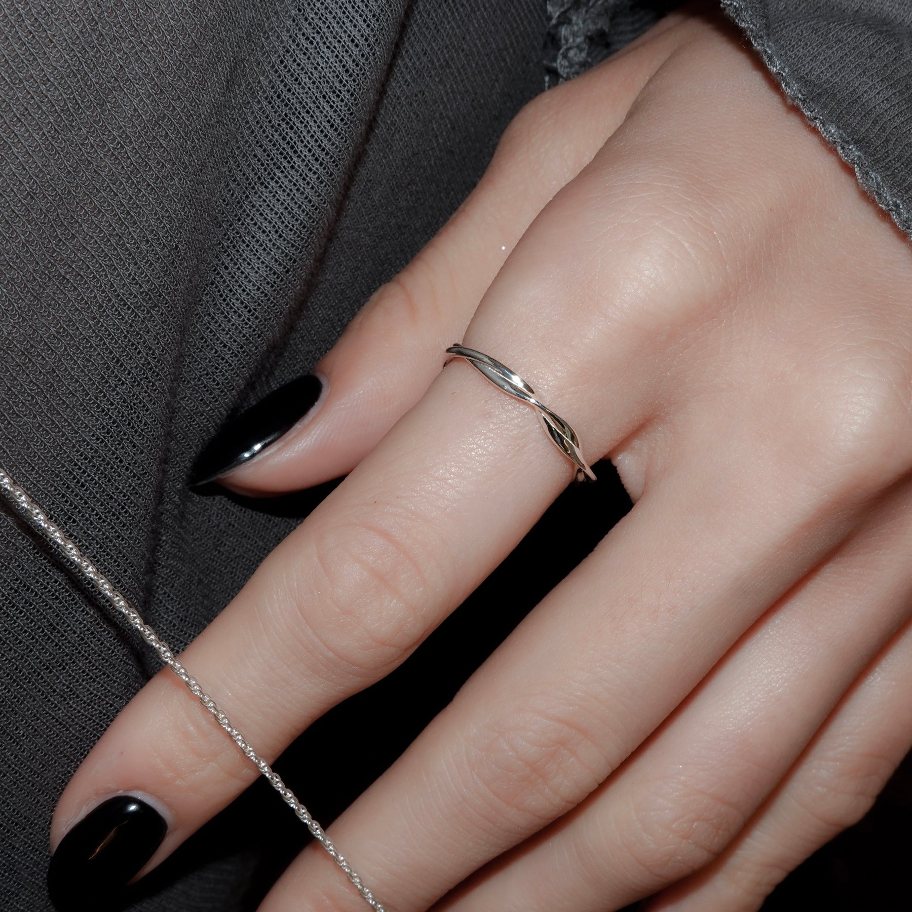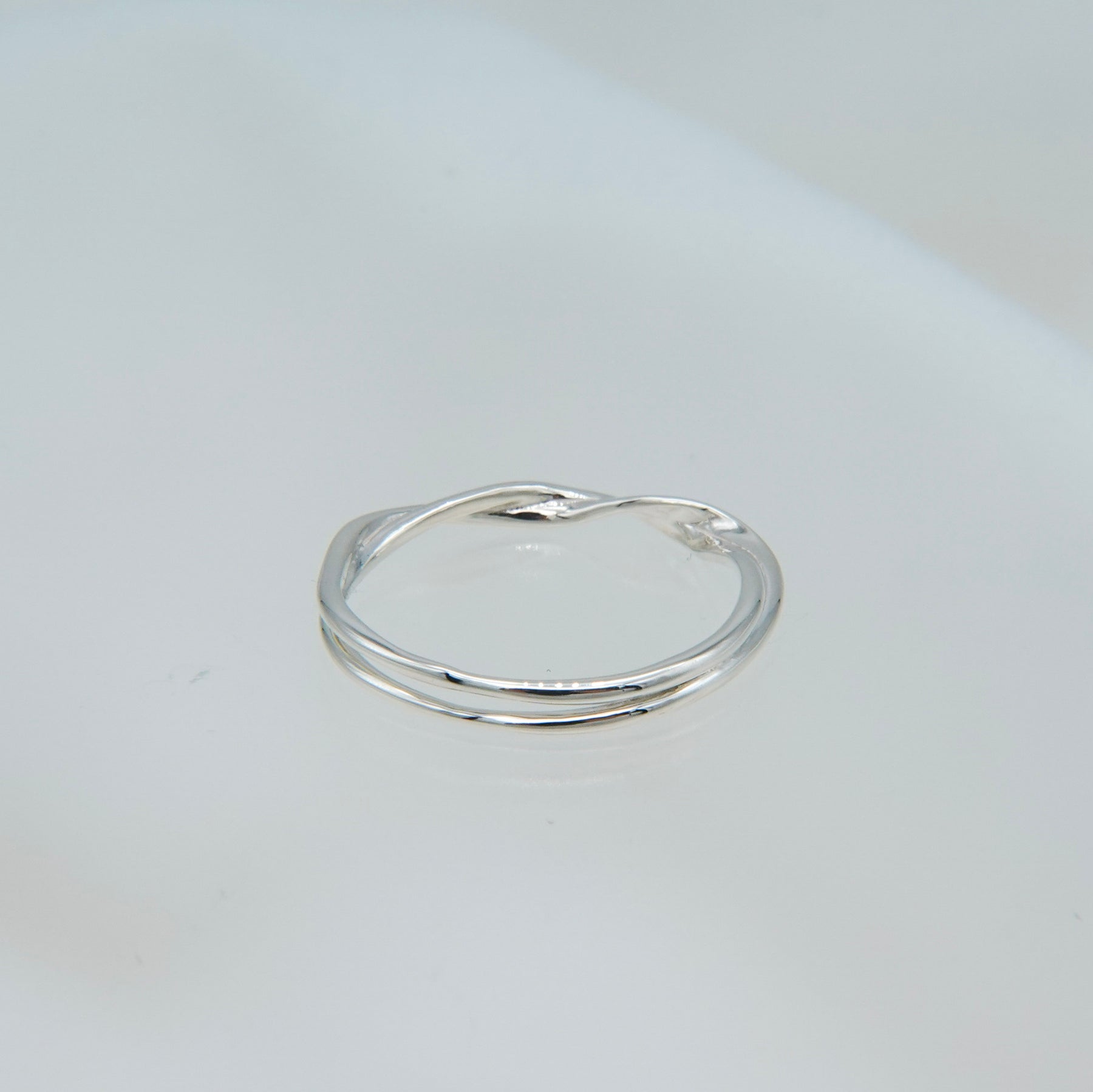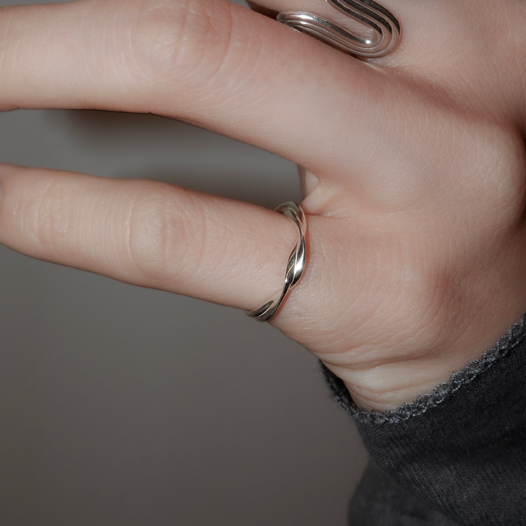 交差した二本の曲線がシンプルながらも、優しく個性を演出するデザイン。様々なコーディネートに組み込みやすく、ピンキーリングとしてもお勧めです。