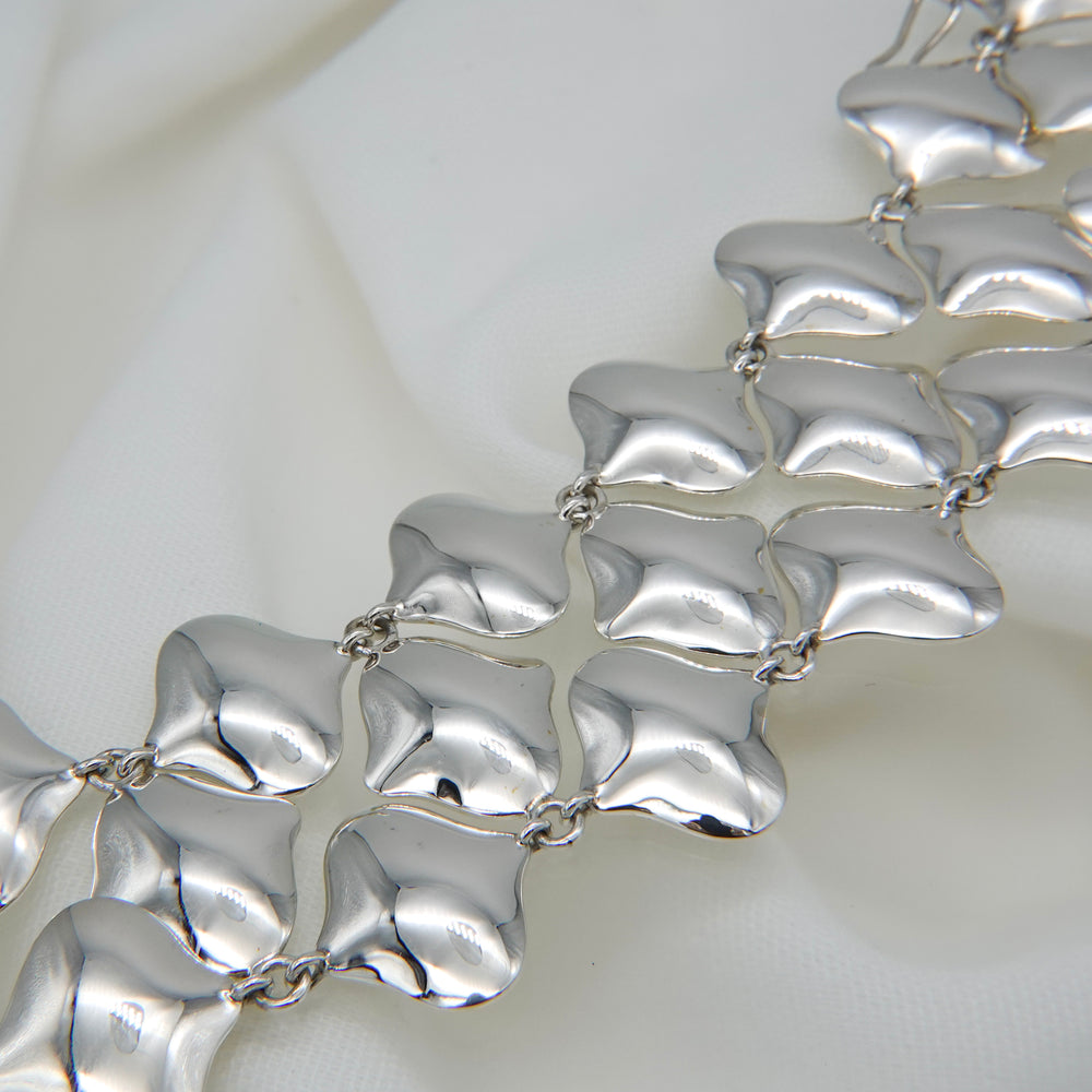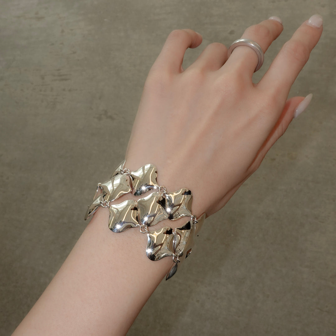 オブジェのようにボリュームのあるデザインが特徴だが、鋳造技法ではなく、デザイナー自身が銀の薄い板や銀線から加工・溶接しており、その大きさとは裏腹に軽やかな着け心地を実現している。