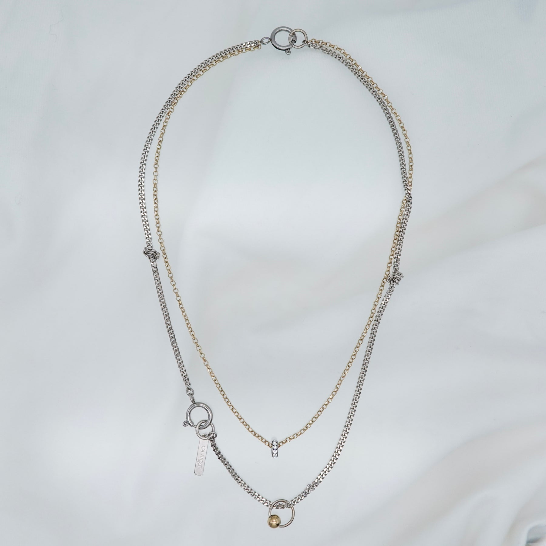異なるチェーンを重ねたレイヤードデザインが、首元に奥行きを生むネックレスです。