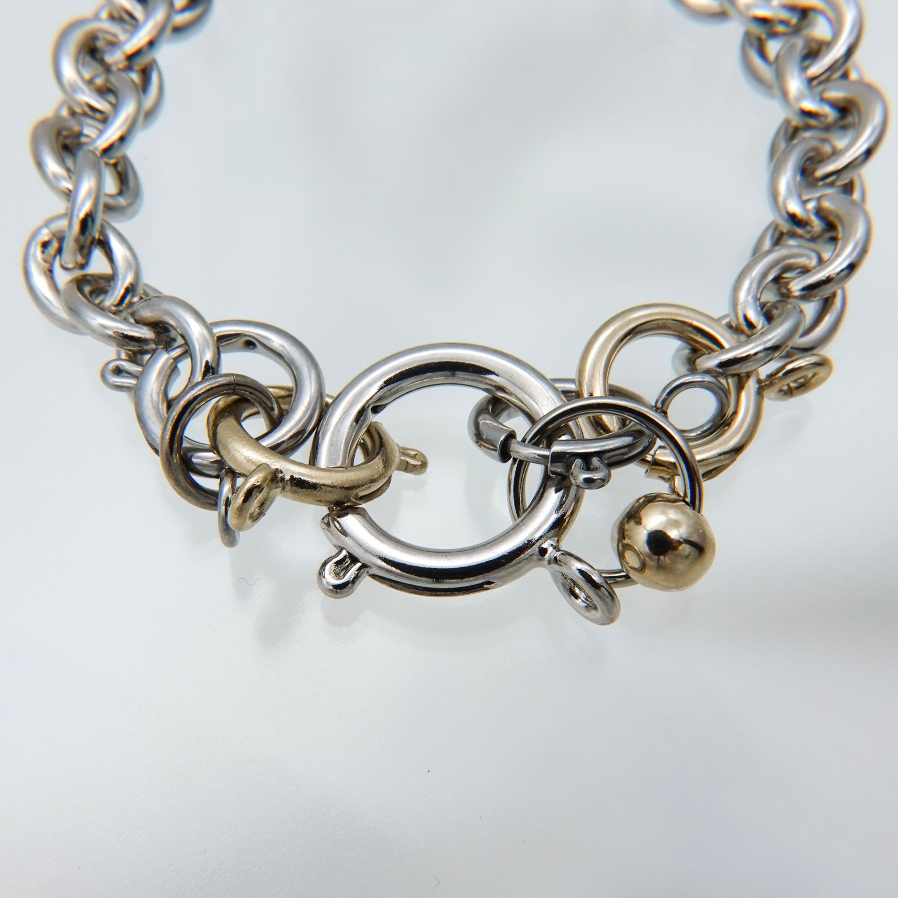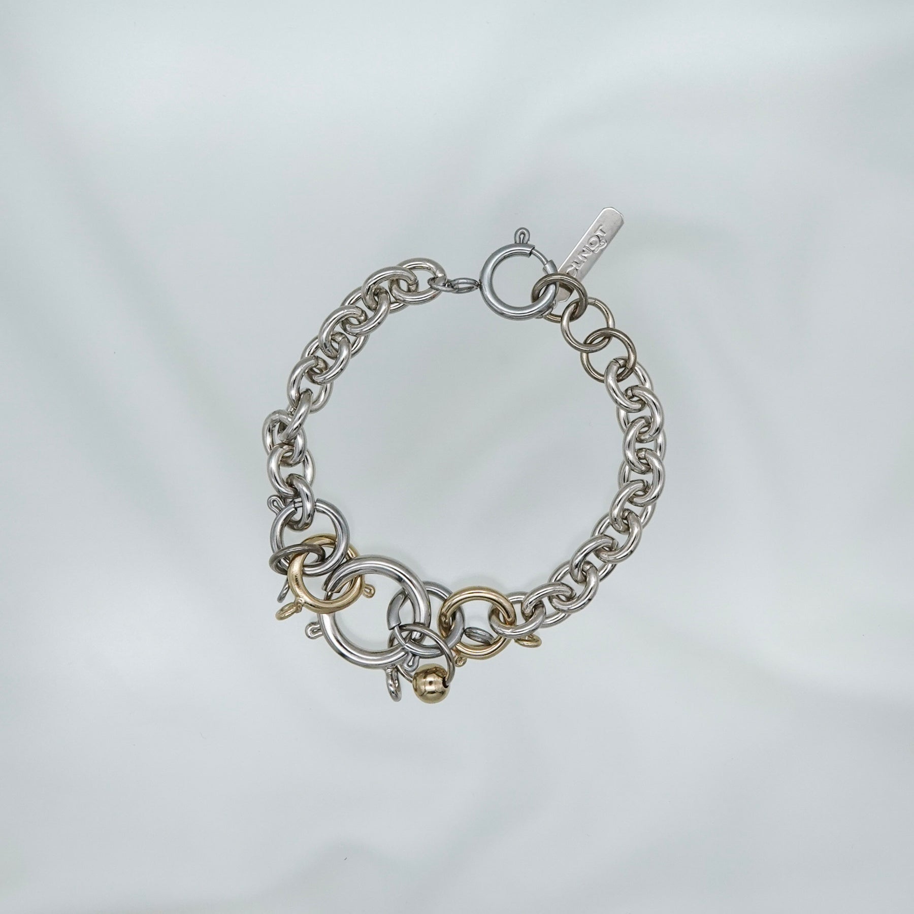 密度のあるリンクを連ねた、手元で適度なボリュームが出るブレスレットです。シルバーを基調に一部ゴールドパーツを組み合わせ、動きに応じて色のコントラストと光の反射に変化が生まれます。異なるサイズのリンクを連結した構造で、手元にさりげないリズムを加えます。