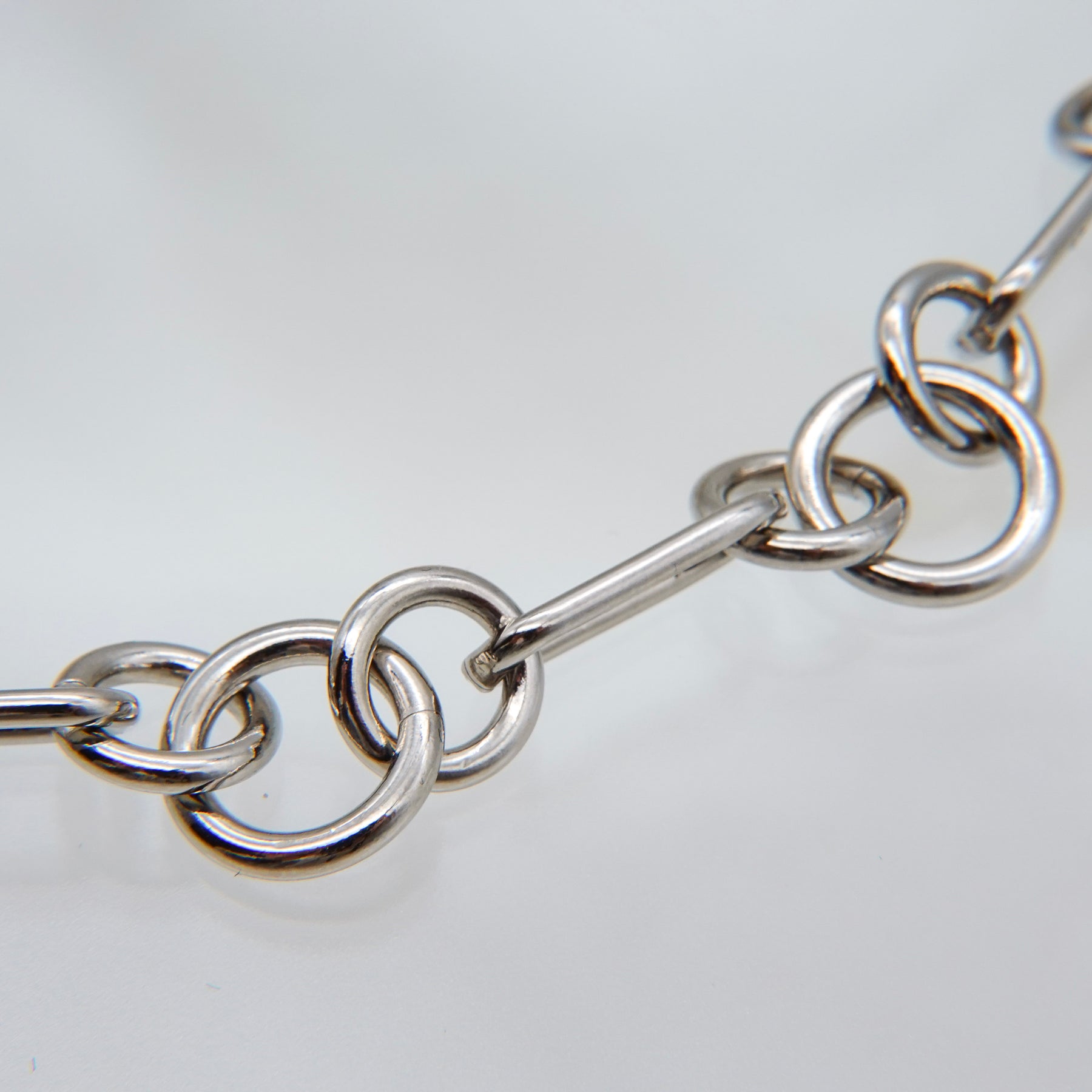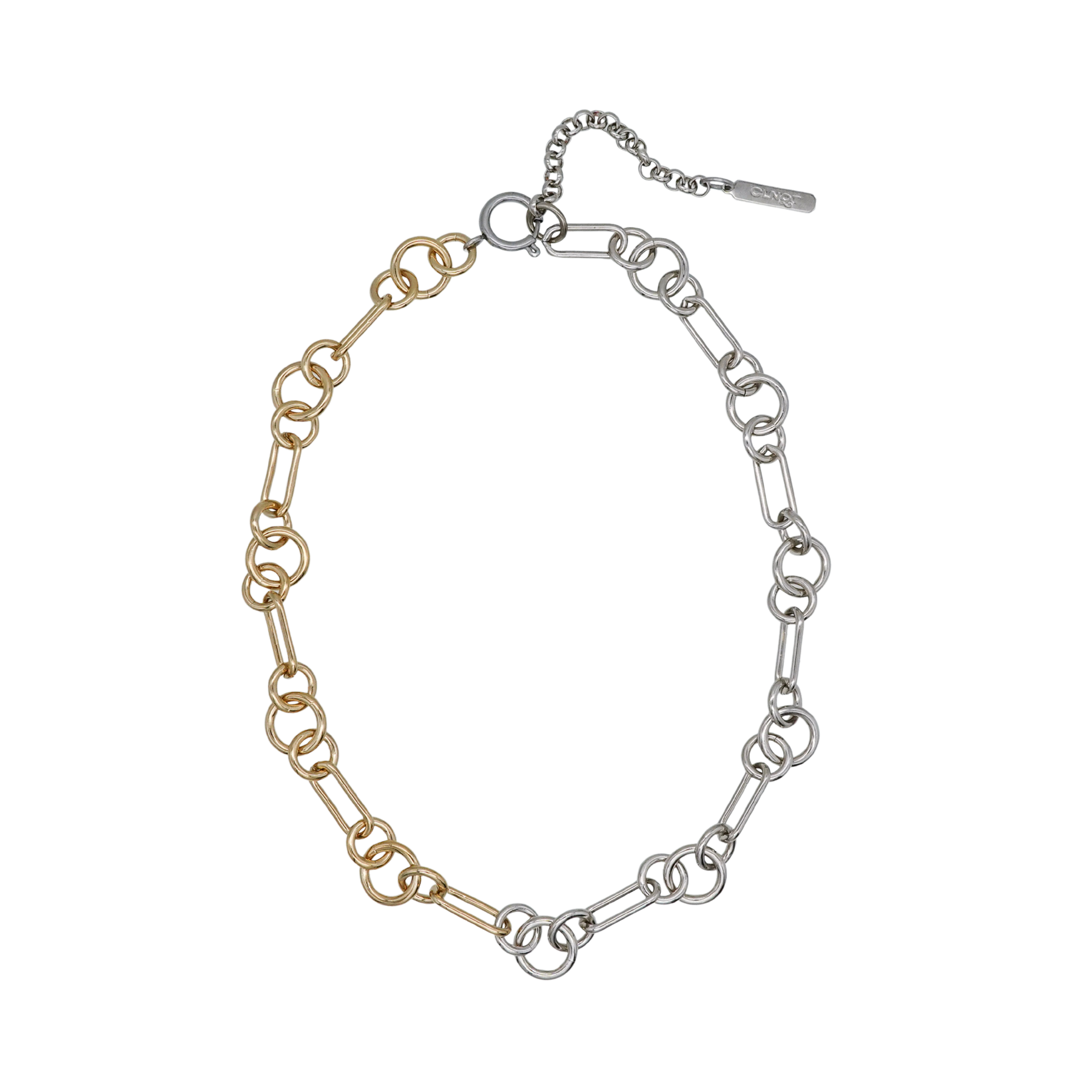 細かなリンクを連ねた、首元にすっきりと収まるボリュームのミックスカラーチョーカーです。シルバーとゴールドのパーツを組み合わせ、動きに応じて色のコントラストと光の反射に変化が生まれます。異なる形状のリンクを連結した構造で、さりげないリズムを加えます。