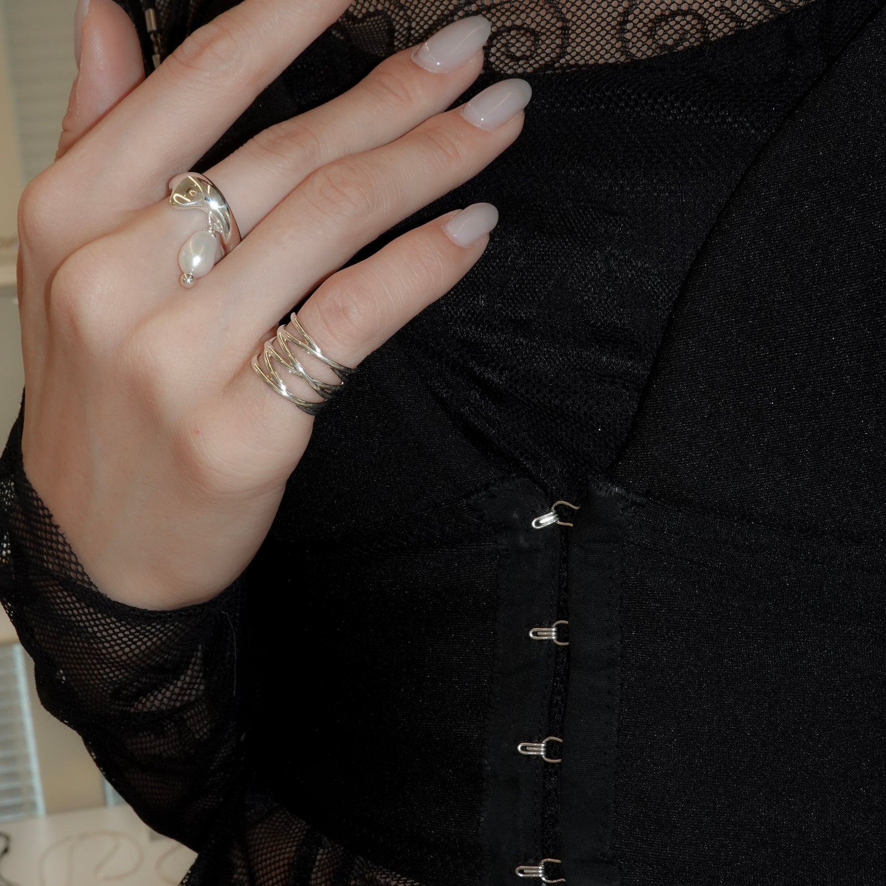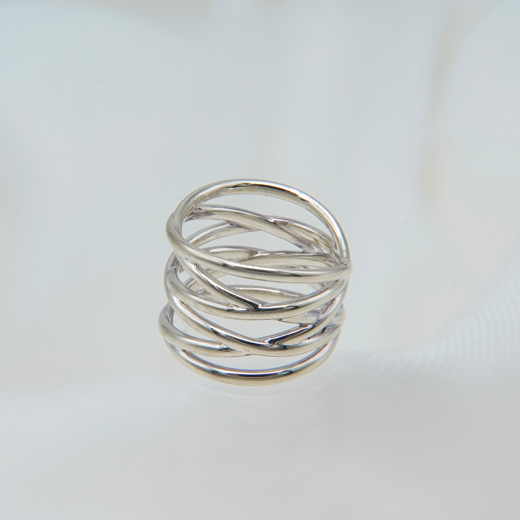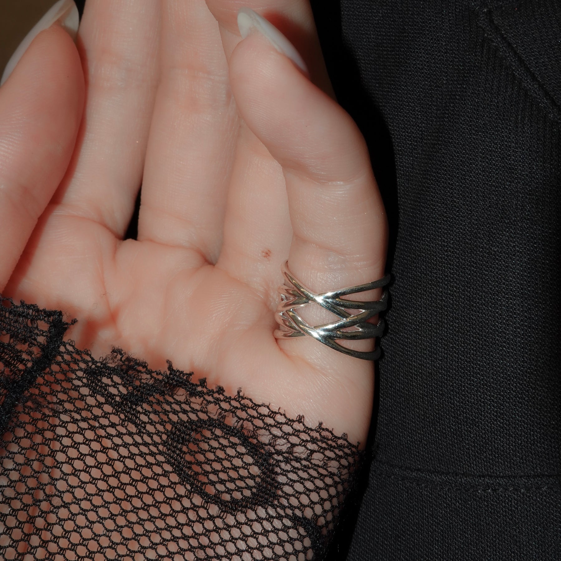 コルセットのレースアップを表現したファランジリング。指元を引き締めるように繊細に編み込まれたデザインは、コーディネートにも取り入れやすい仕上がり。幅広でスタイリッシュな存在感を放ちます。