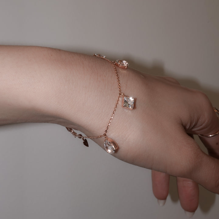 チェーンは繊細ながらもそれを取り巻く星屑のように、それぞれが主張して手首で華やかに輝きます。 長さ調節のできるアジャスターつき。