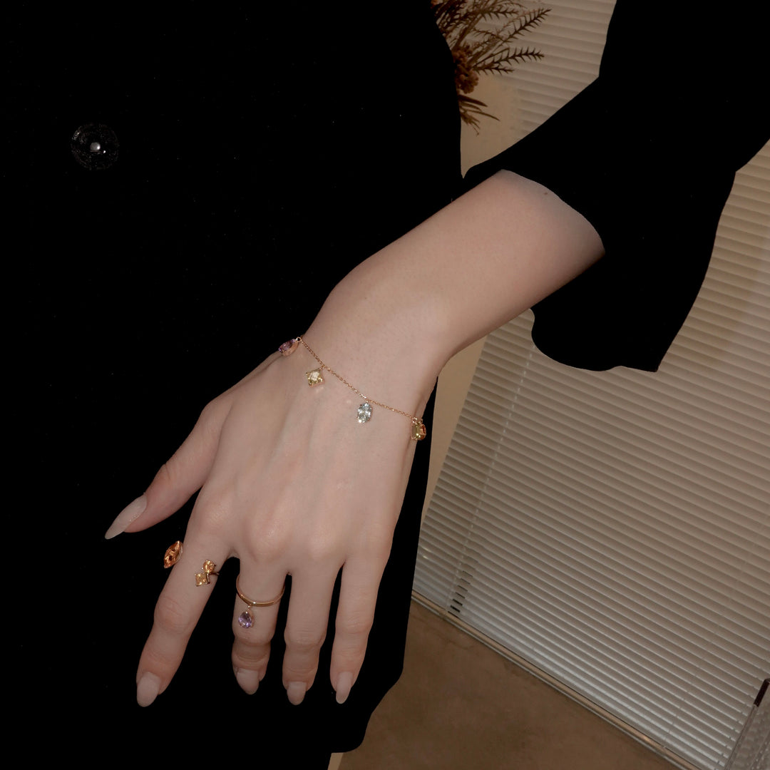 それぞれの石を星に見立て、等間隔に配置したブレスレット。 夜空に浮かぶ星のように決して均一ではなく、個々に個性を放っている様子をイメージし、様々なカラー、様々な形の石をセレクト。 チェーンは繊細ながらもそれを取り巻く星屑のように、それぞれが主張して手首で華やかに輝きます。 長さ調節のできるアジャスターつき。