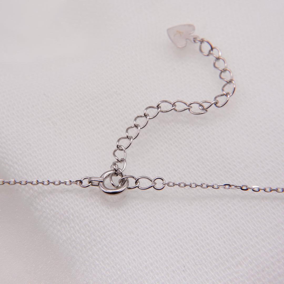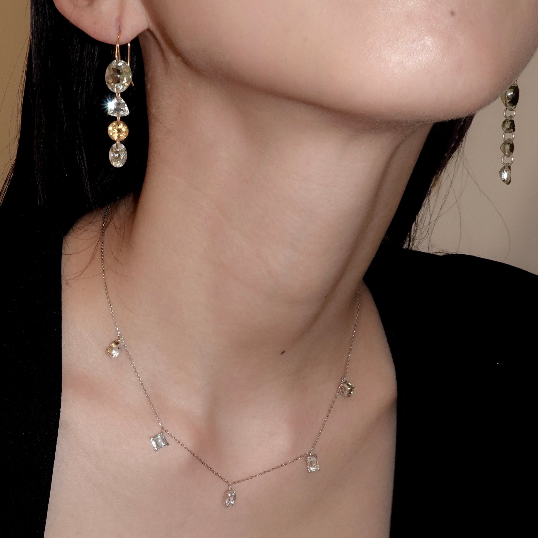 チェーンは繊細ながらもそれを取り巻く星屑のように、それぞれが主張して首元で華やかに輝きます。