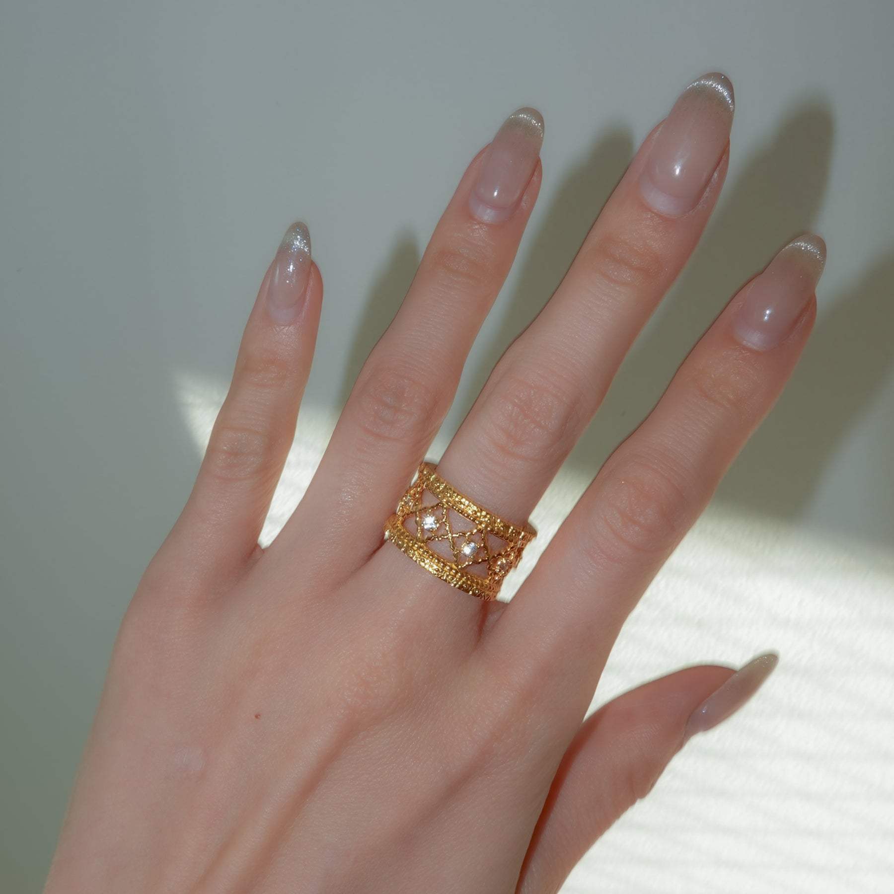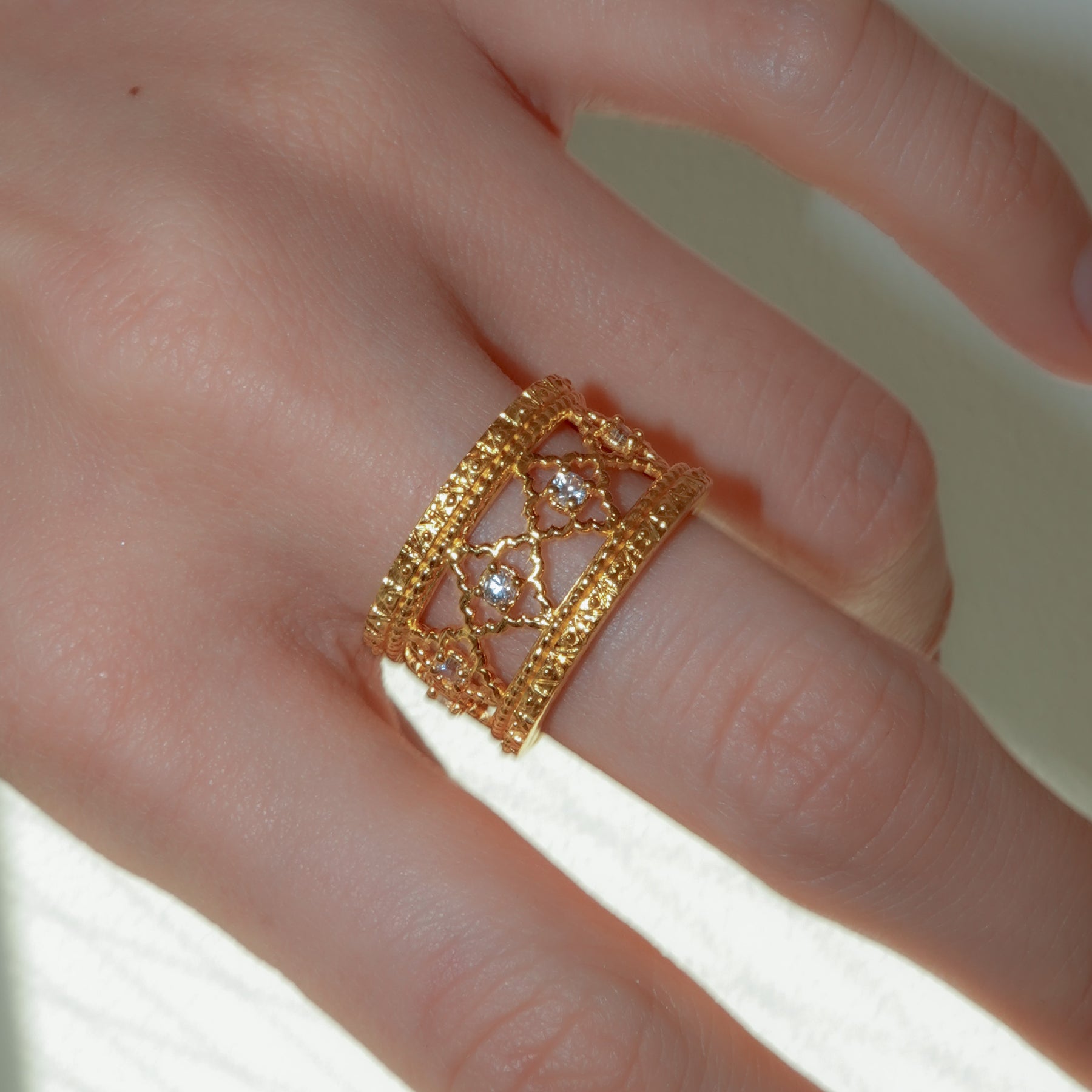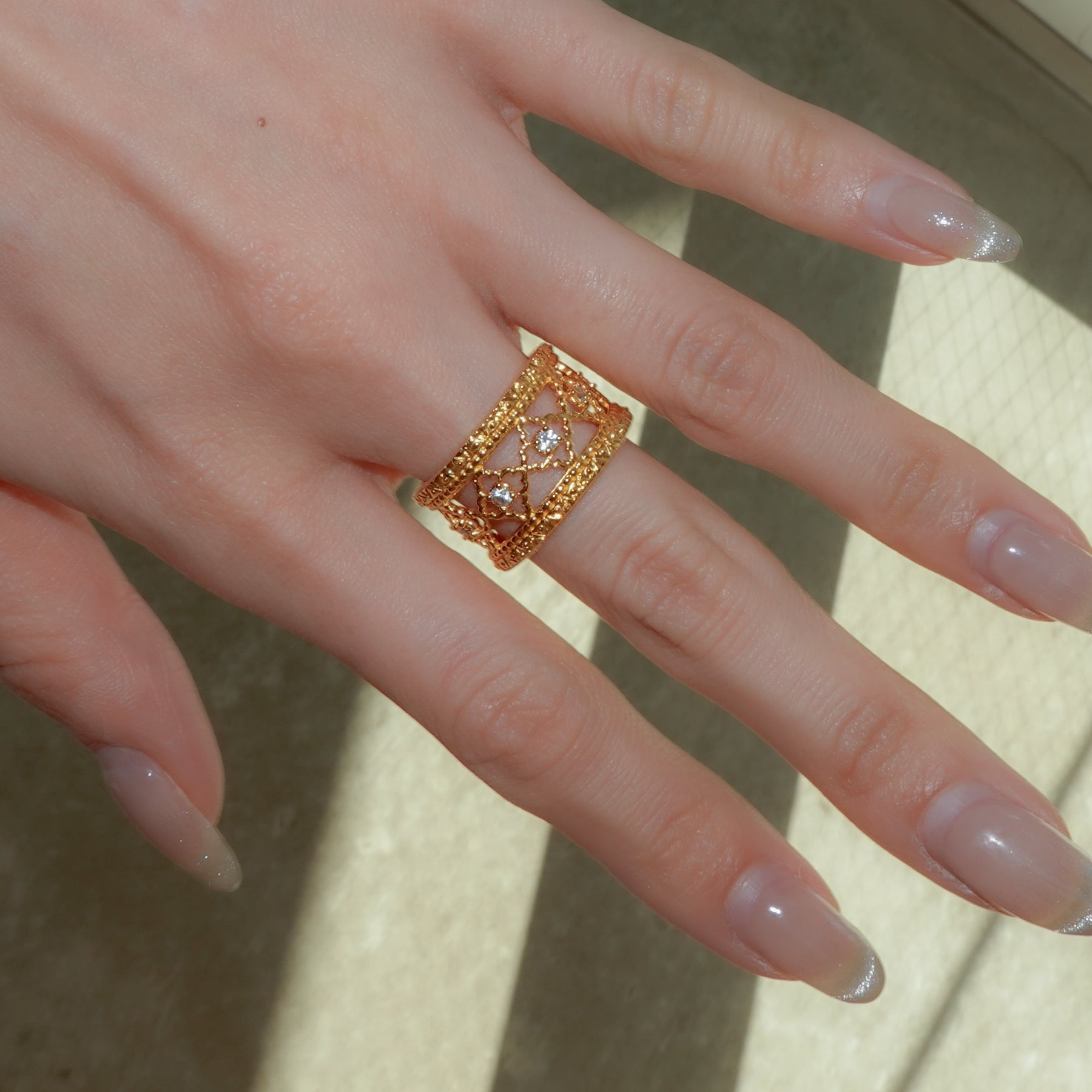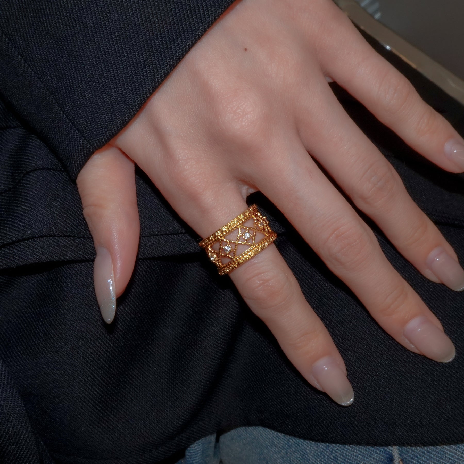 サイドには繊細なシルクライン彫りを、表面にも一点一点タガネを入れ細部までこだわって仕上げたフィレンツェ彫りのリング。