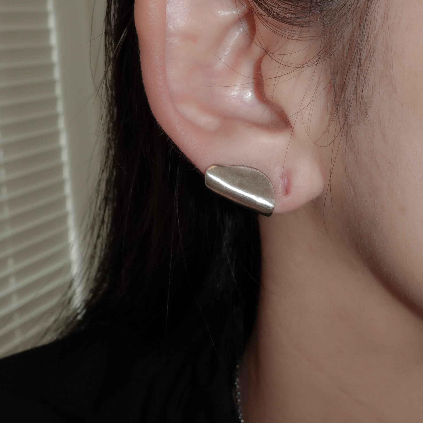 耳のふちにカールした部分が引っかかり、耳の一部が金属になったように見えるデザイン。