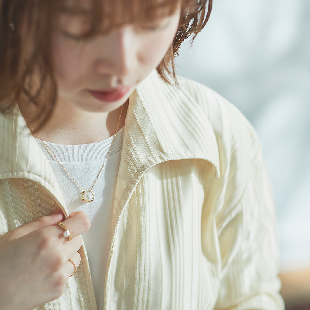 シンプルでしなやかなゴールドのラインの美しさと品のあるアコヤパールの組み合わせ。